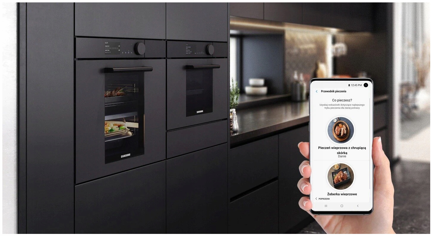 Dzięki jednej aplikacji SmartThings* na swoim smartfonie lub tablecie możesz komfortowo zarządzać urządzeniami Infinite Line™ i pozostałymi sprzętami Samsung w swojej kuchni. Wystarczy, że będą połączone z domową siecią Wi-Fi, a Ty będziesz mógł m.in. zdalnie włączyć lub wyłączyć piekarnik, zmienić temperaturę i czas pieczenia czy przeglądać przepisy z Auto Menu i przesłać je bezpośrednio z telefonu do piekarnika. Niezależnie od tego, czy jesteś w pokoju obok, czy na drugim końcu miasta, masz dostęp do kuchni bez granic.