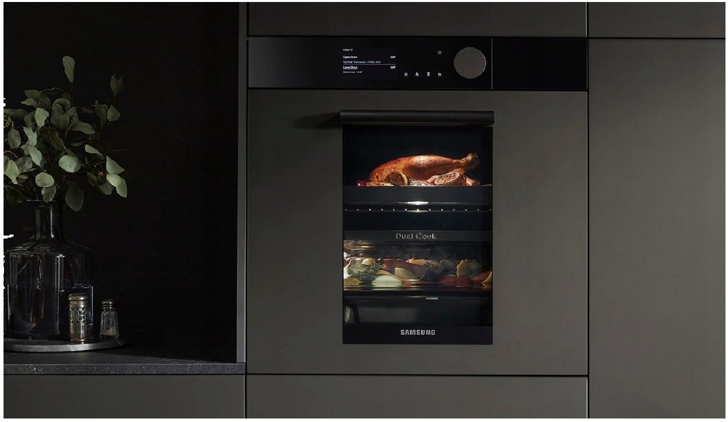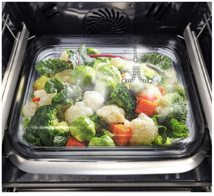 Dual Cook Steam Assist pozwala na pieczenie wspomagane parą. Oznacza to, że podczas pieczenia z termoobiegiem, jest ona dodawana, dzięki czemu ciepło i optymalna wilgotność są równomiernie rozprowadzone wewnątrz piekarnika. Złocista i chrupiąca skórka w puszystym chlebie, czy w soczystej pieczeni, to właśnie idealny efekt pieczenia z dodatkiem pary.