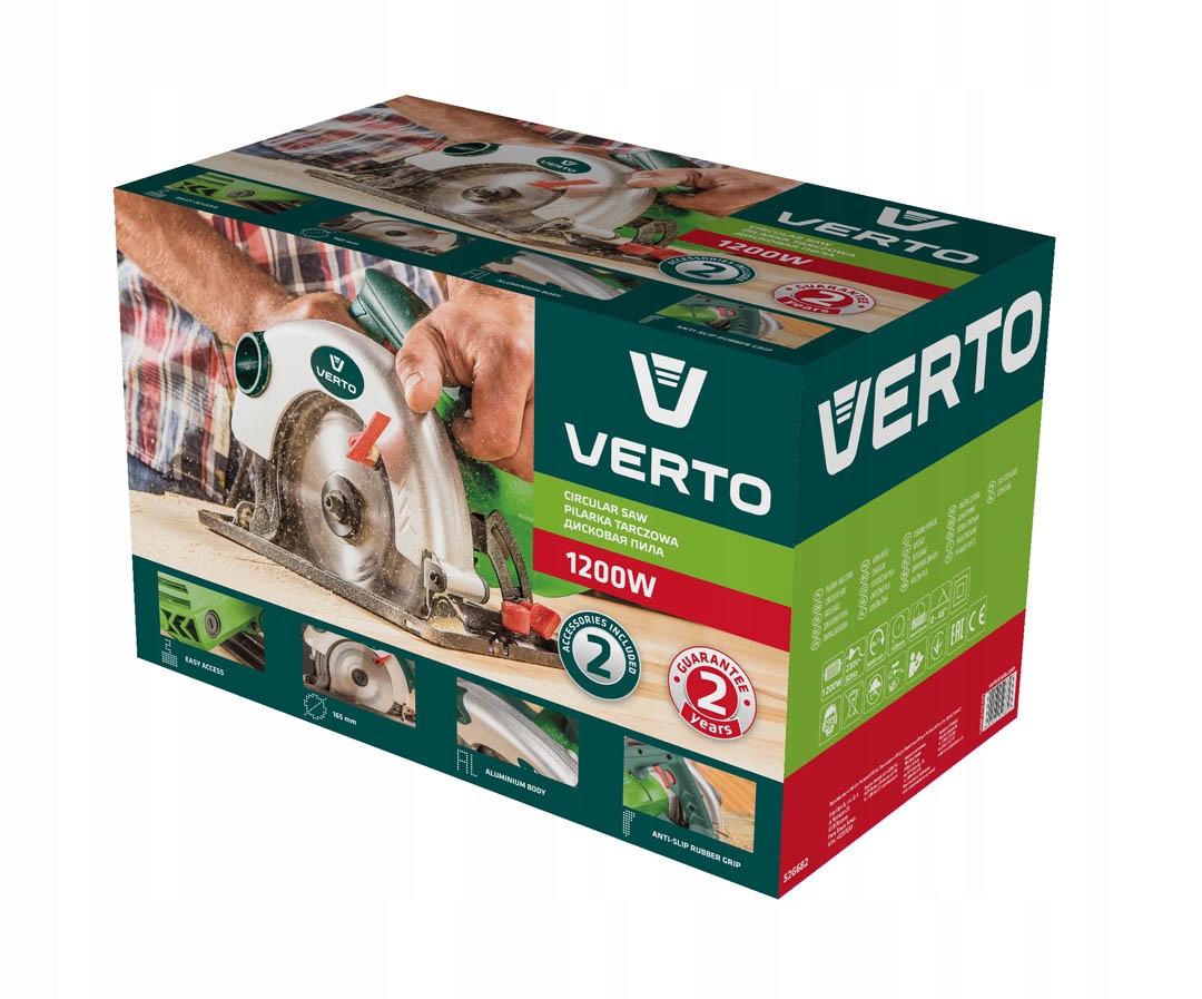 Pilarka tarczowa 1200 W VERTO (nr ref. 52G682) to urządzenie przeznaczone do cięcia między innymi elementów drewnianych, płyt wiórowych. Posiada silnik o mocy 1200 W oraz możliwość regulacji głębokości i kąta cięcia w zakresie od 0° do 45°. Pilarka posiada blokadę przypadkowego włączenia, co wydatnie podnosi bezpieczeństwo pracy. Współpracuje z tarczami tnącymi o średnicy 165 mm. Konstrukcja pilarki umożliwia samodzielną wymianę szczotek węglowych. Dostarczana z prowadnicą równoległą, kluczem regulacyjnym oraz tarczą do cięcia. Zgodność z europejskimi standardami bezpieczeństwa zapewnia certyfikat CE. Marka VERTO oferuje asortyment elektronarzędzi i akcesoriów dla każdego majsterkowicza.