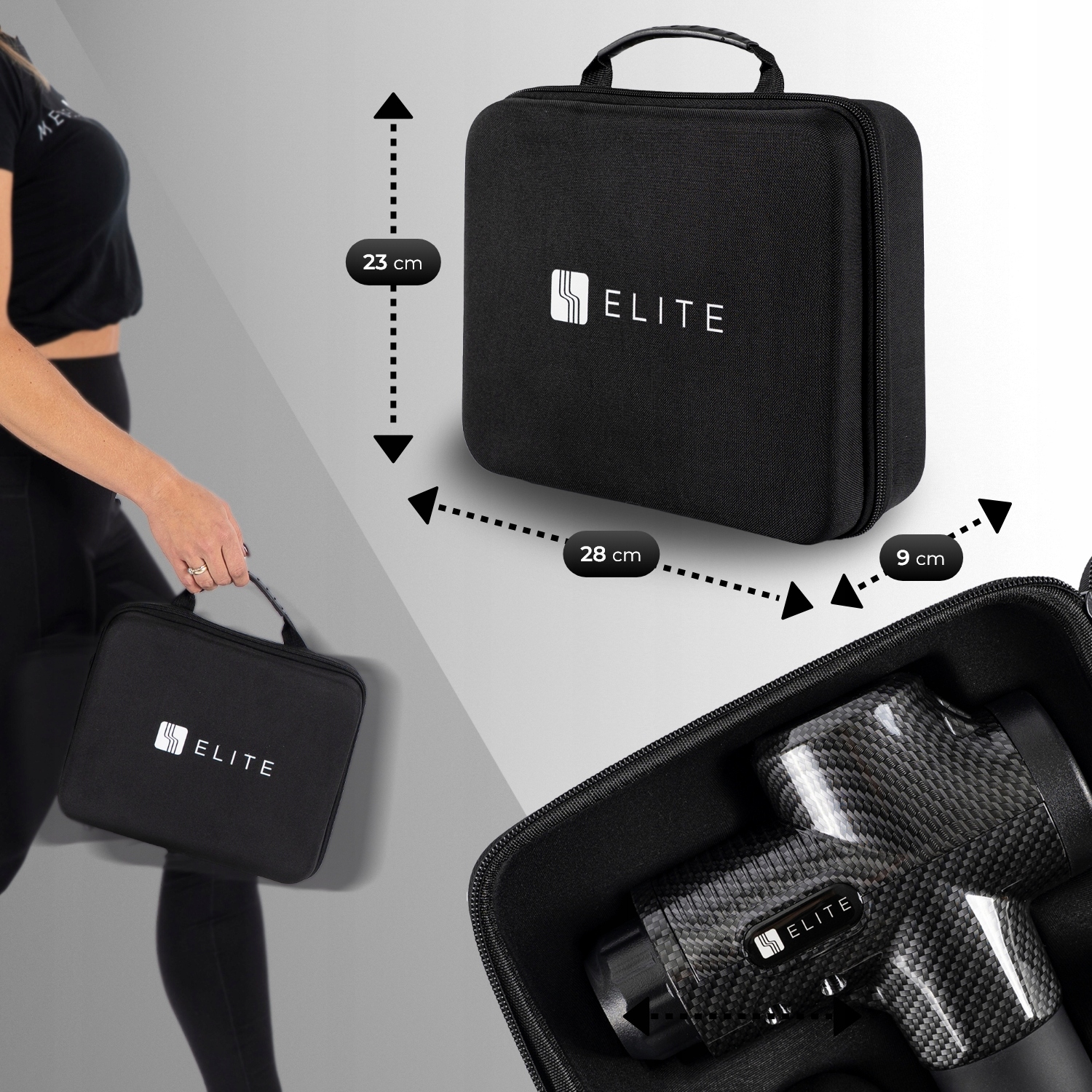 Teraz możesz zabrać swój masażer ELITE ME-MG09 wszędzie tam, gdzie chcesz! Dzięki solidnemu futerałowi dołączonemu do zestawu urządzenie oraz wszystkie akcesoria są bezpiecznie przechowywane i zawsze pod ręką. Kompaktowe wymiary – wysokość 23 cm, szerokość 28 cm, głębokość 9 cm – sprawiają, że etui bez problemu zmieści się w torbie treningowej, plecaku lub walizce.