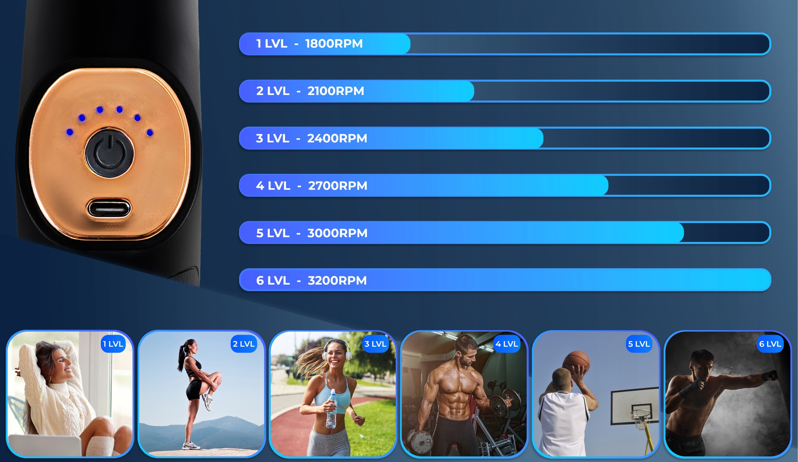 6-stopniowa regulacja prędkości – łatwo dopasujesz intensywność masażu do swoich potrzeb, od delikatnego rozluźnienia po mocniejszą regenerację.
