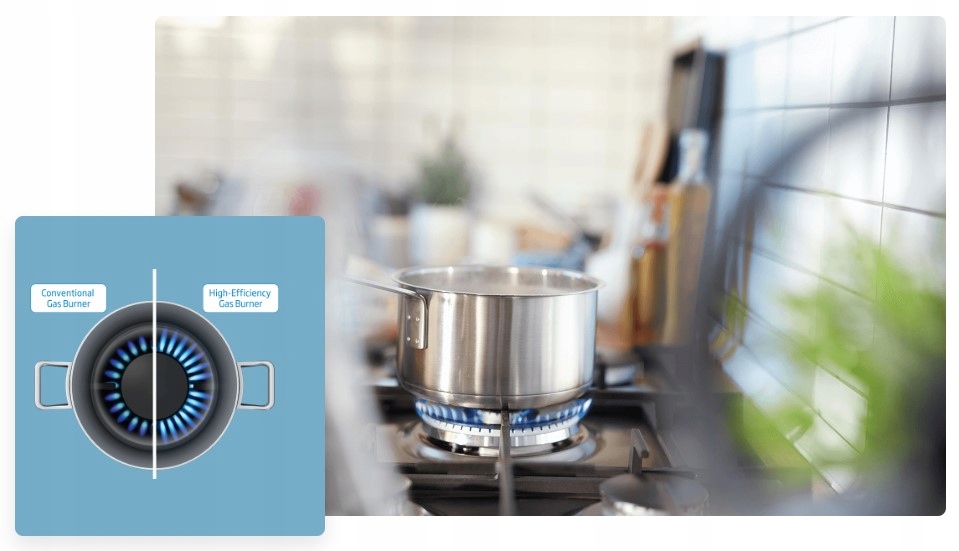 Nie pozwól, aby pracowity dzień pozbawił Cię zdrowego posiłku. Teraz na płycie grzejnej możesz ugotować każdy posiłek szybciej i wydajniej. Palniki gazowe o wysokiej wydajności zużywają mniej gazu i umożliwiają szybsze gotowanie niż standardowe palniki. Dzięki temu ulubione dania możesz szybko podać na stół nawet w krótkim czasie.
