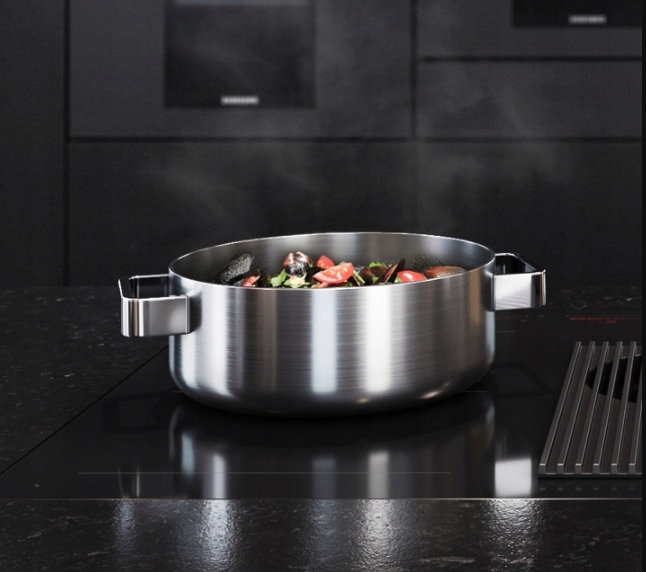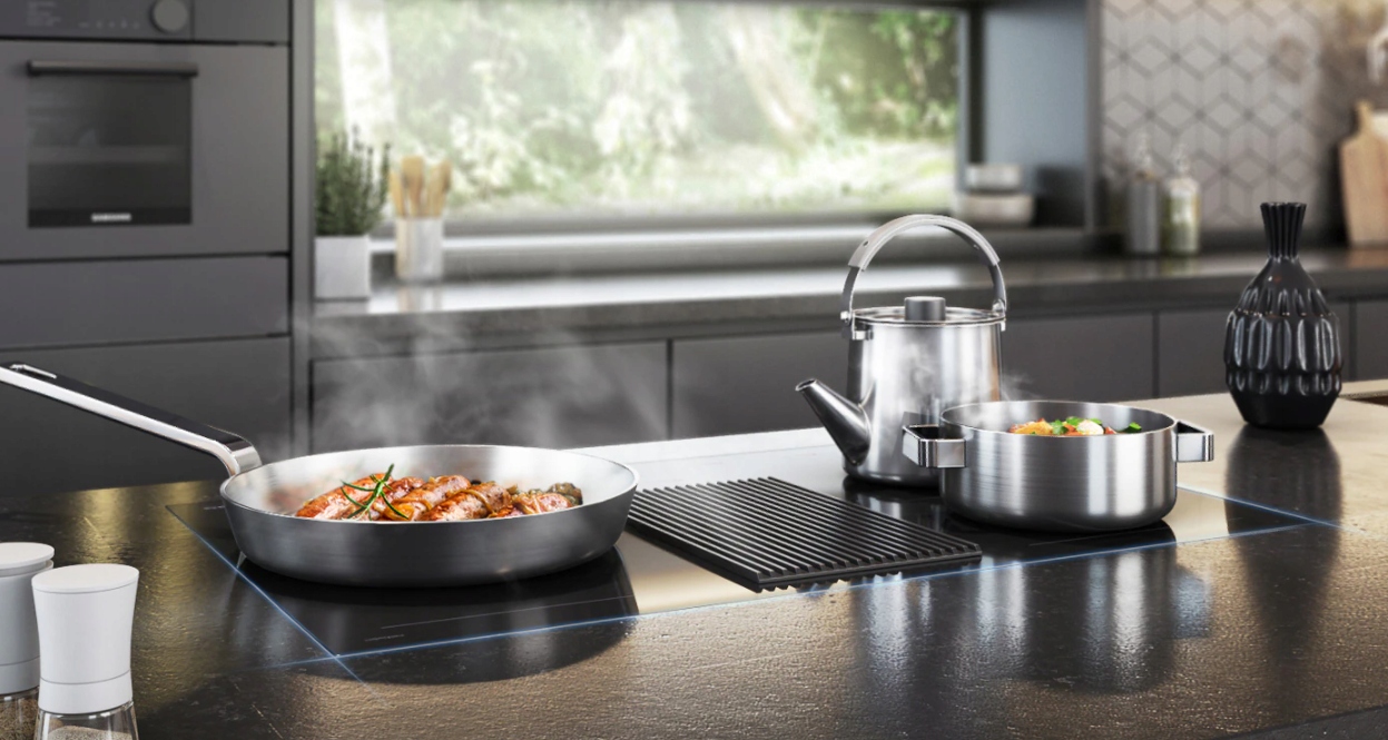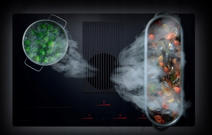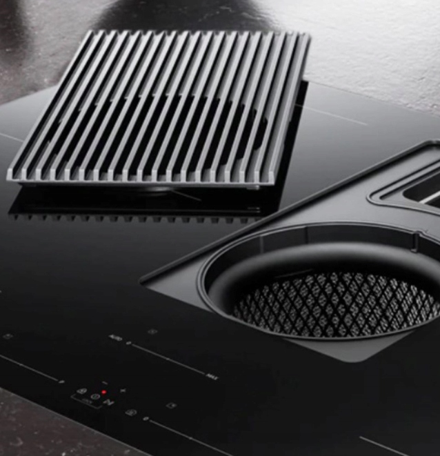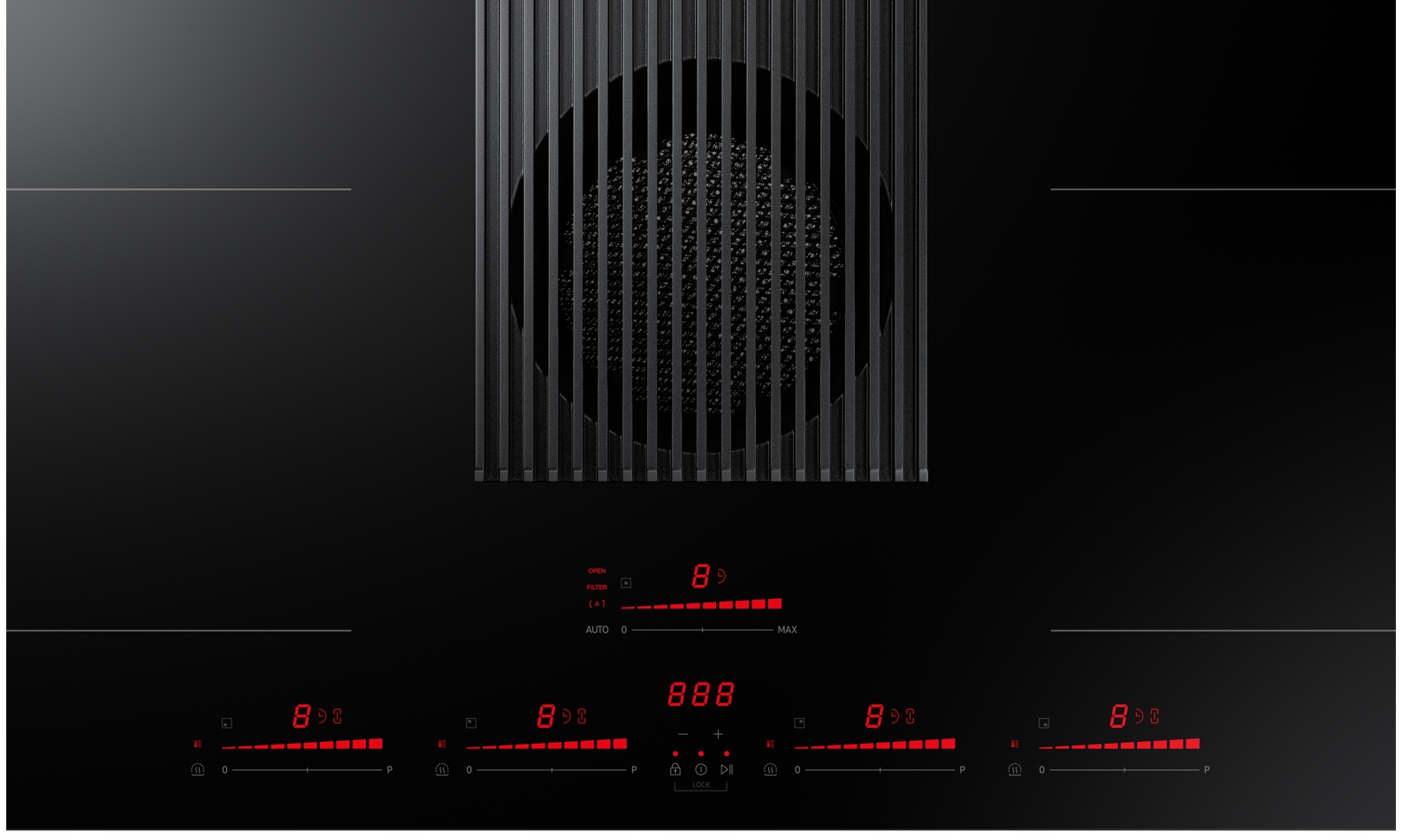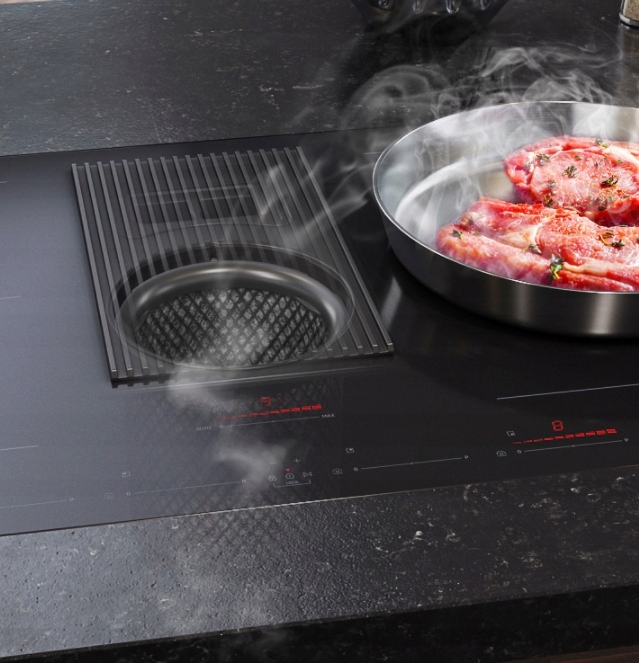 Teraz możesz zainstalować płytę grzewczą w dowolnym miejscu, a dzięki zintegrowanemu wyciągowi zlokalizowanemu na środku płyty natychmiast pozbywać się nieprzyjemnych zapachów i oparów. Wydajność wyciągu wynosi 575 m³/h. Płyta sprawdzi się zarówno w tradycyjnej zabudowie jak i w przypadku wyspy kuchennej.