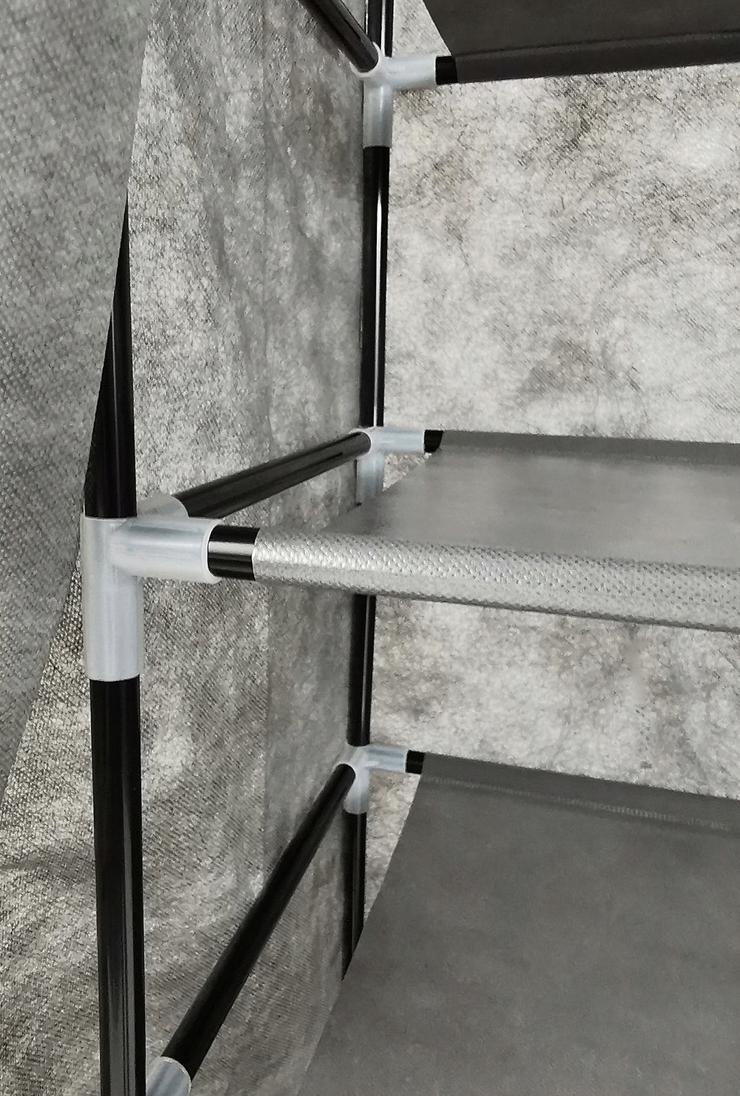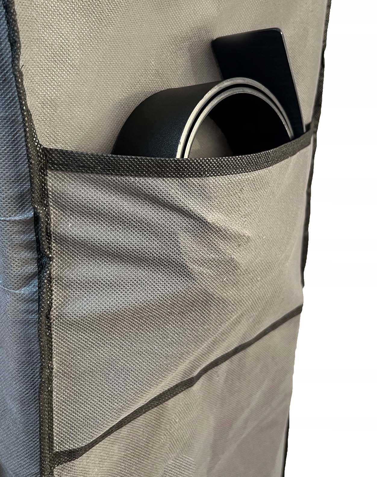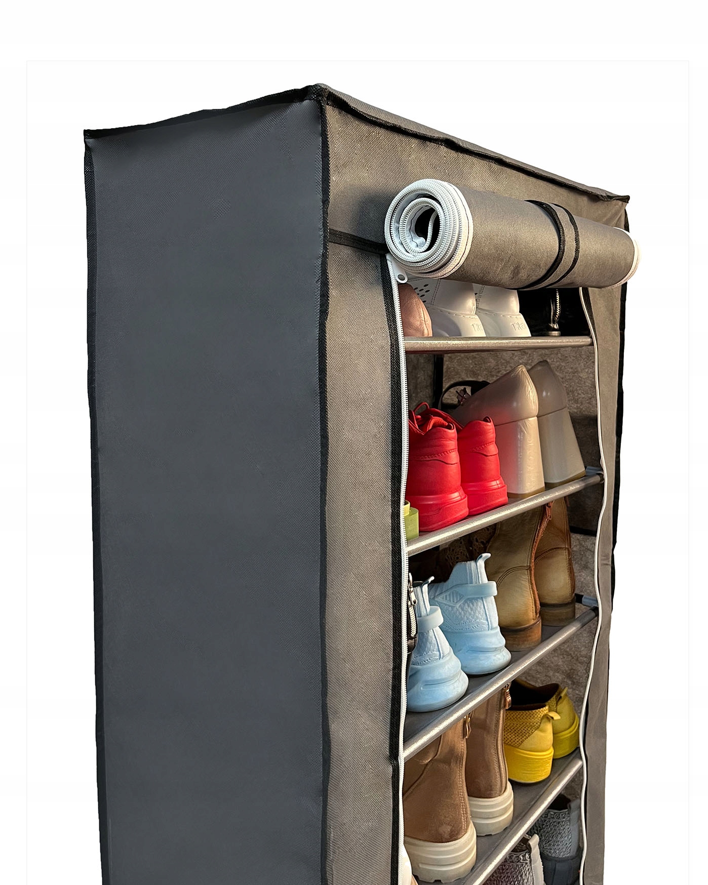 Zasłona drzwiowa wyposażona w rzepy i zamek błyskawiczny skutecznie zabezpiecza zawartość przed kurzem i zabrudzeniem. . Szafa tekstylna prezentuje się stylowo i pasuje do różnych pomieszczeń, takich jak sypialnia, korytarz czy garderoba.