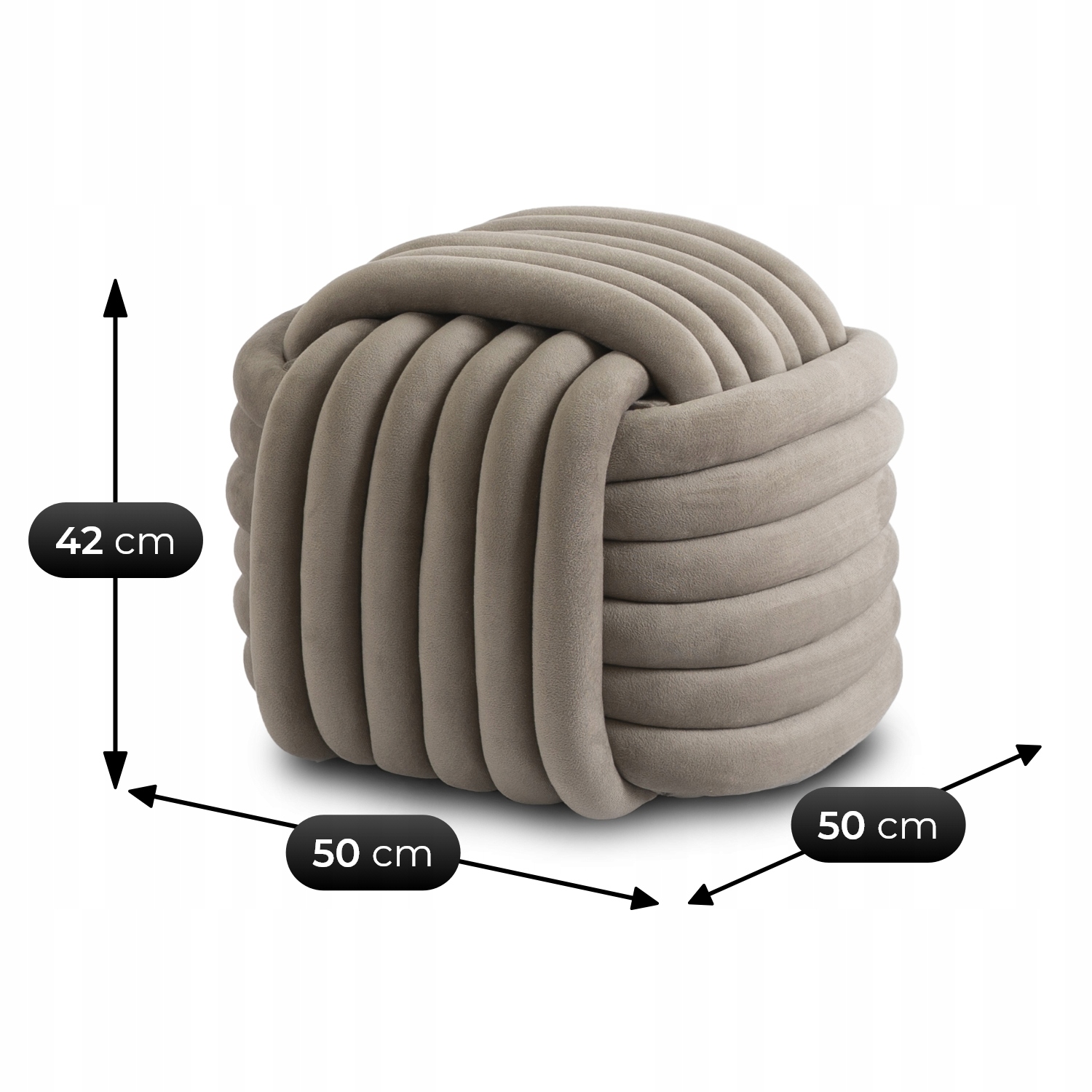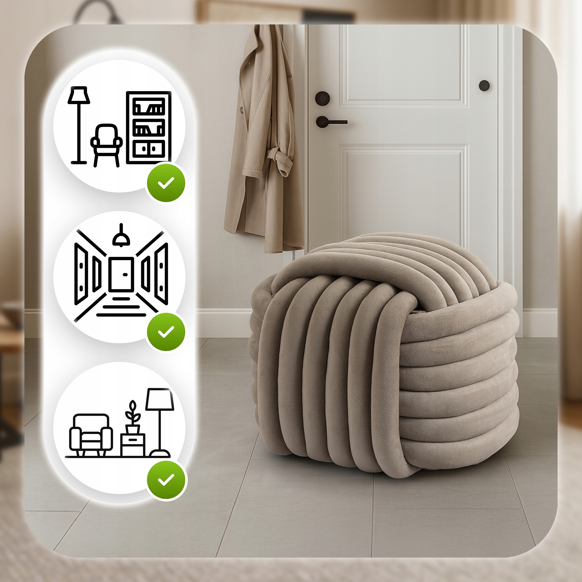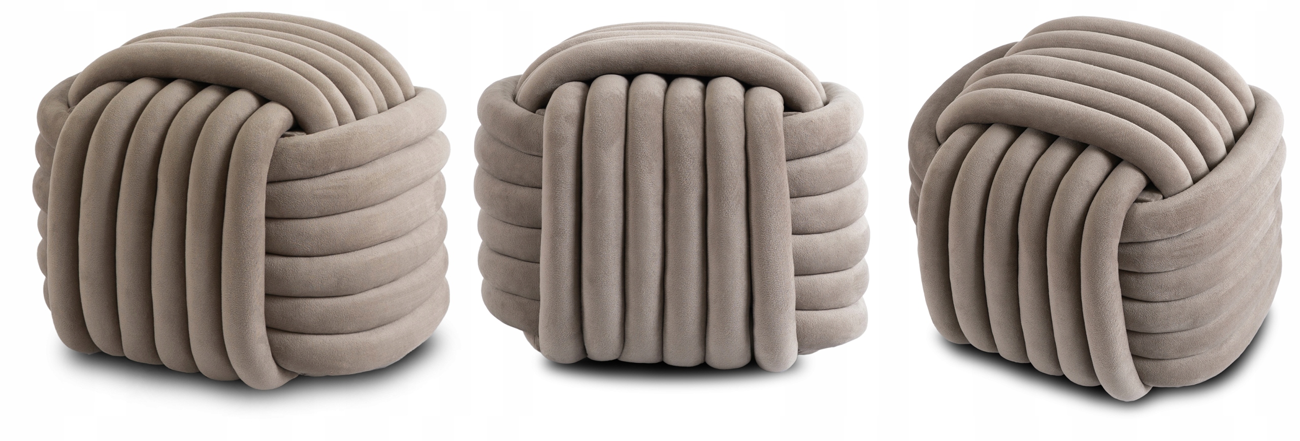 - Dla miłośników designu i nowoczesnych wnętrz – unikalny, pleciony kształt oraz elegancka welurowa tkanina w kolorze beżowym świetnie komponują się z aranżacjami w stylu modern, scandi czy minimalistycznym.