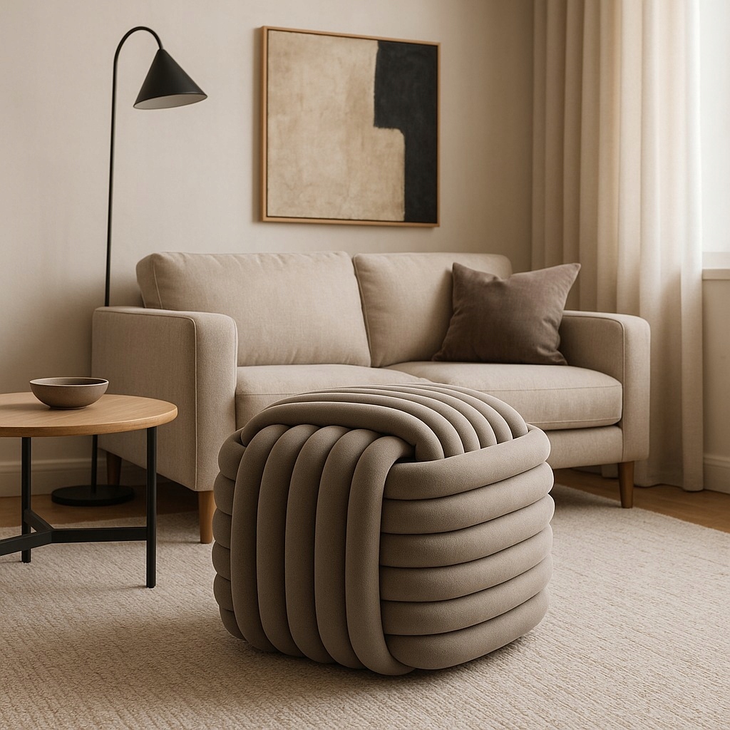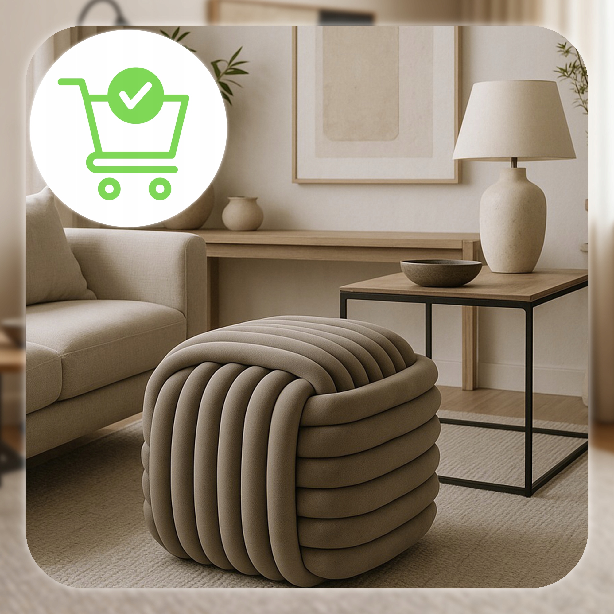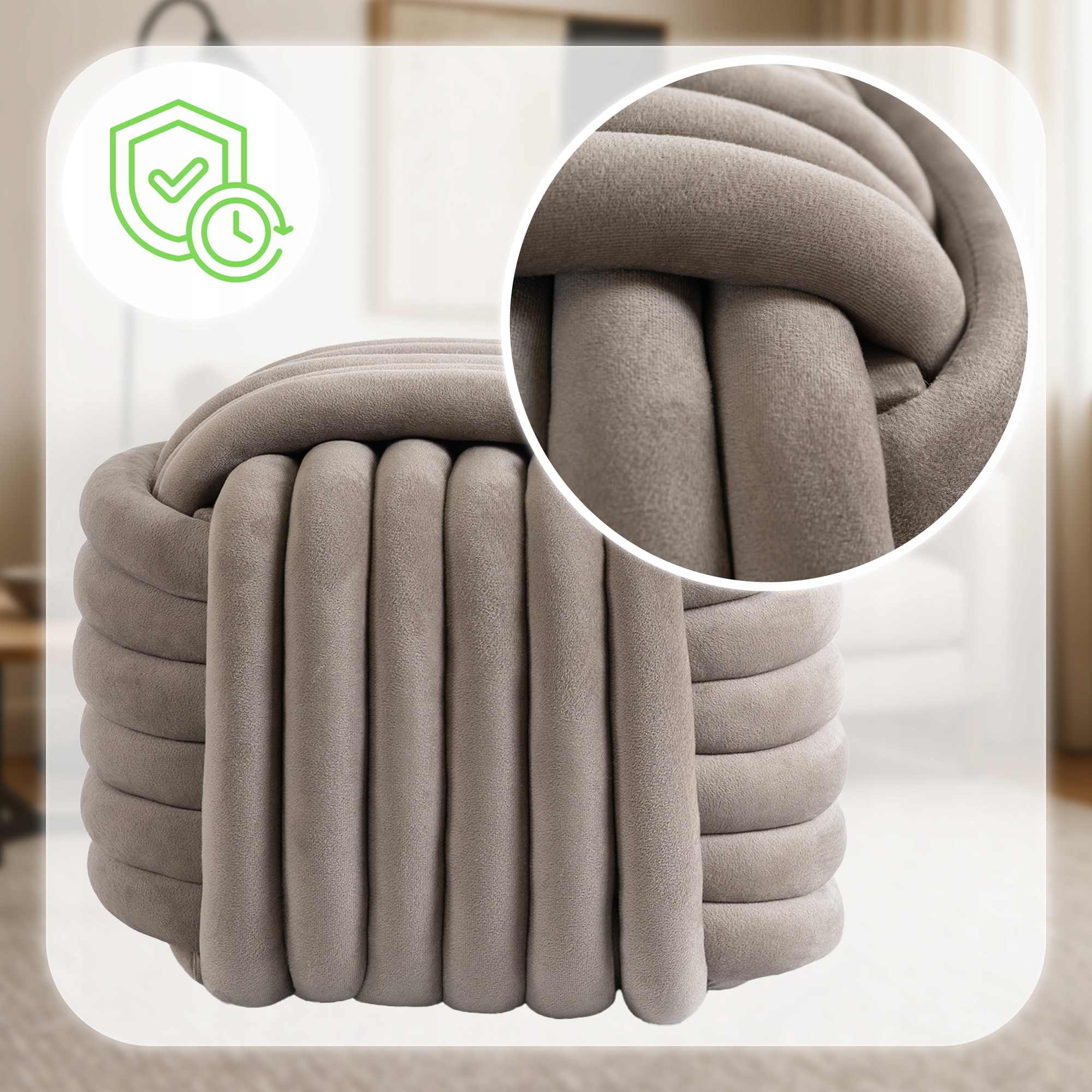 - Dla miłośników designu i nowoczesnych wnętrz – unikalny, pleciony kształt oraz elegancka welurowa tkanina w kolorze beżowym świetnie komponują się z aranżacjami w stylu modern, scandi czy minimalistycznym.