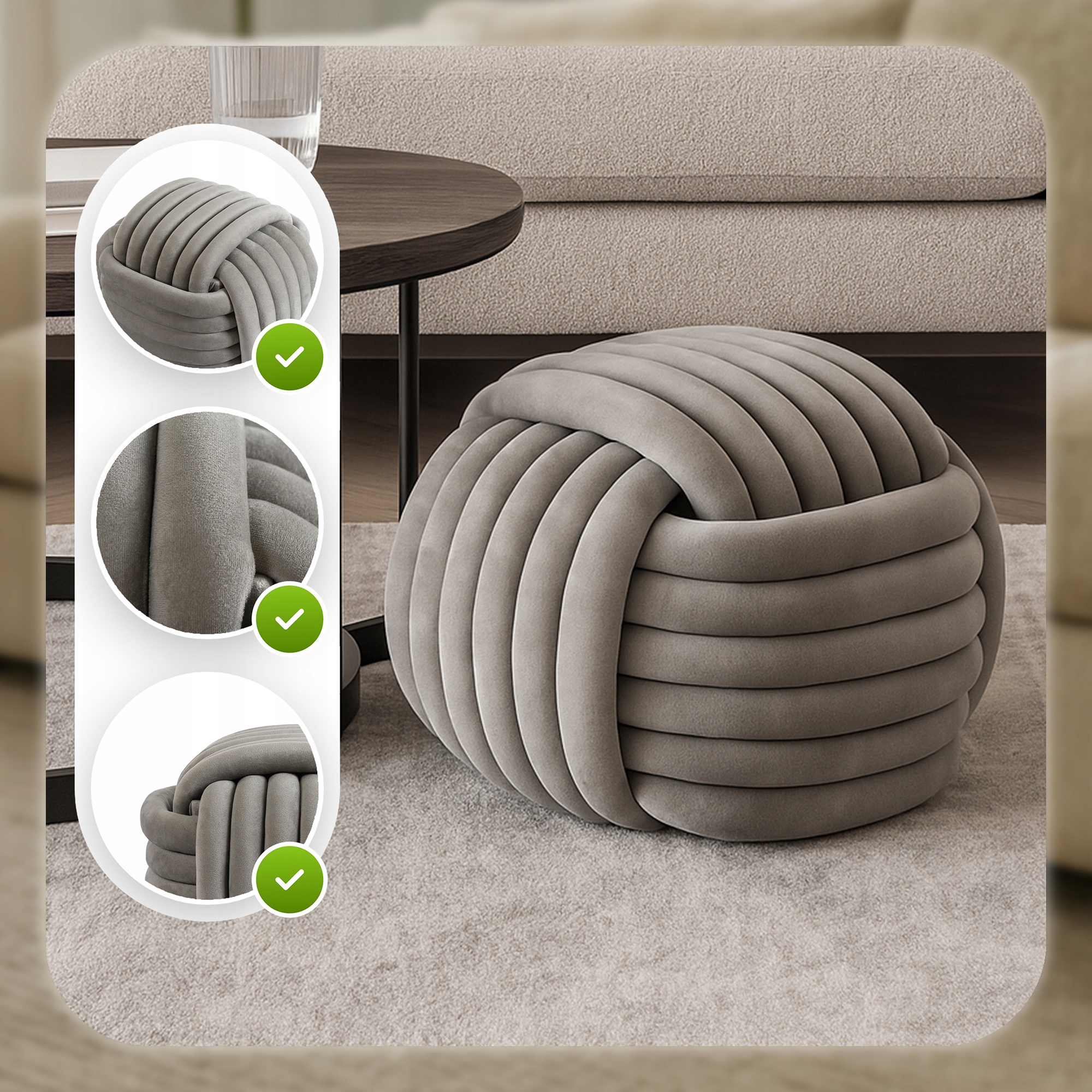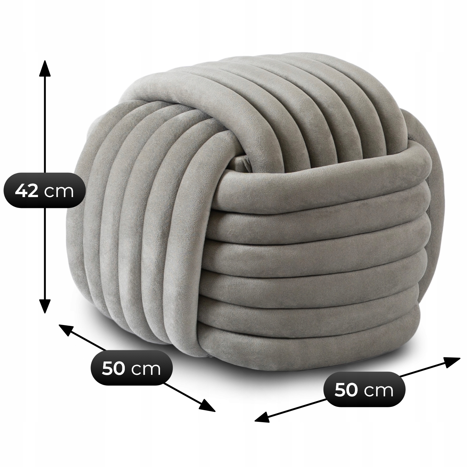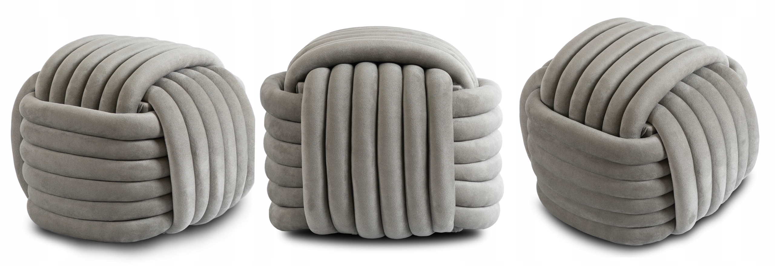 - Dla miłośników designu i nowoczesnych wnętrz – unikalny, pleciony kształt oraz elegancka welurowa tkanina w kolorze szarym świetnie komponują się z aranżacjami w stylu modern, scandi czy minimalistycznym.