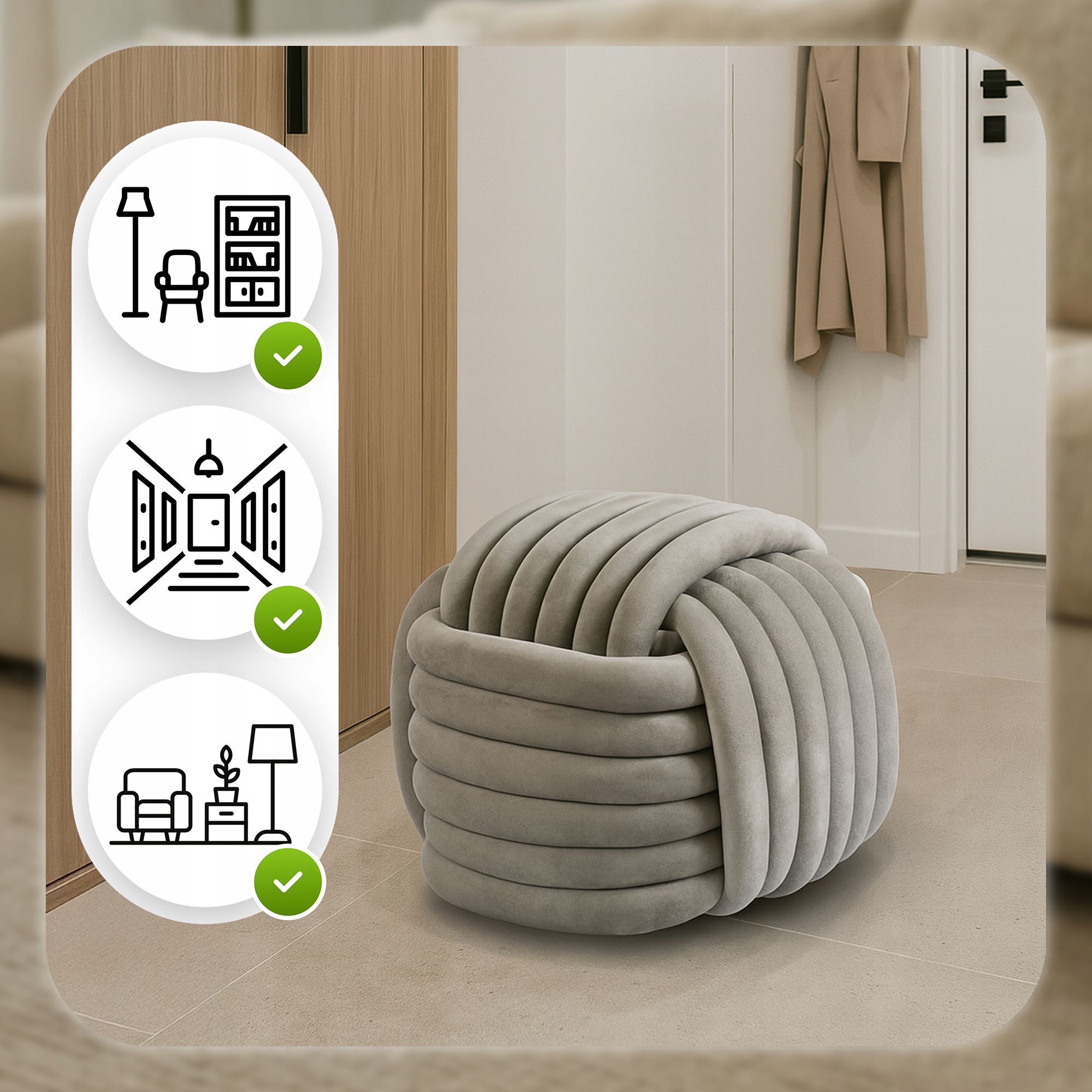 - Wielofunkcyjne zastosowanie – wygodne siedzisko, podnóżek lub dodatkowy element dekoracyjny, który dopełni aranżację wnętrza.