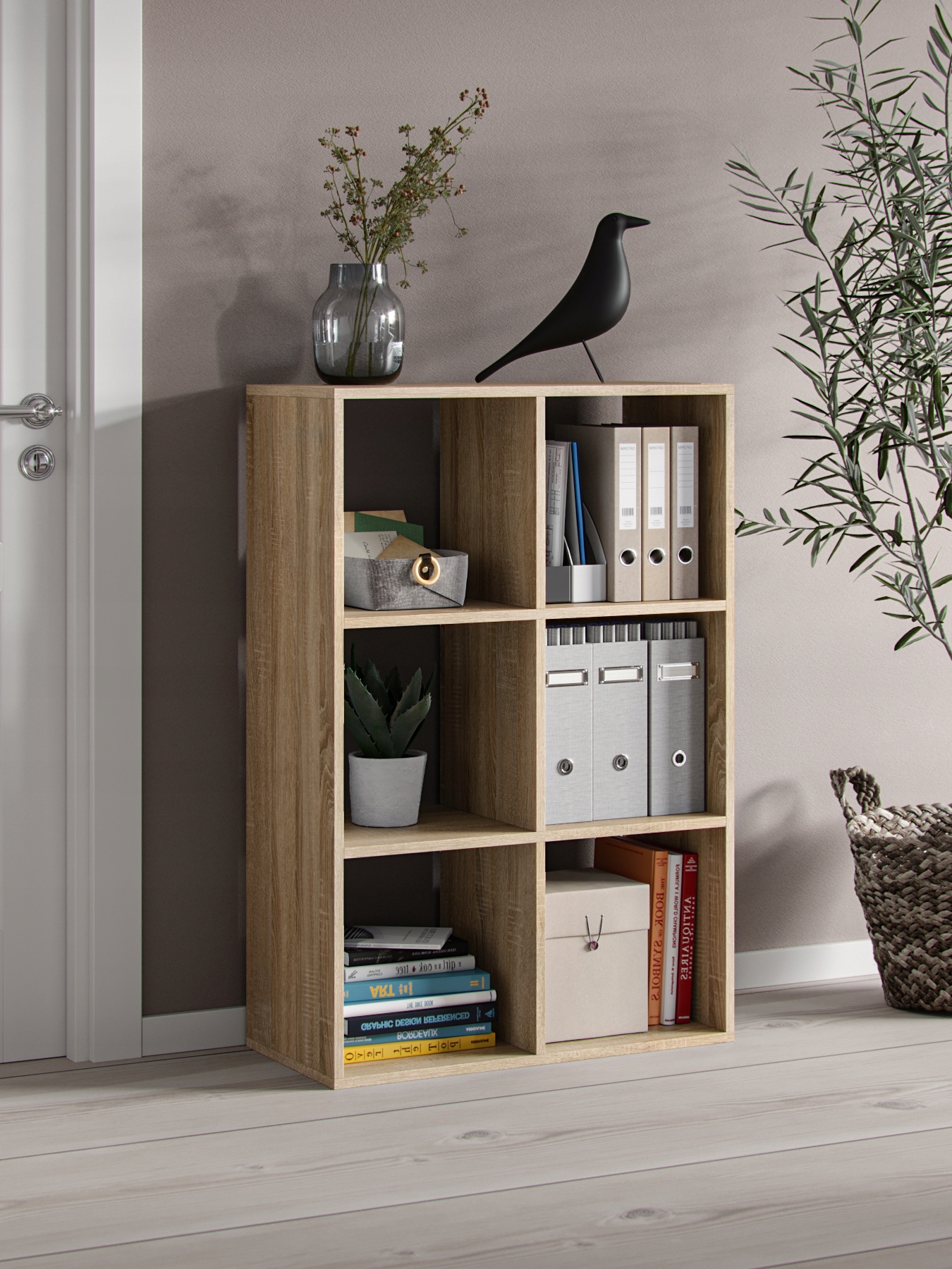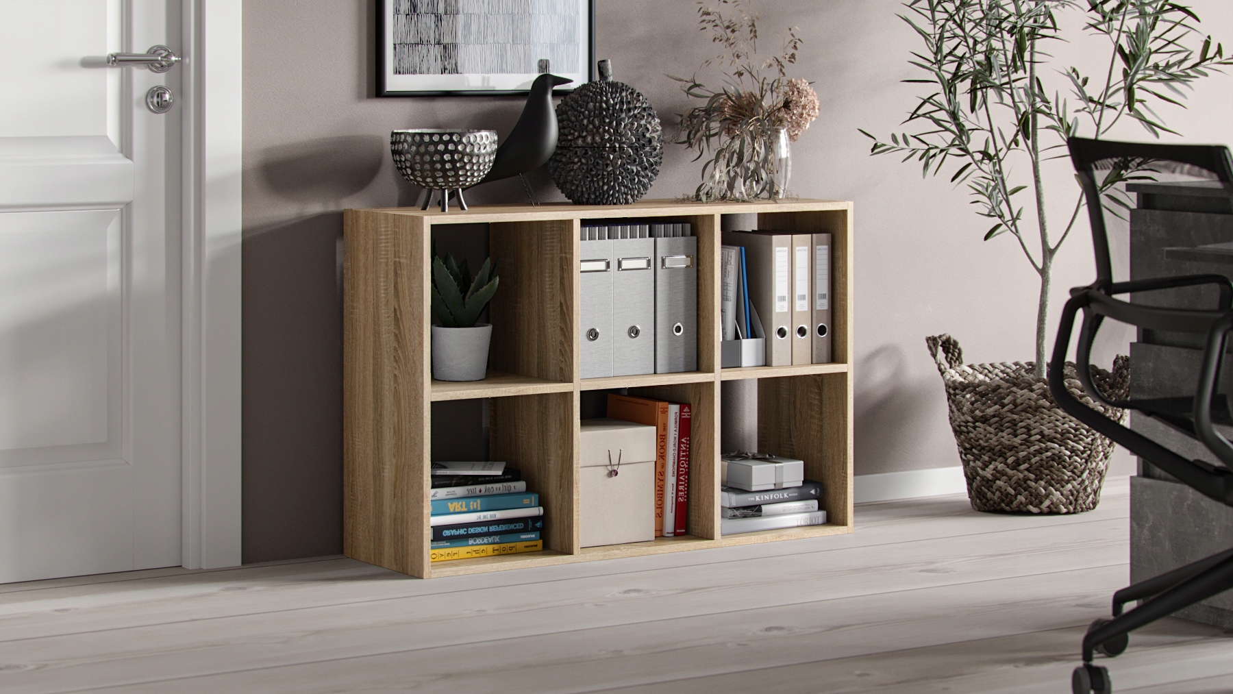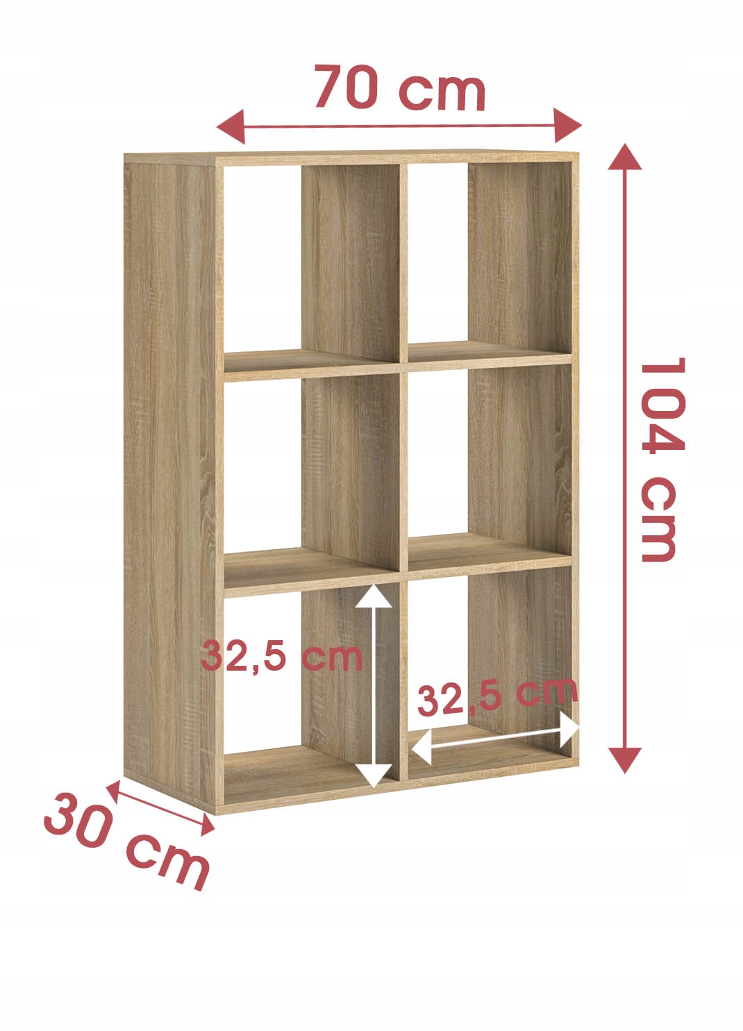 • 6 praktycznych komór 32,5×32,5 cm – idealne na książki, segregatory, pudła i ozdoby.