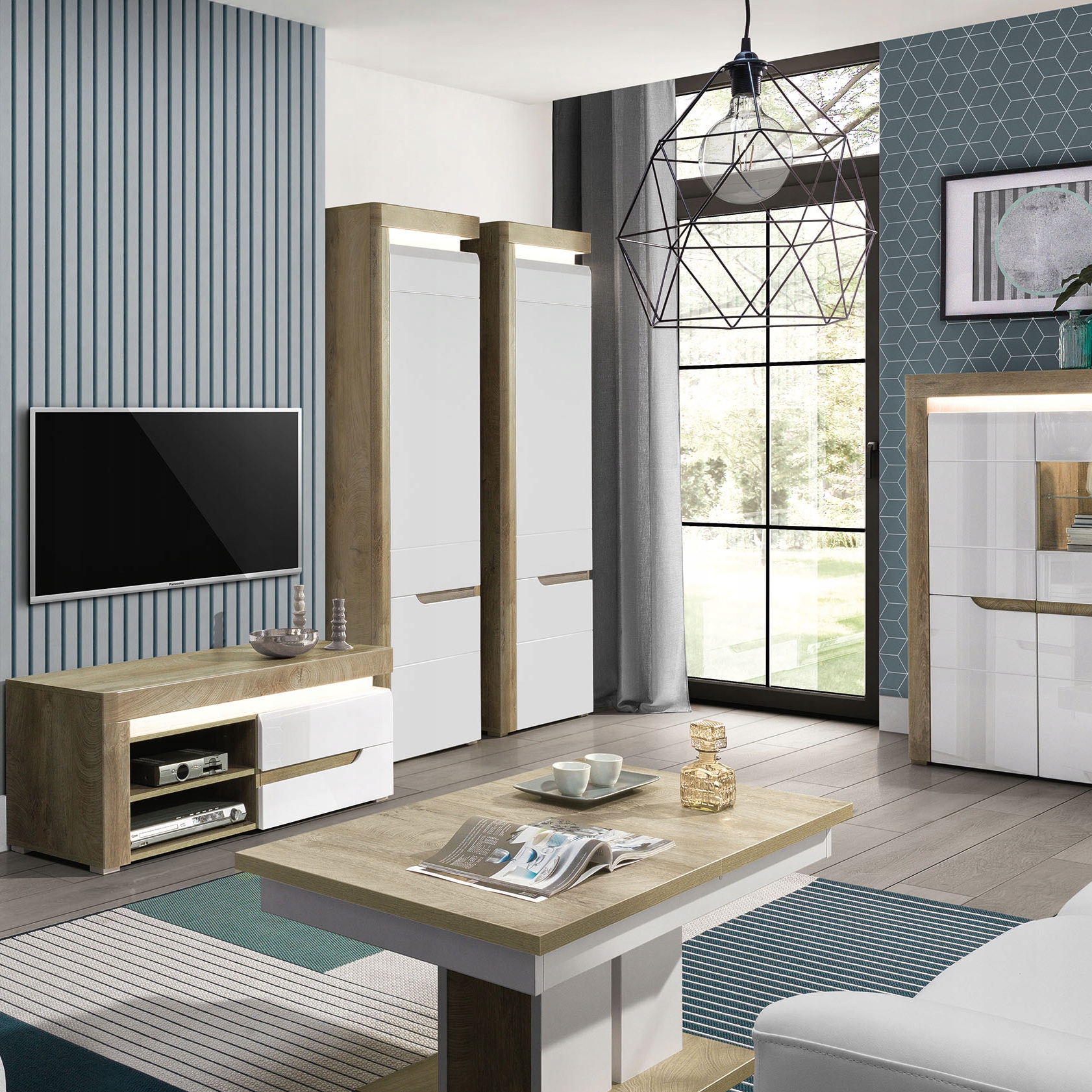 - Oświetlenie LED – wbudowany pasek LED umieszczony w górnym wieńcu regału dodaje nowoczesnego akcentu i pozwala efektownie wyeksponować mebel nawet po zmroku.
