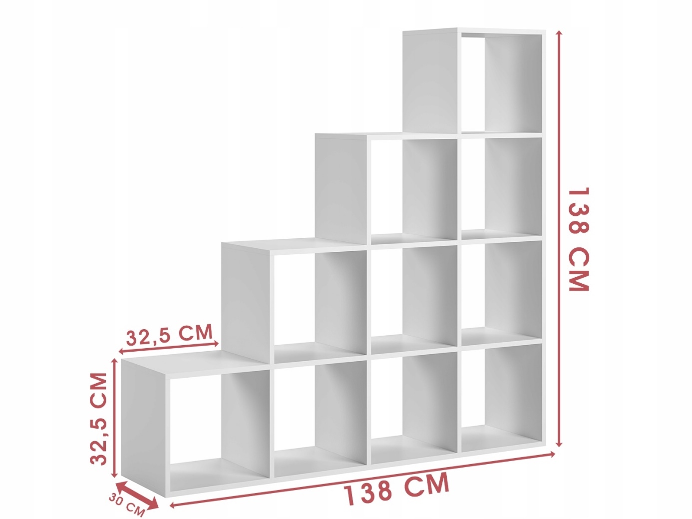 Solidna konstrukcja z płyty laminowanej 16 mm zapewnia wytrzymałość i stabilność, a przemyślany układ półek w formie schodków doskonale wpisuje się w trendy aranżacyjne. Regał sprawdzi się zarówno w salonie, biurze, przedpokoju, jak i w pokoju młodzieżowym czy dziecięcym.