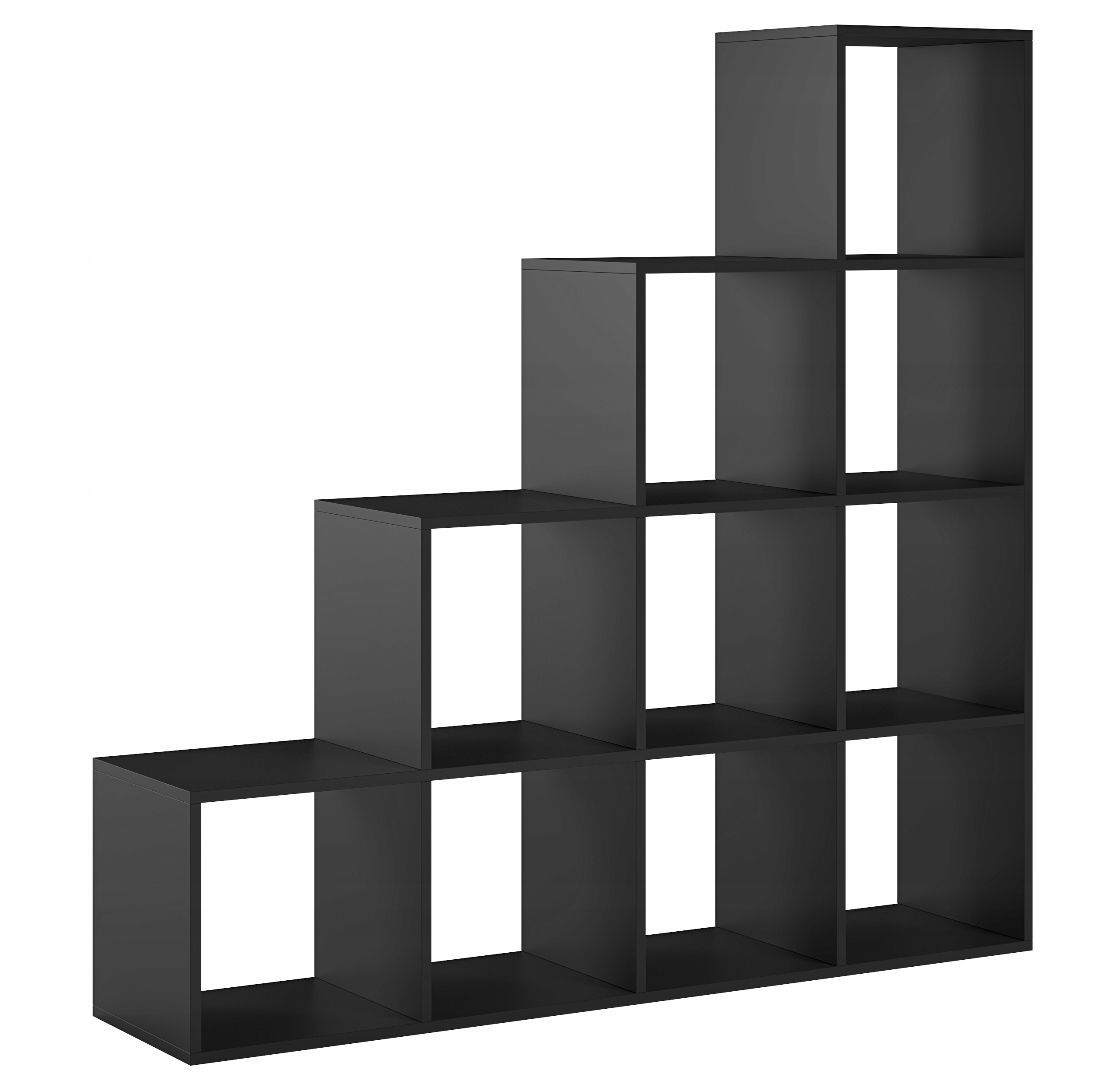 Solidna konstrukcja z płyty laminowanej 16 mm zapewnia wytrzymałość i stabilność, a przemyślany układ półek w formie schodków doskonale wpisuje się w trendy aranżacyjne. Regał sprawdzi się zarówno w salonie, biurze, przedpokoju, jak i w pokoju młodzieżowym czy dziecięcym.