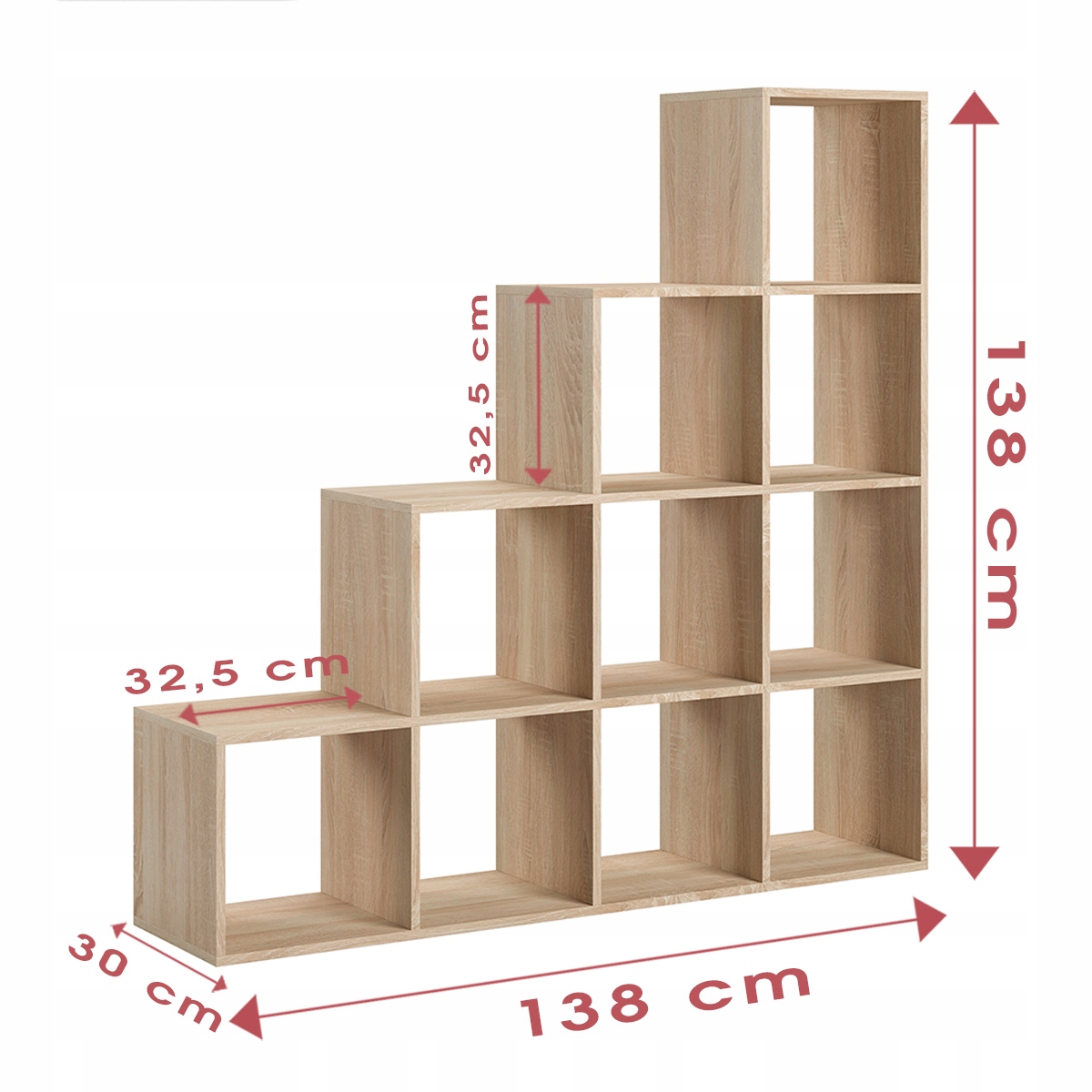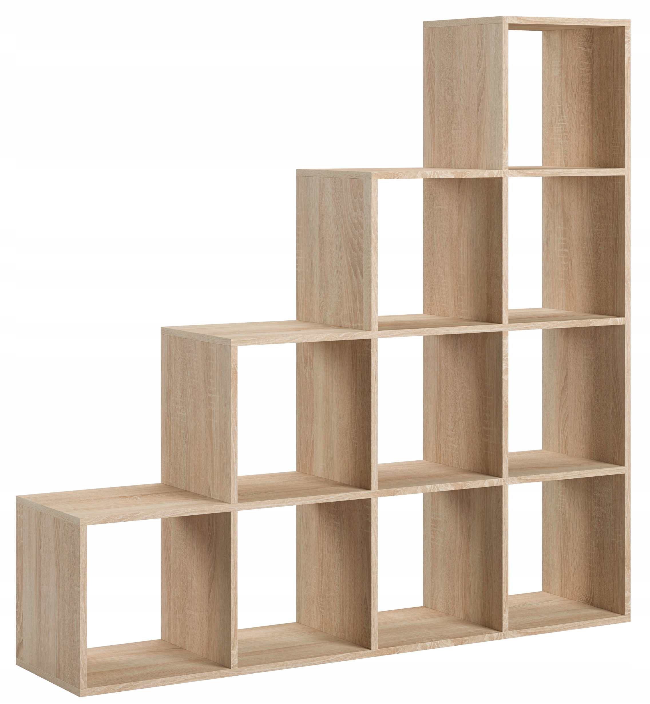 Solidna konstrukcja z płyty laminowanej 16 mm zapewnia wytrzymałość i stabilność, a przemyślany układ półek w formie schodków doskonale wpisuje się w trendy aranżacyjne. Regał sprawdzi się zarówno w salonie, biurze, przedpokoju, jak i w pokoju młodzieżowym czy dziecięcym.