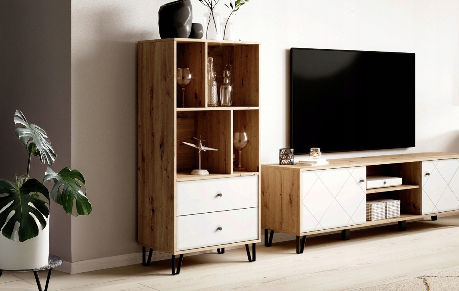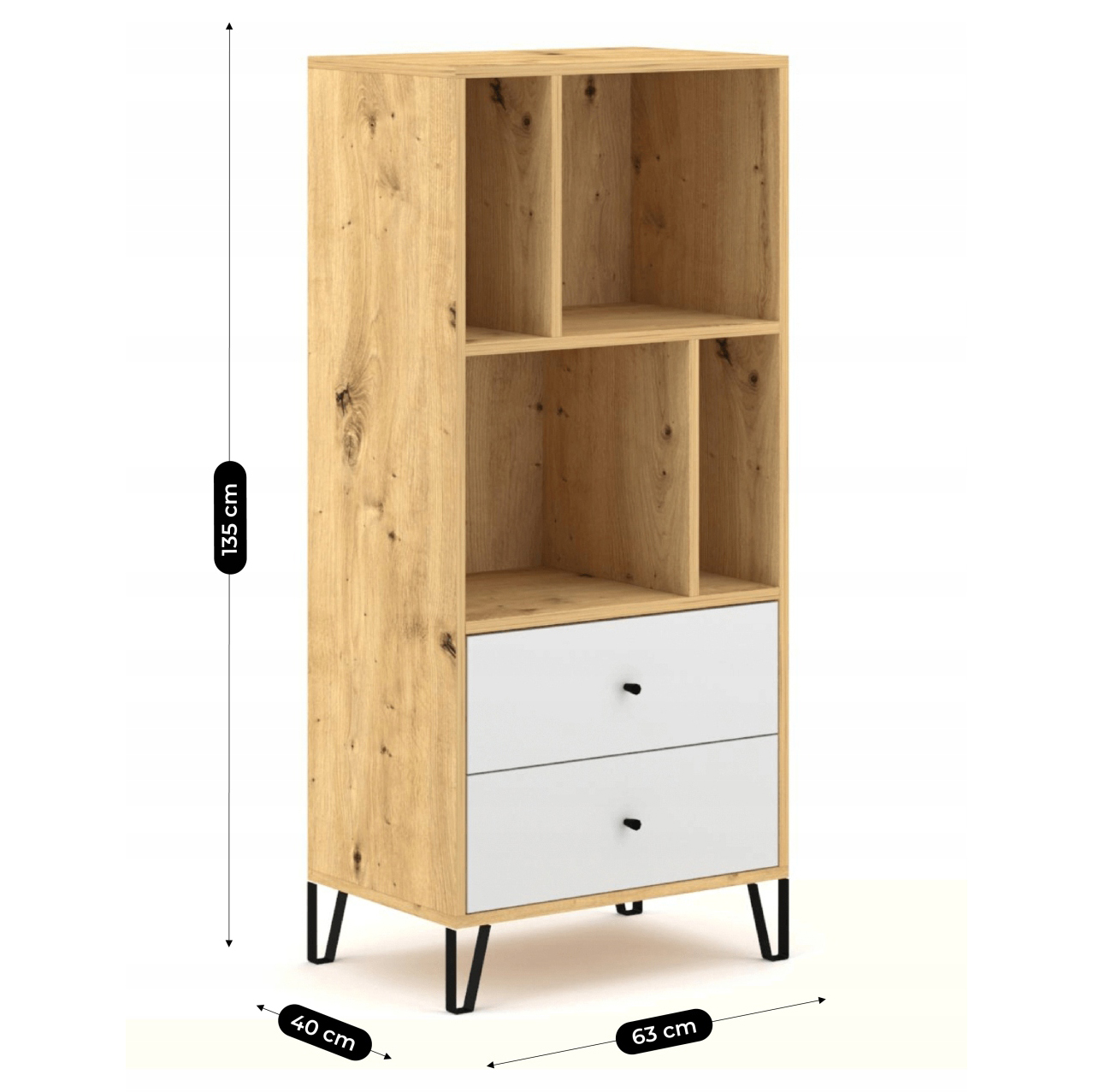 Regał o wymiarach 63 x 40 x 135 cm to piękny i funkcjonalny mebel idealny do salonu, sypialni, gabinetu, pokoju dziecięcego. Drewno w połączeniu z białymi szufladami i czarnymi nogami świetnie wpisuje się w loftowy styl.