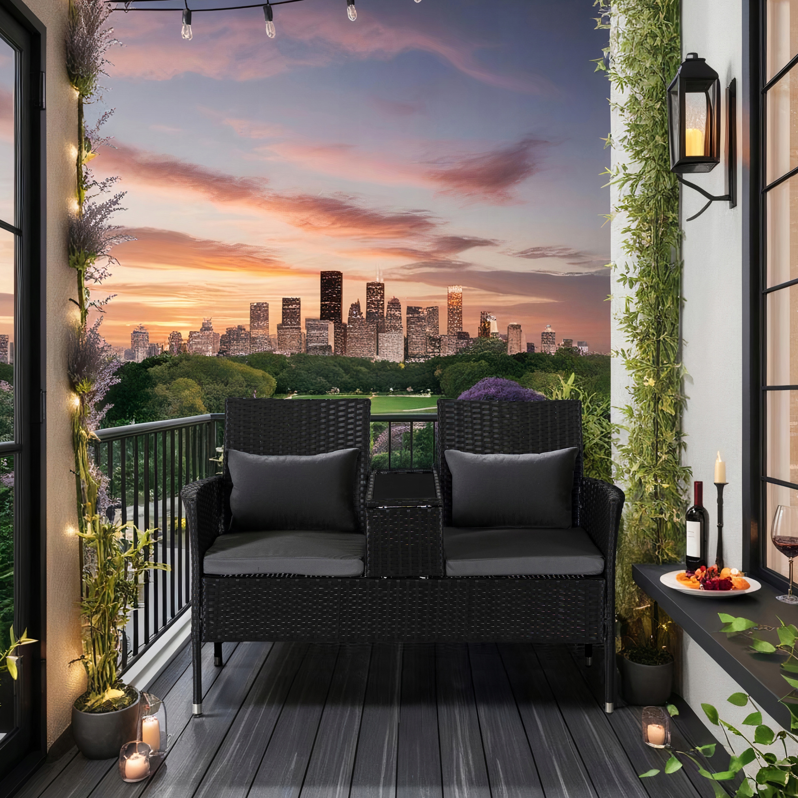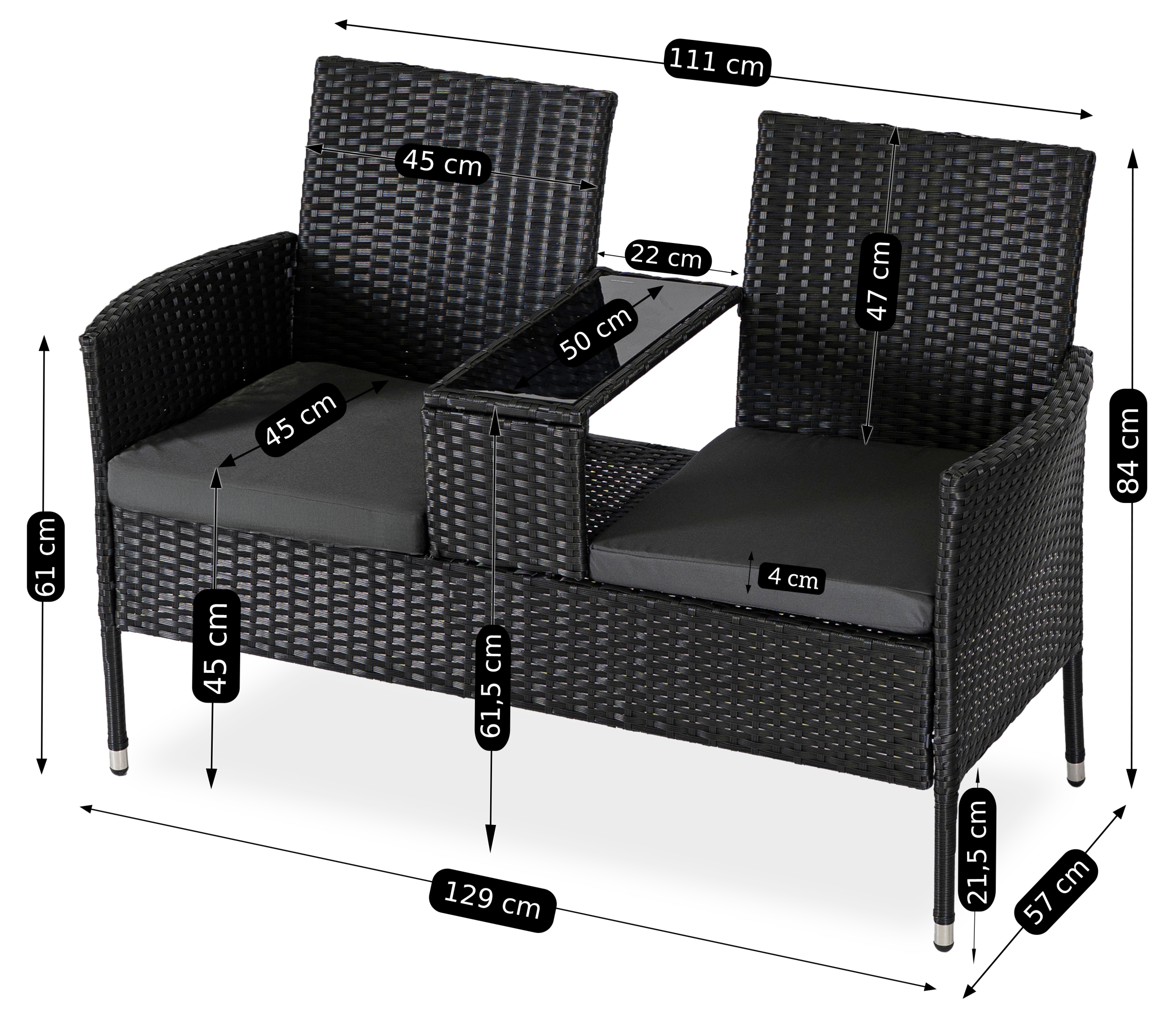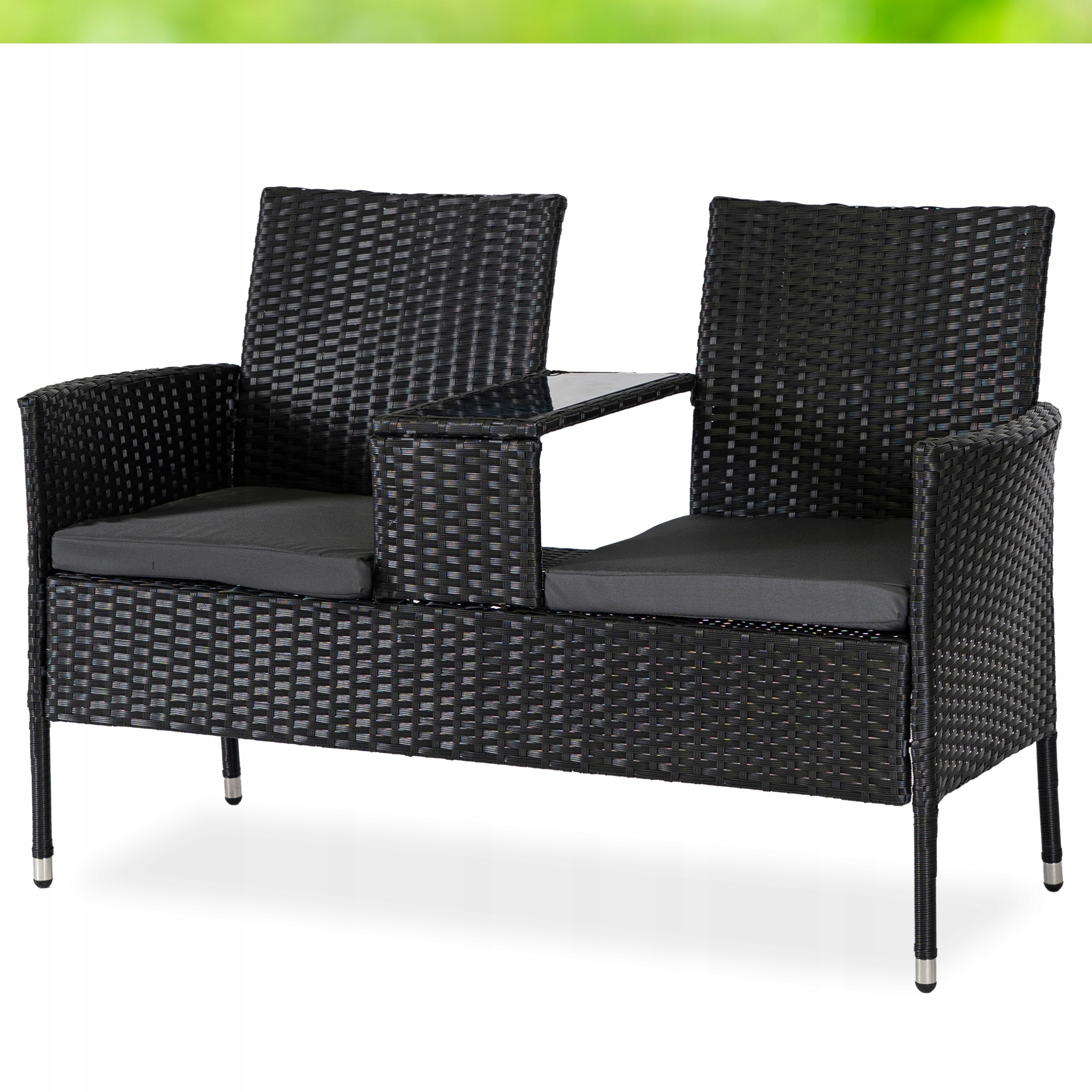Dwuosobowa ławka o wymiarach 129 x 57 x 84 cm. Wykonana z technorattanu z wbudowanym stolikiem między siedzeniami. Doskonale sprawdzi się na balkonach, tarasach i w ogrodach. Jej nowoczesny design i wygoda użytkowania sprawiają, że jest to doskonały wybór do przestrzeni na świeżym powietrzu.
