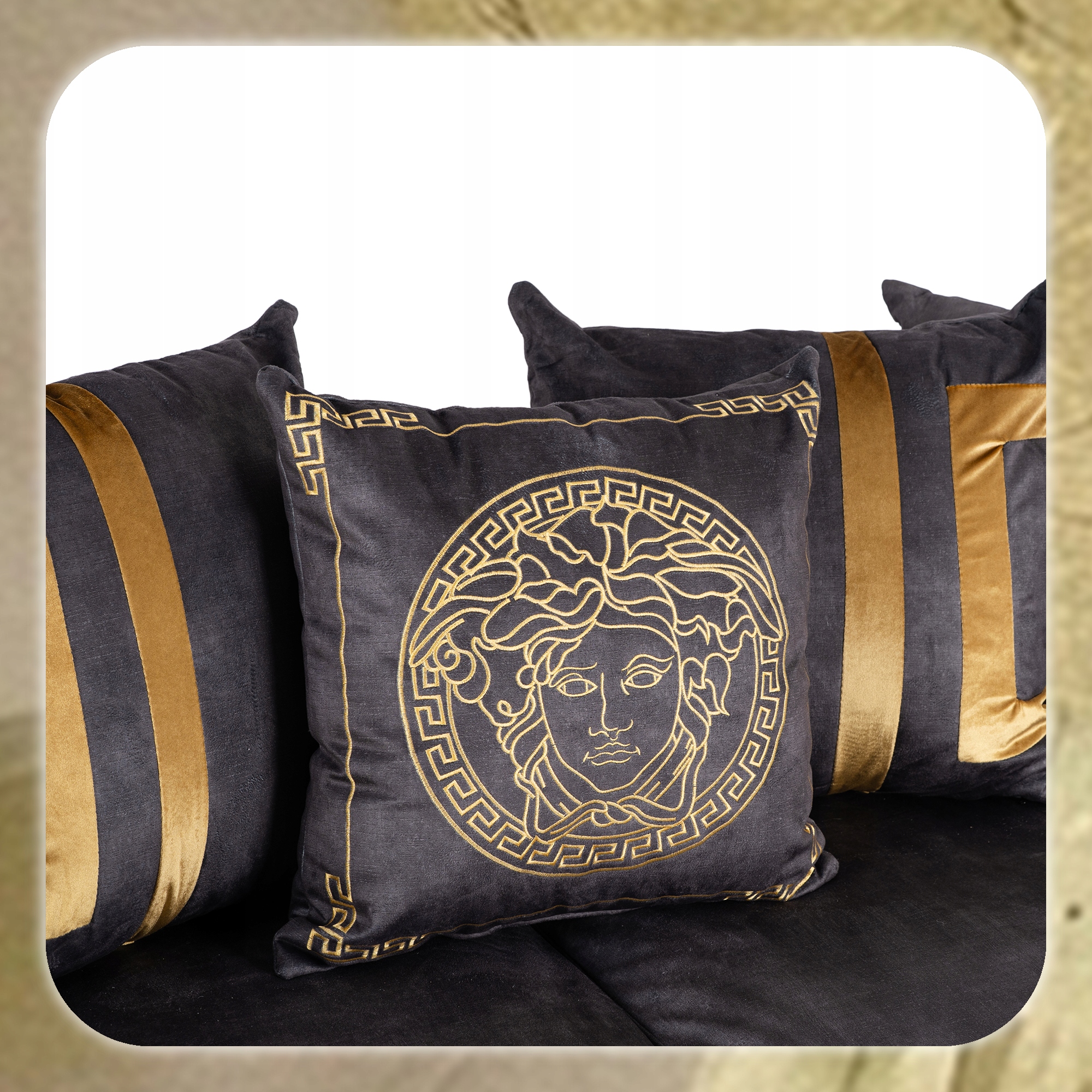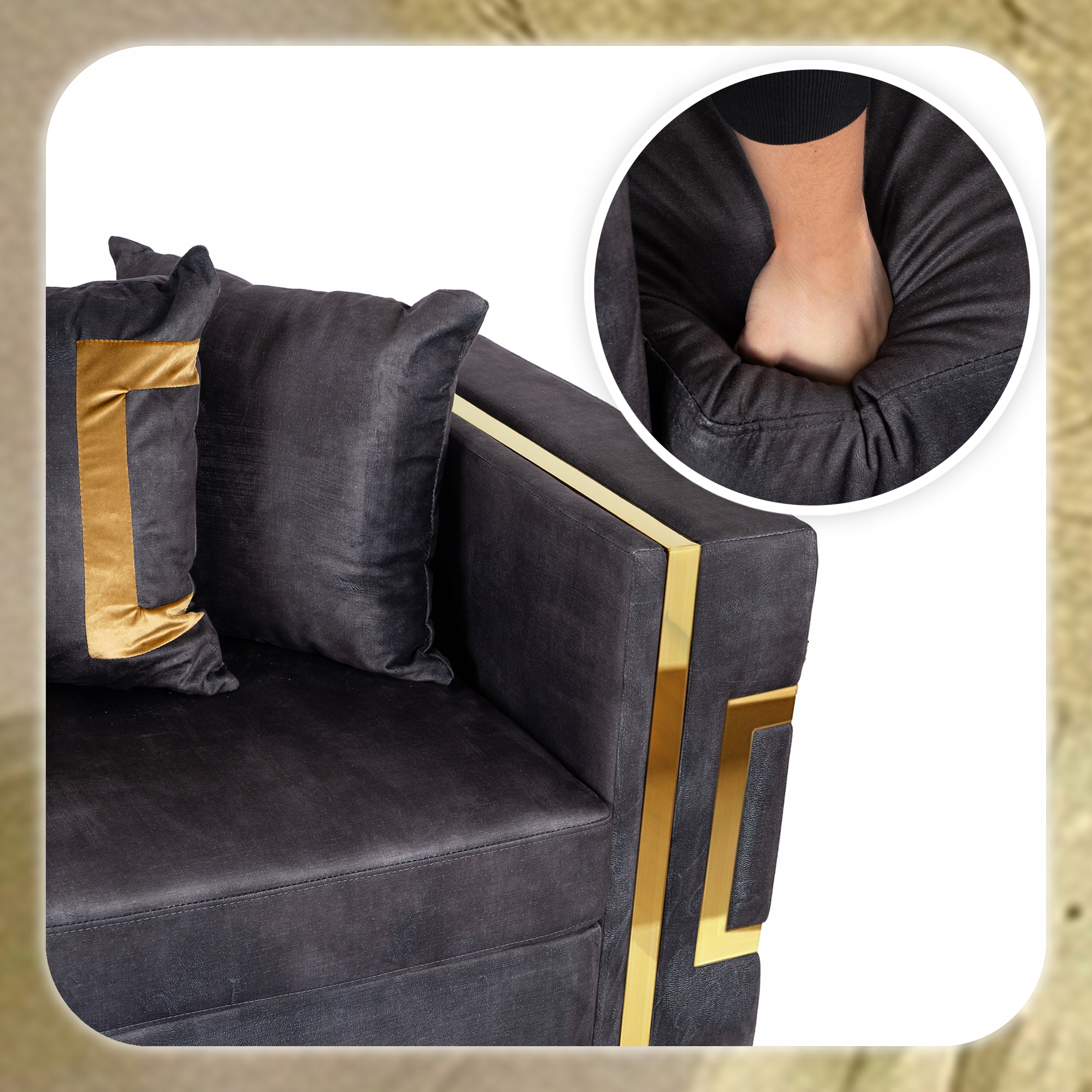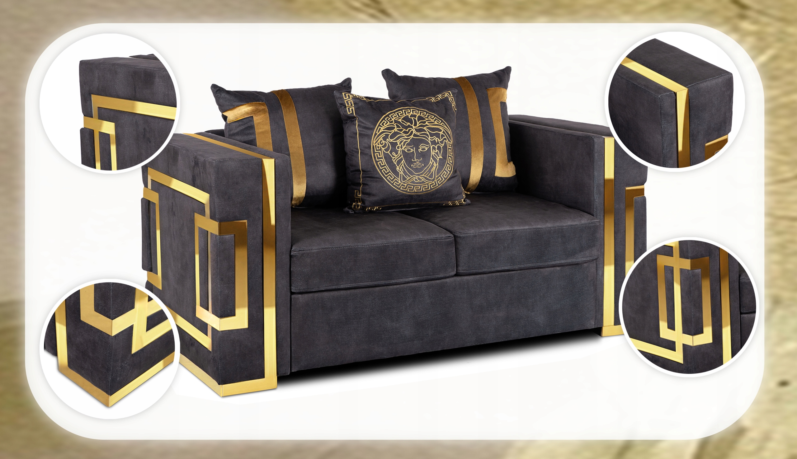 Kanapa PALLAZO posiada stylowe poduszki z wysokiej jakości tkaniny, która zapewnia idealne połączenie miękkości i sprężystości. Oferuje komfortowe podparcie pleców, a dekoracyjny złoty wzór nadaje całości elegancki, luksusowy charakter. Idealne do codziennego relaksu i odpoczynku.