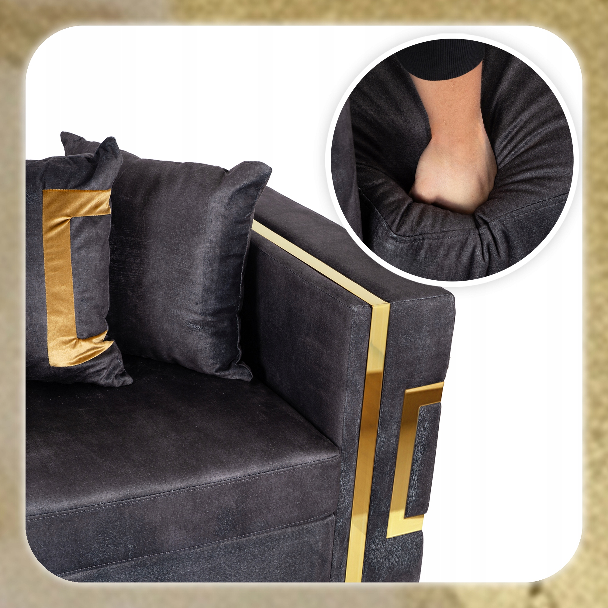 Kanapa PALLAZO posiada stylowe poduszki z wysokiej jakości tkaniny, która zapewnia idealne połączenie miękkości i sprężystości. Oferuje komfortowe podparcie pleców, a dekoracyjny złoty wzór nadaje całości elegancki, luksusowy charakter. Idealne do codziennego relaksu i odpoczynku.