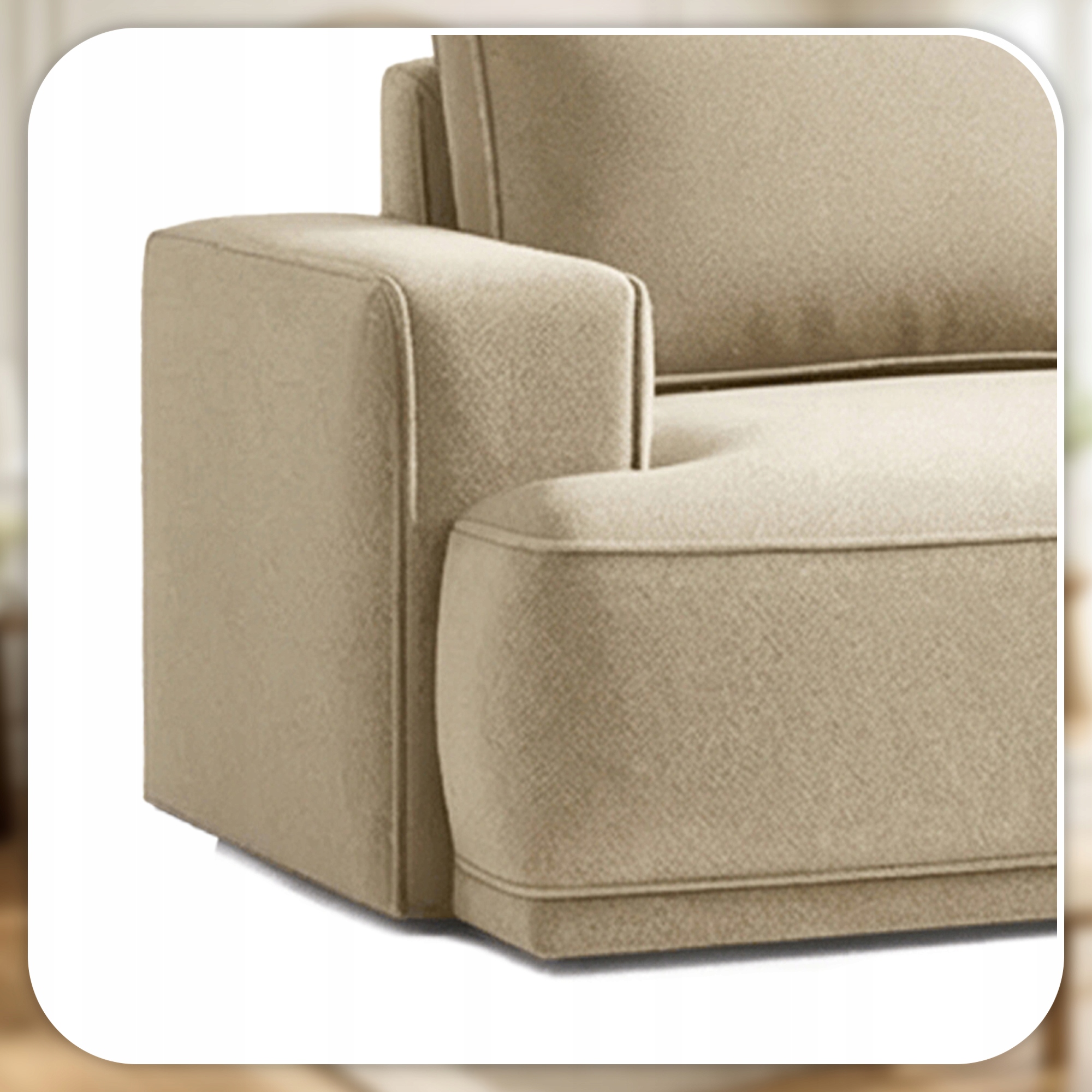 Tkanina MARCELLO 20 typu boucle to połączenie stylu i funkcjonalności – jest miękka i przyjemna w dotyku, a jej modna, strukturalna powierzchnia nadaje sofie wyjątkowego charakteru. Materiał wyróżnia się wysoką odpornością na codzienne użytkowanie, dzięki czemu przez długi czas zachowuje estetyczny wygląd. Dodatkowo zapewnia komfort podczas wypoczynku, a jej beżowy kolor doskonale wpisuje się w aktualne trendy wnętrzarskie, dodając wnętrzu elegancji i przytulności.