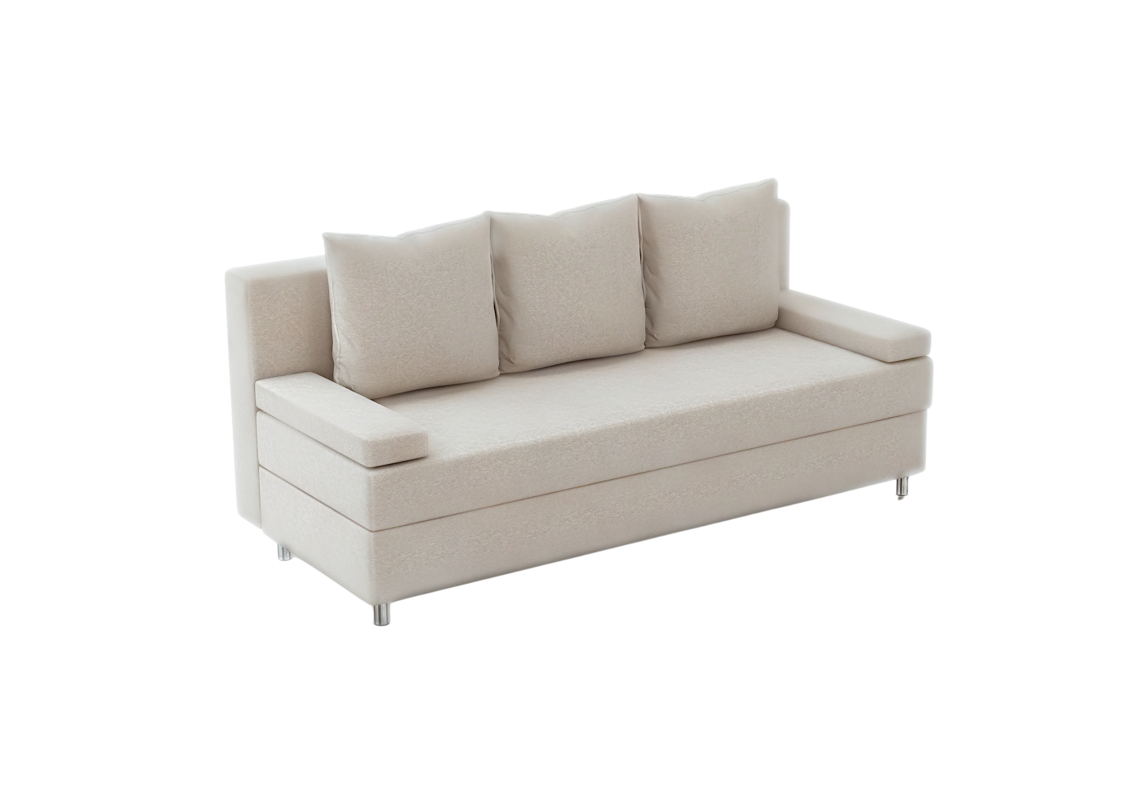 Prosta mała kanapa na srebrnych nogach o wysokości 6cm wyposażona w funkcję spania oraz dużą skrzynią na pościel. 3 duże poduszki szyte na zamkach oraz 2 piankowe podłokietniki nadają jej niebanalnego wyglądu. Sofa idealna dla małych pomieszczeń.