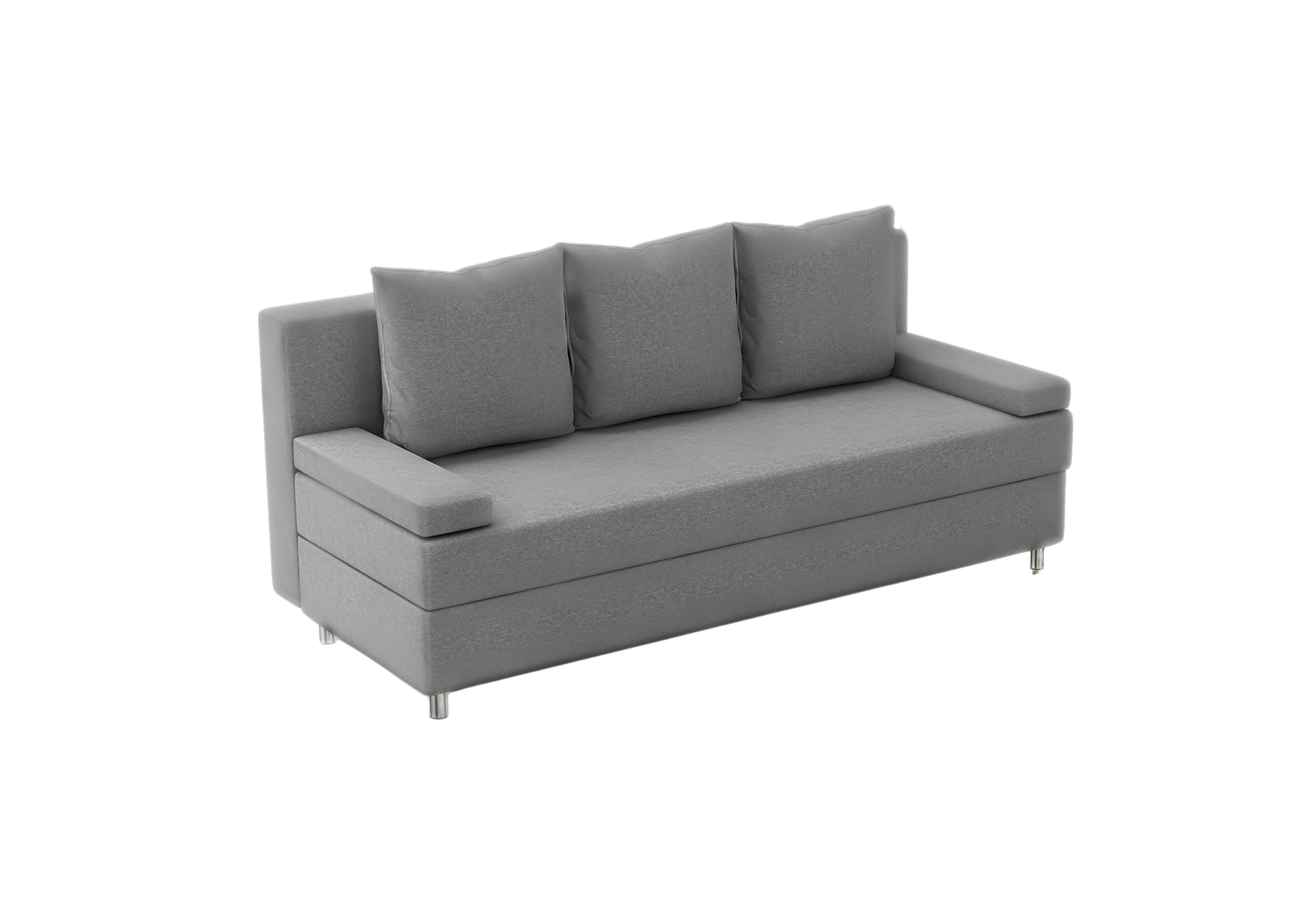 Prosta mała kanapa na srebrnych nogach o wysokości 6cm wyposażona w funkcję spania oraz dużą skrzynią na pościel. 3 duże poduszki szyte na zamkach oraz 2 piankowe podłokietniki nadają jej niebanalnego wyglądu. Sofa idealna dla małych pomieszczeń.