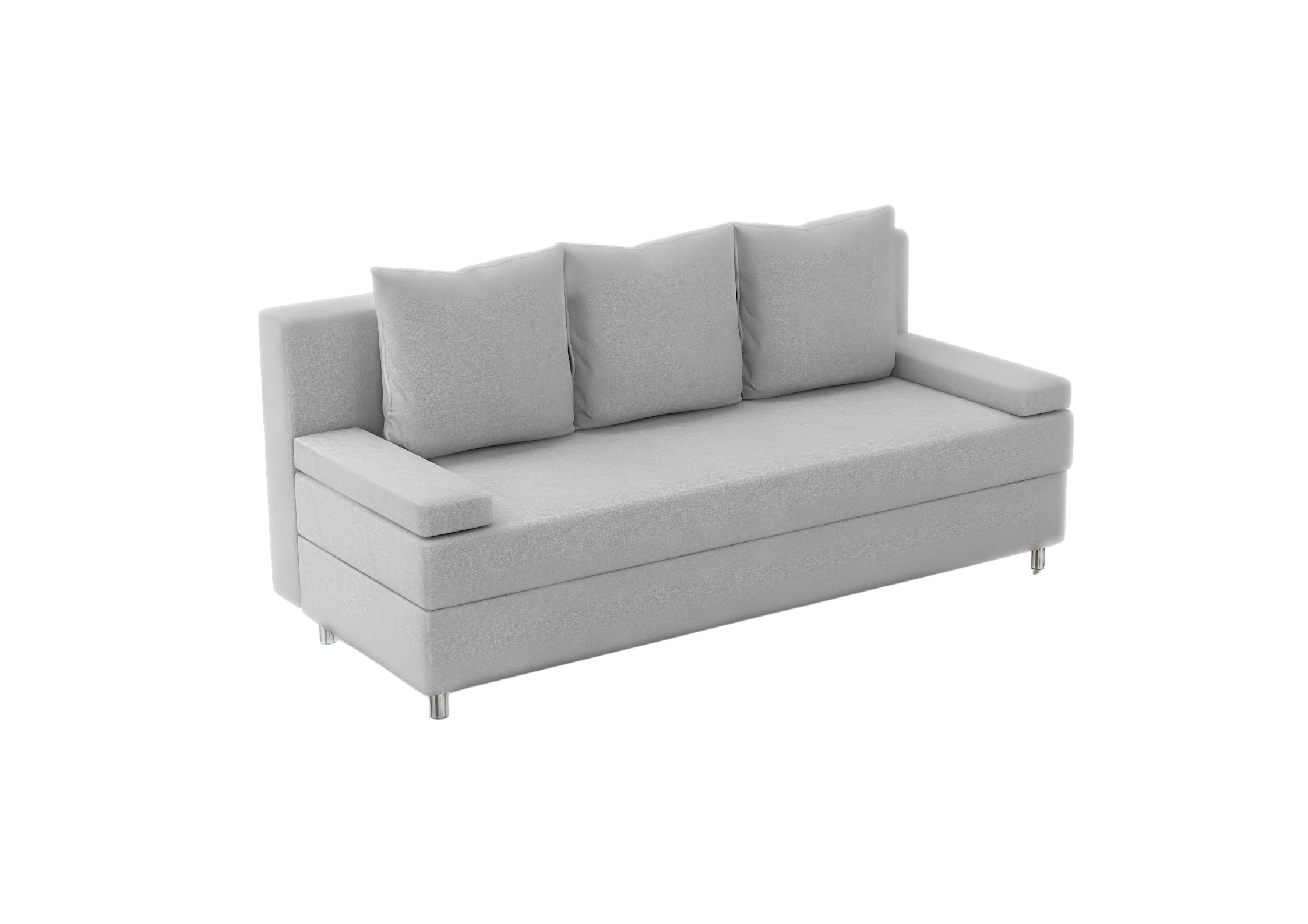 Prosta mała kanapa na srebrnych nogach o wysokości 6cm wyposażona w funkcję spania oraz dużą skrzynią na pościel. 3 duże poduszki szyte na zamkach oraz 2 piankowe podłokietniki nadają jej niebanalnego wyglądu. Sofa idealna dla małych pomieszczeń.
