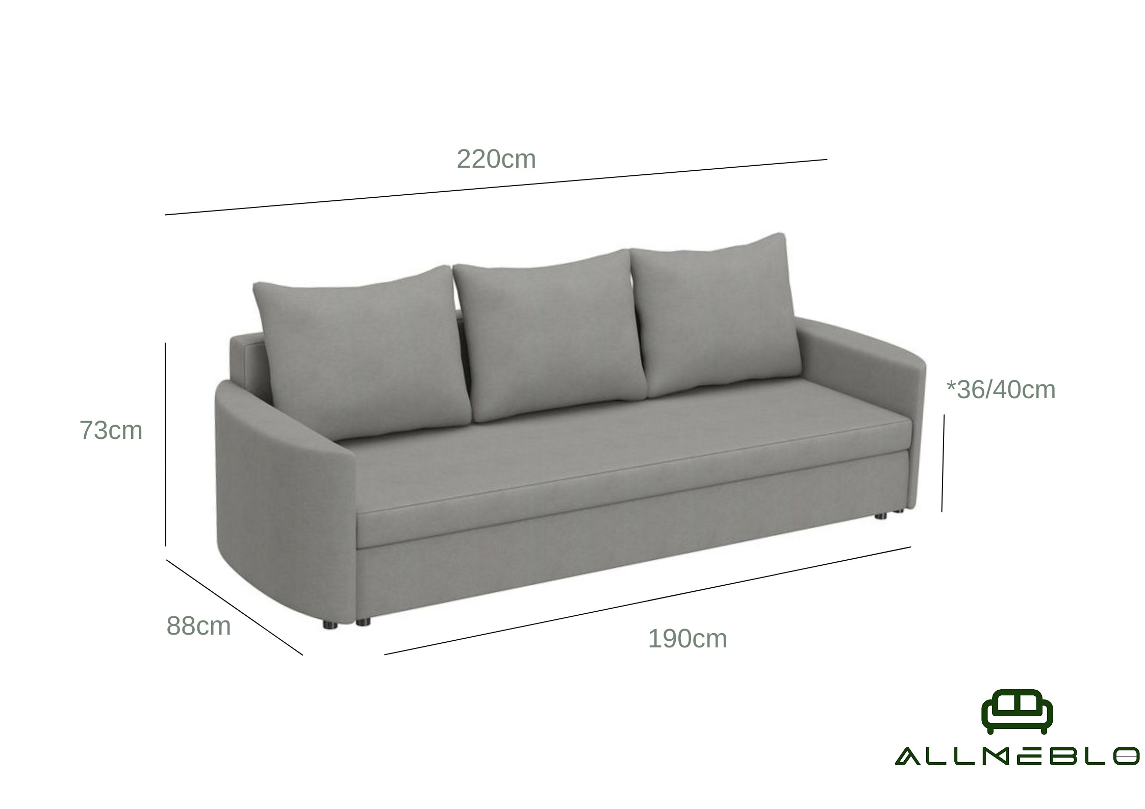 - Sofa z funkcją spania, który idealnie nada się zarówno do małego pokoju w bloku jak i w większych pomieszczeniach.
