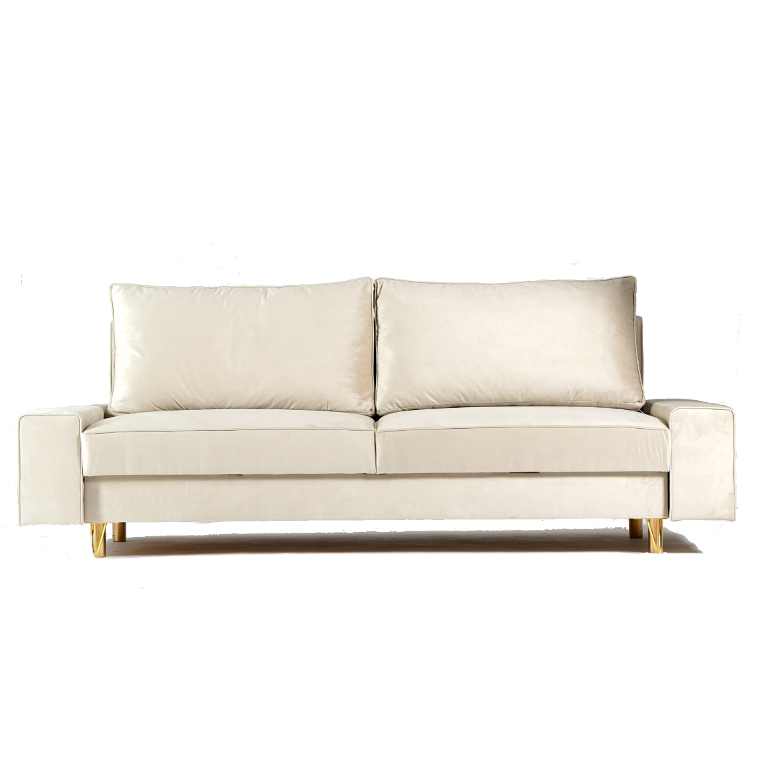 Elegancka sofa Stino z funkcją spania. Sofa na złotych nogach dodaje szyku i elegancji do naszego salonu. Sofa dzięki swoim wymiarom będzie meblem idealnym dla każdego rodzaju pomieszczeń. Duża skrzynia na pościel, duże poduszki oparciowe i piękne przeszycia to dodatkowe atuty sofy Stino. Sofa w stylu glamour.