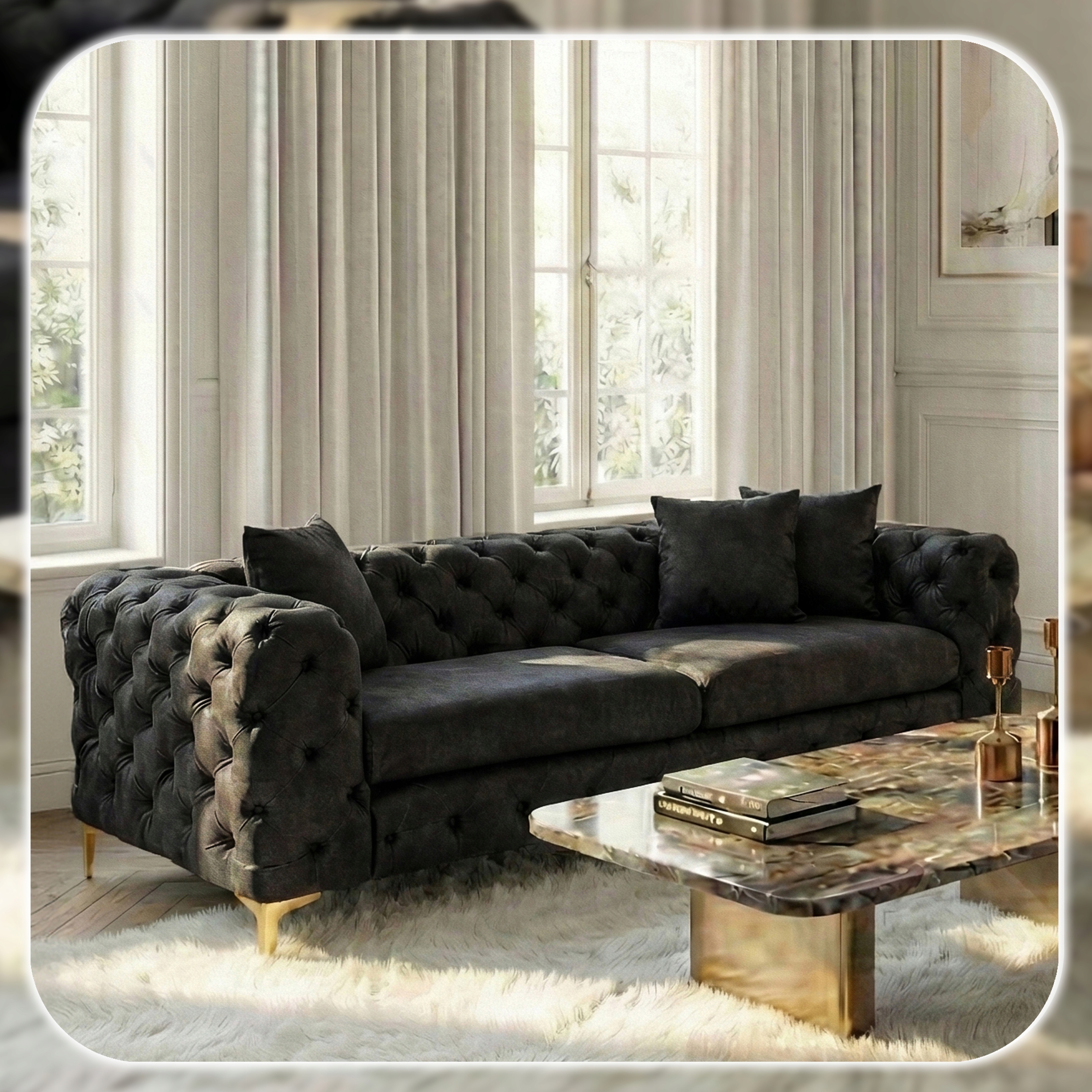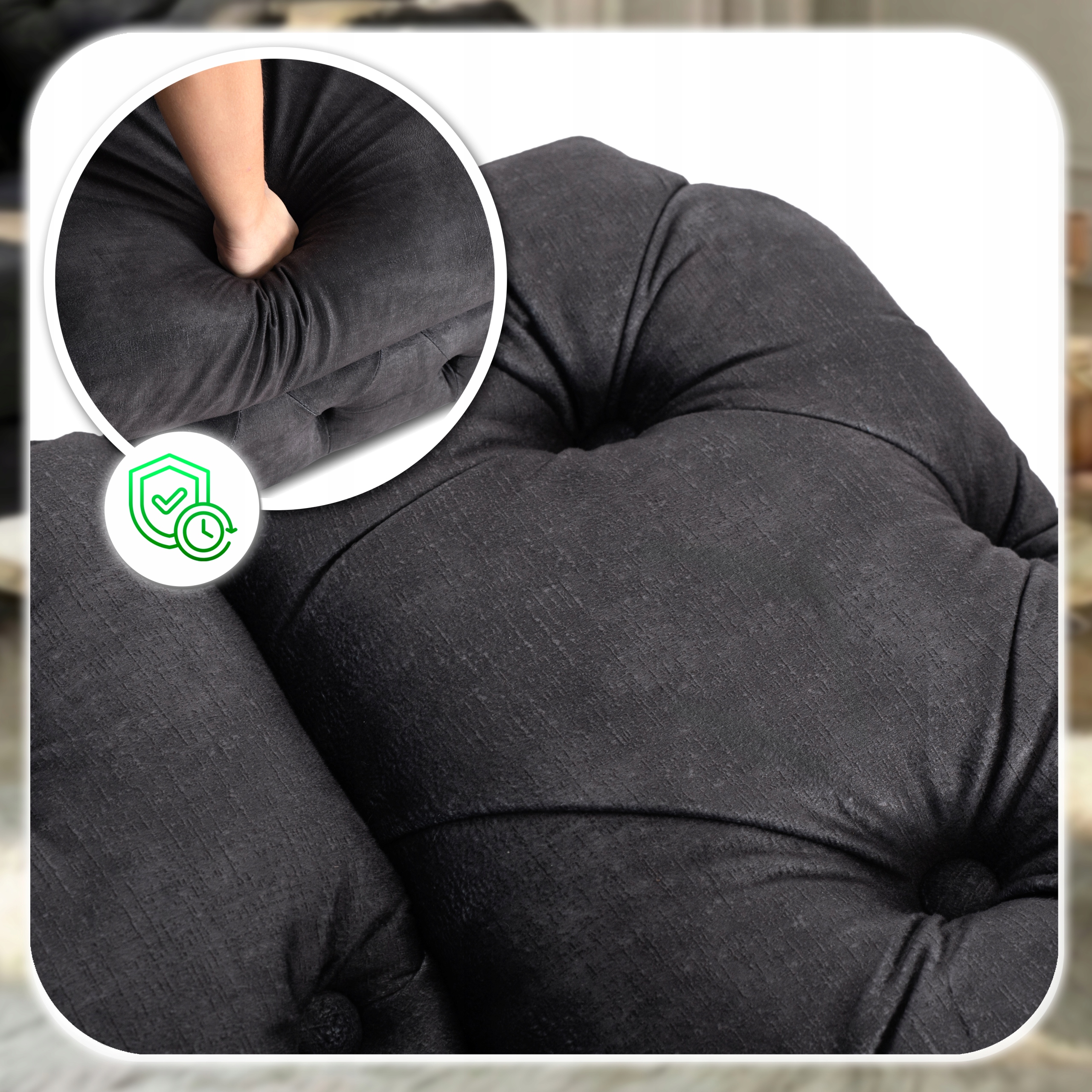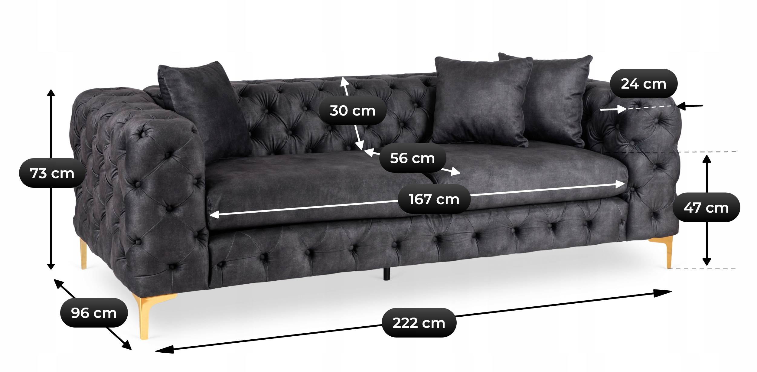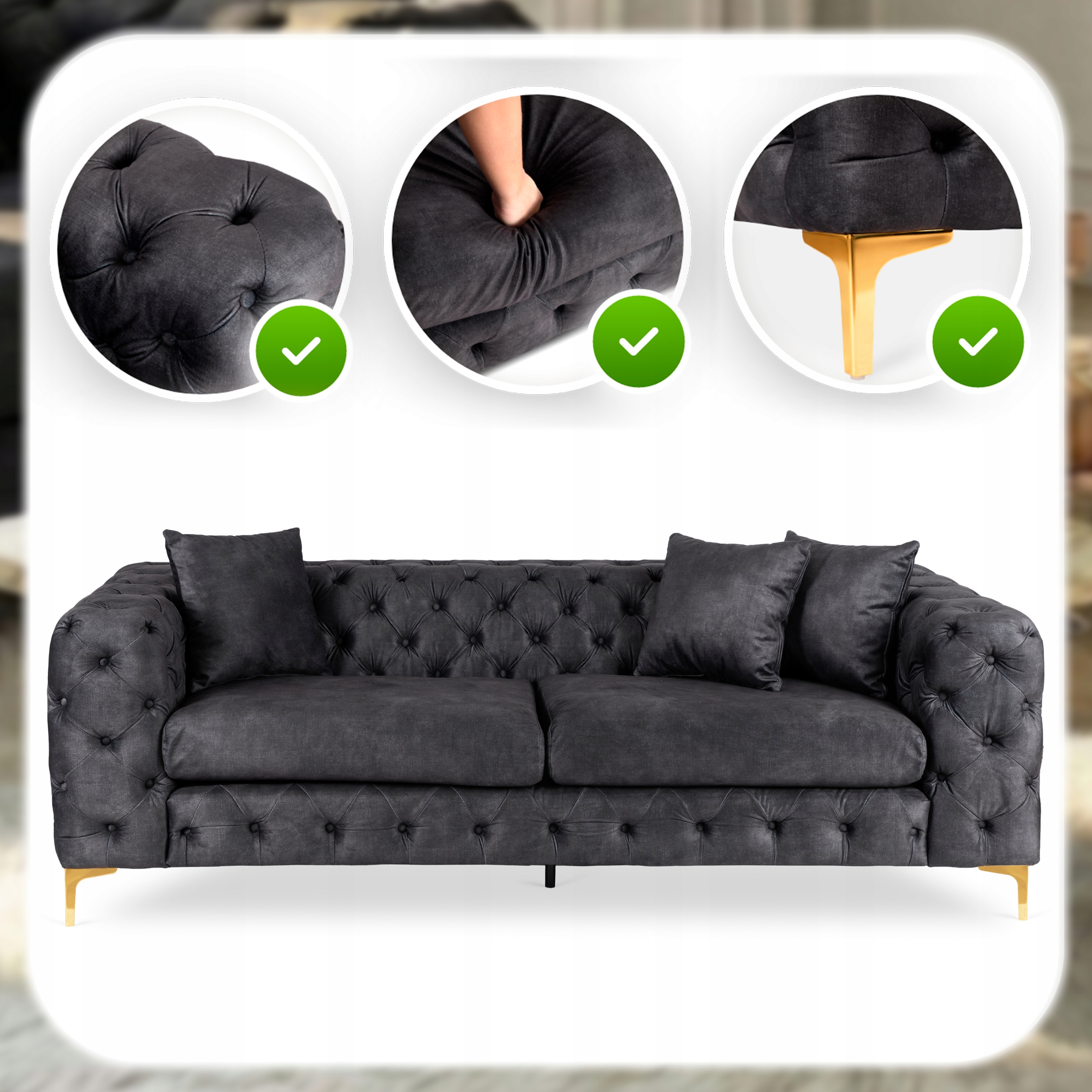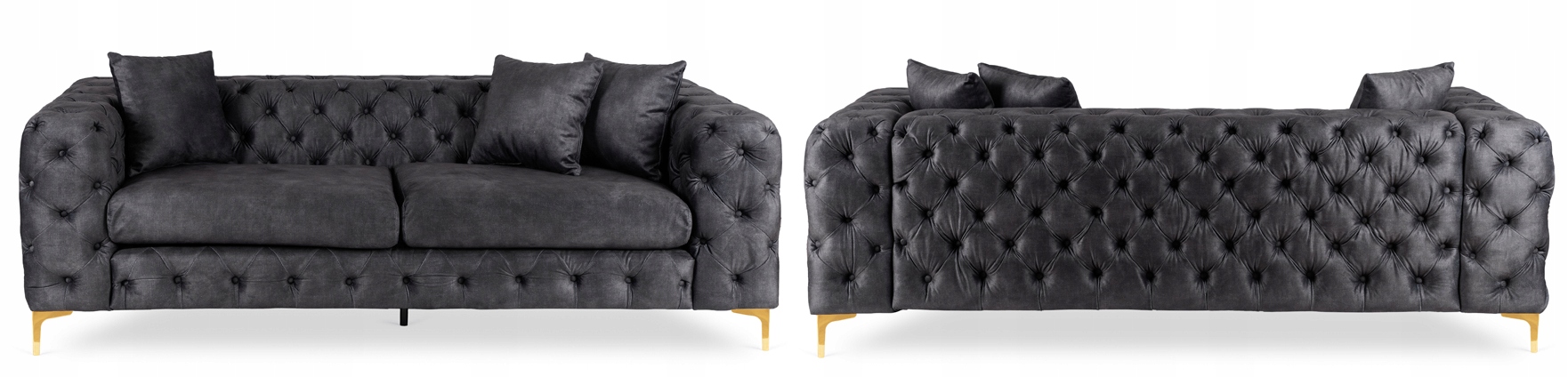 Kanapa SORRENTO 3S łączy w sobie luksusowy wygląd z najwyższym poziomem komfortu. Jej ciemno szary odcień wprowadza do pomieszczenia elegancję a głębokie pikowania nadają jej wyjątkowy charakter. To mebel, który zachwyca od pierwszego spojrzenia i zaprasza do relaksu. W zestawie 3 poduszki o wymiarach 40x40 cm.