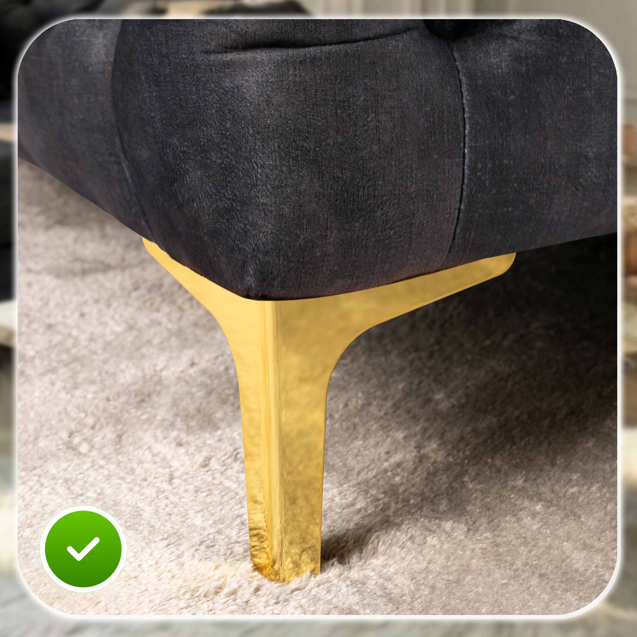 Kanapa SORRENTO 3S została osadzona na wysokich nóżkach, które gwarantują pełną stabilność i trwałość konstrukcji. Ich lustrzany złoty kolor tworzy elegancki kontrast z ciemno szarą tkaniną, dodając kanapie wyrafinowanego charakteru.