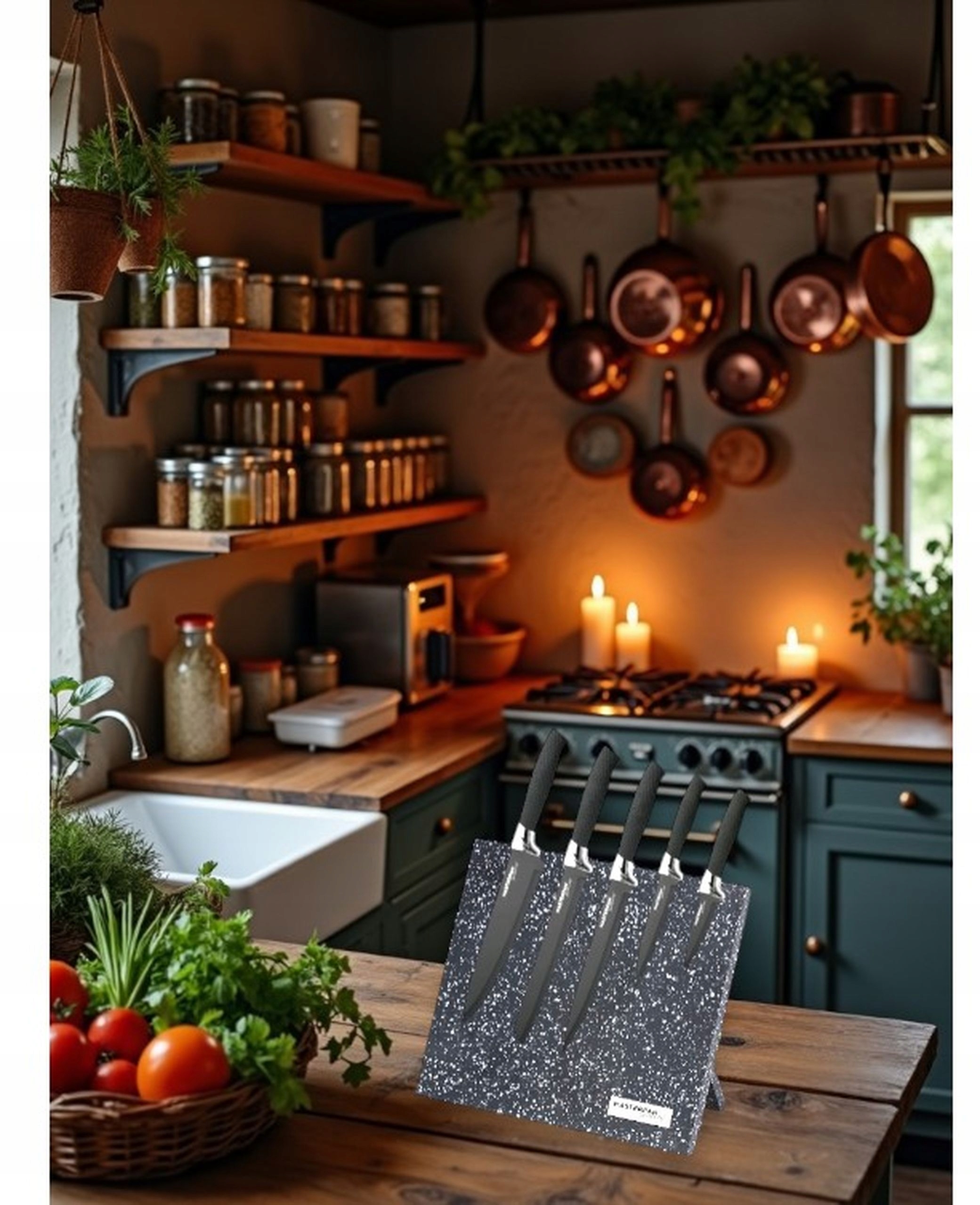 - Mocne magnesy wbudowane w stojak stabilnie trzymają noże, zapobiegając ich przesuwaniu.
