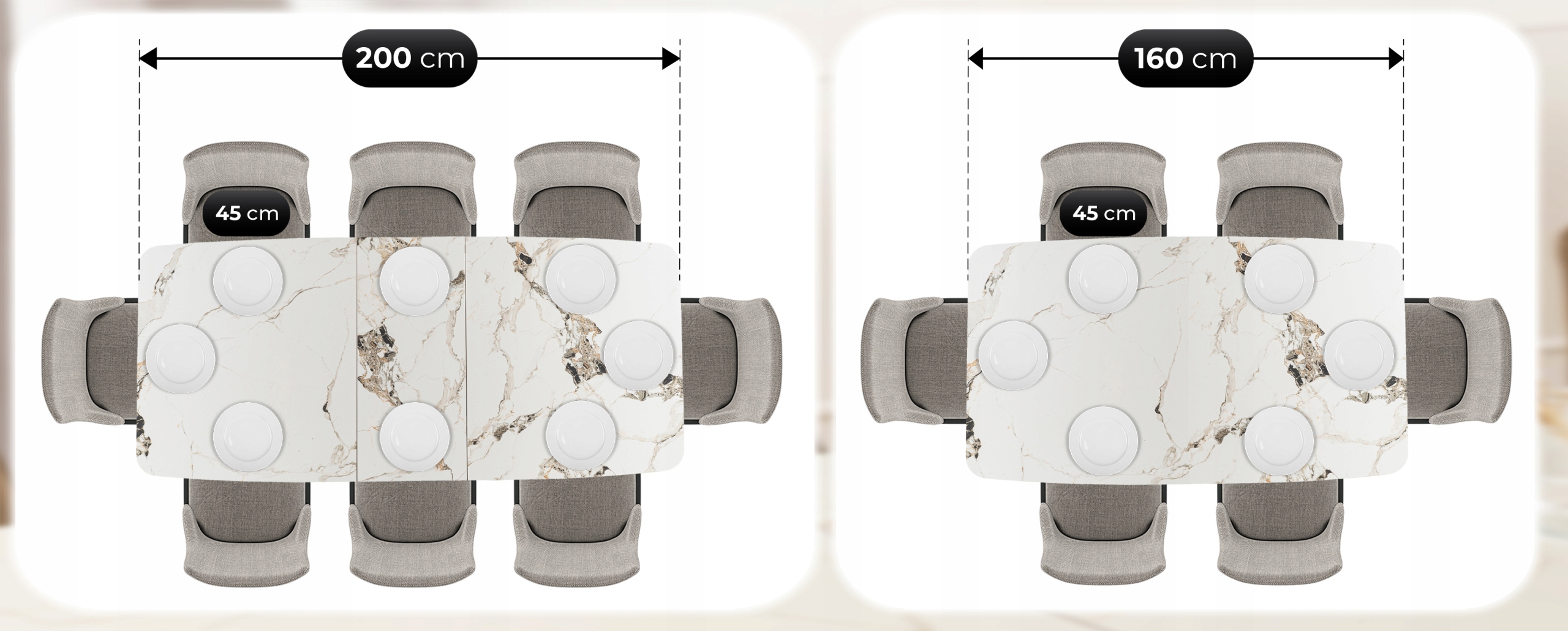 Dzięki szybkiemu i wygodnemu mechanizmowi rozkładania, możesz z łatwością zwiększyć długość stołu z 160 cm do 200 cm. Wszystko za sprawą ukrytej wkładki, która wysuwa się płynnie na prowadnicy ze środka blatu.