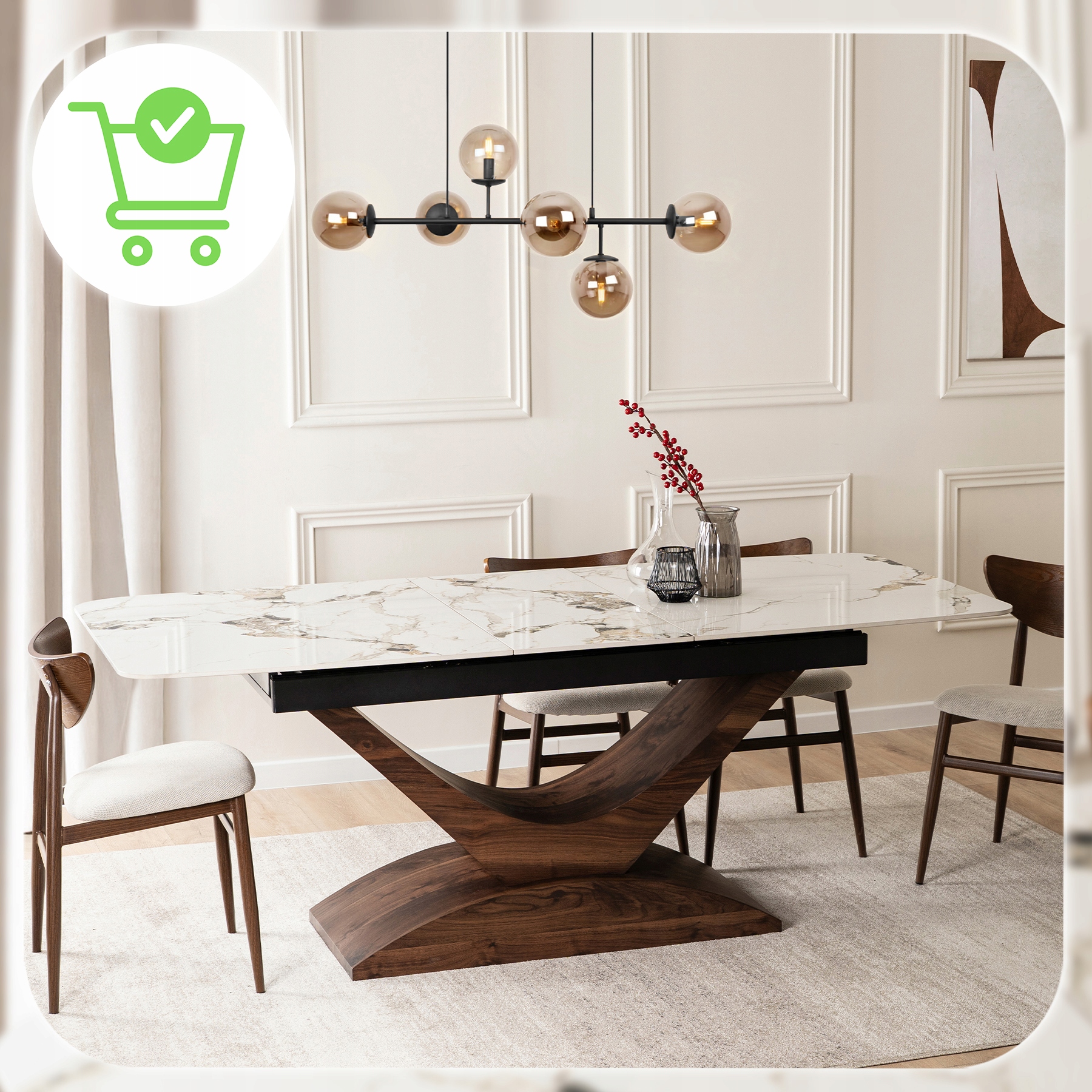 Zdecydowanie tak. Połączenie białego, eleganckiego blatu z podstawą w kolorze orzecha sprawia, że stół harmonijnie komponuje się zarówno z nowoczesnymi, jak i klasycznymi wnętrzami.