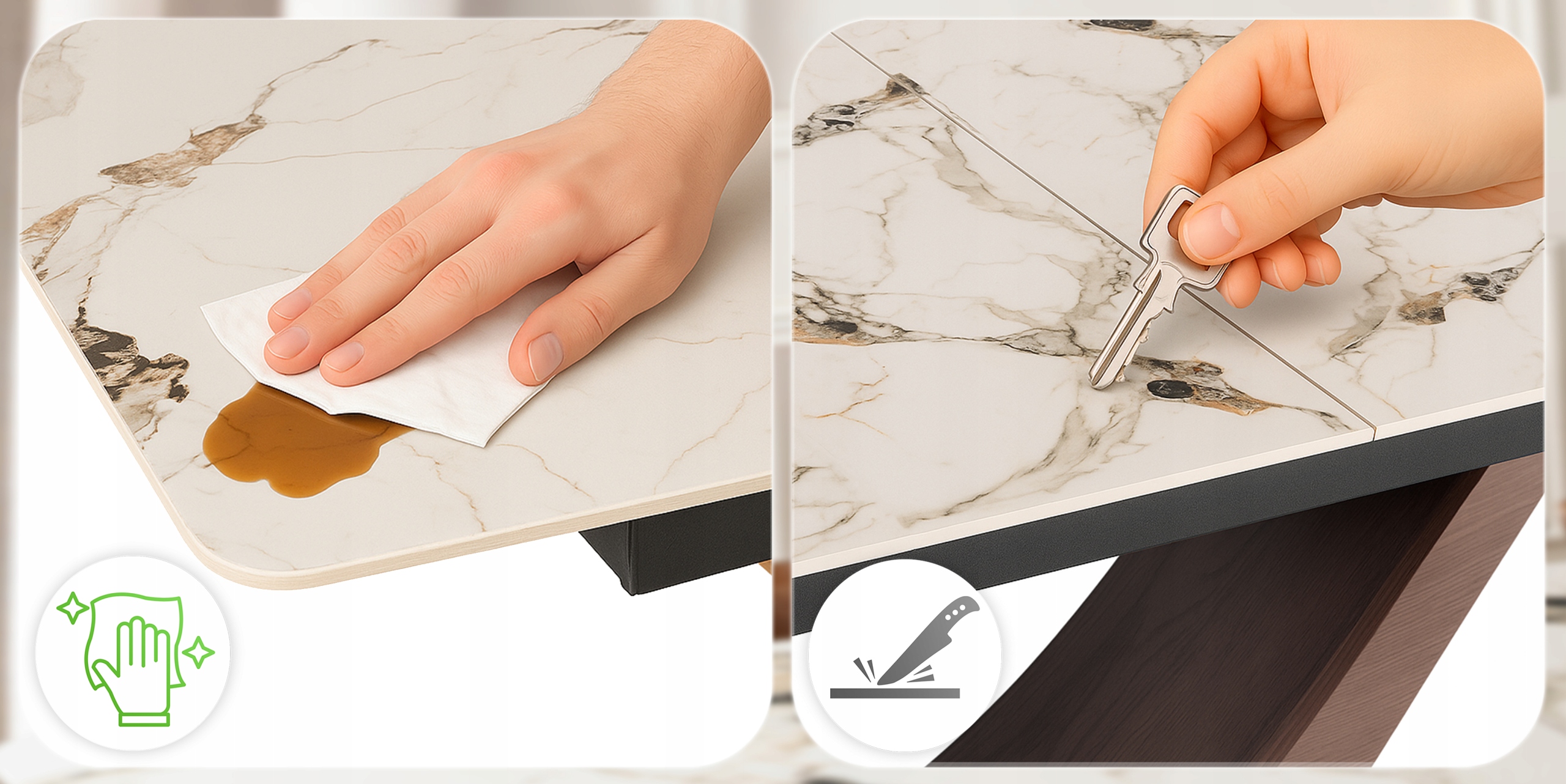 - Odporność na zarysowania - Nasz blat nie boi się codziennych wyzwań – klucze, naczynia, akcesoria kuchenne.