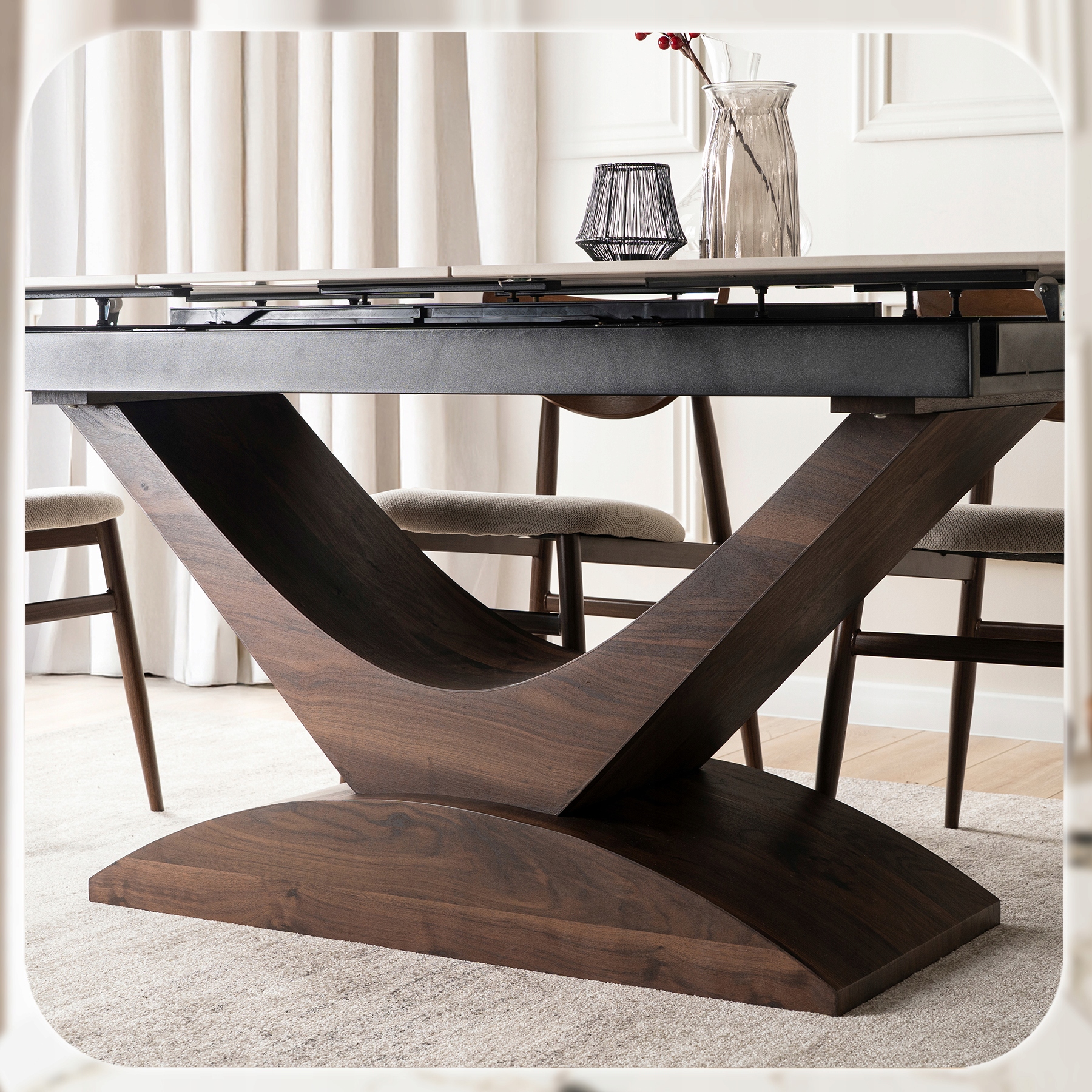 Stabilna podstawa stołu wykonana z tworzywa premium o strukturze drewna w odcieniu orzecha zachwyca naturalnym wyglądem i elegancją. Jej masywna forma gwarantuje solidność konstrukcji, a jednocześnie nadaje meblowi nowoczesny i designerski charakter.