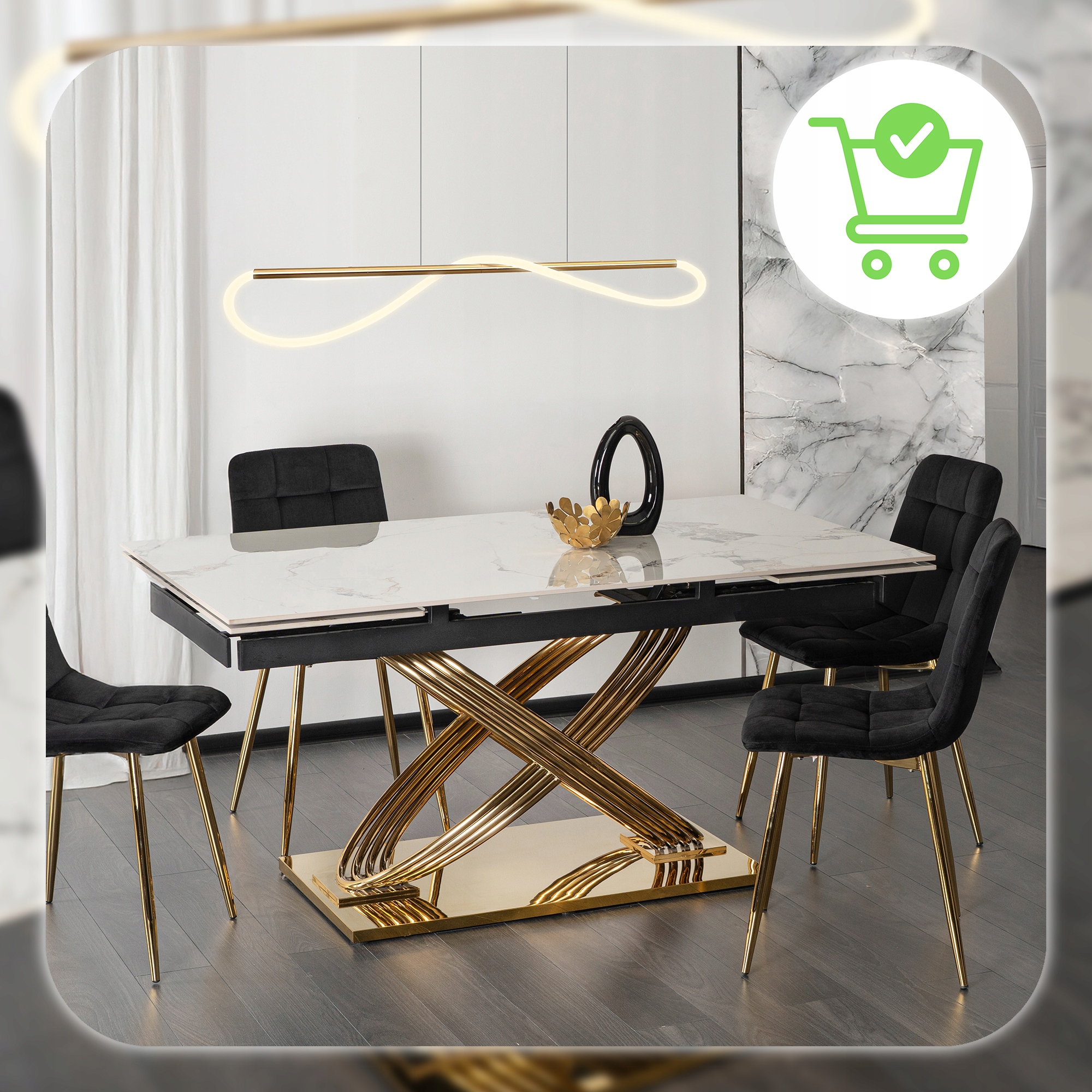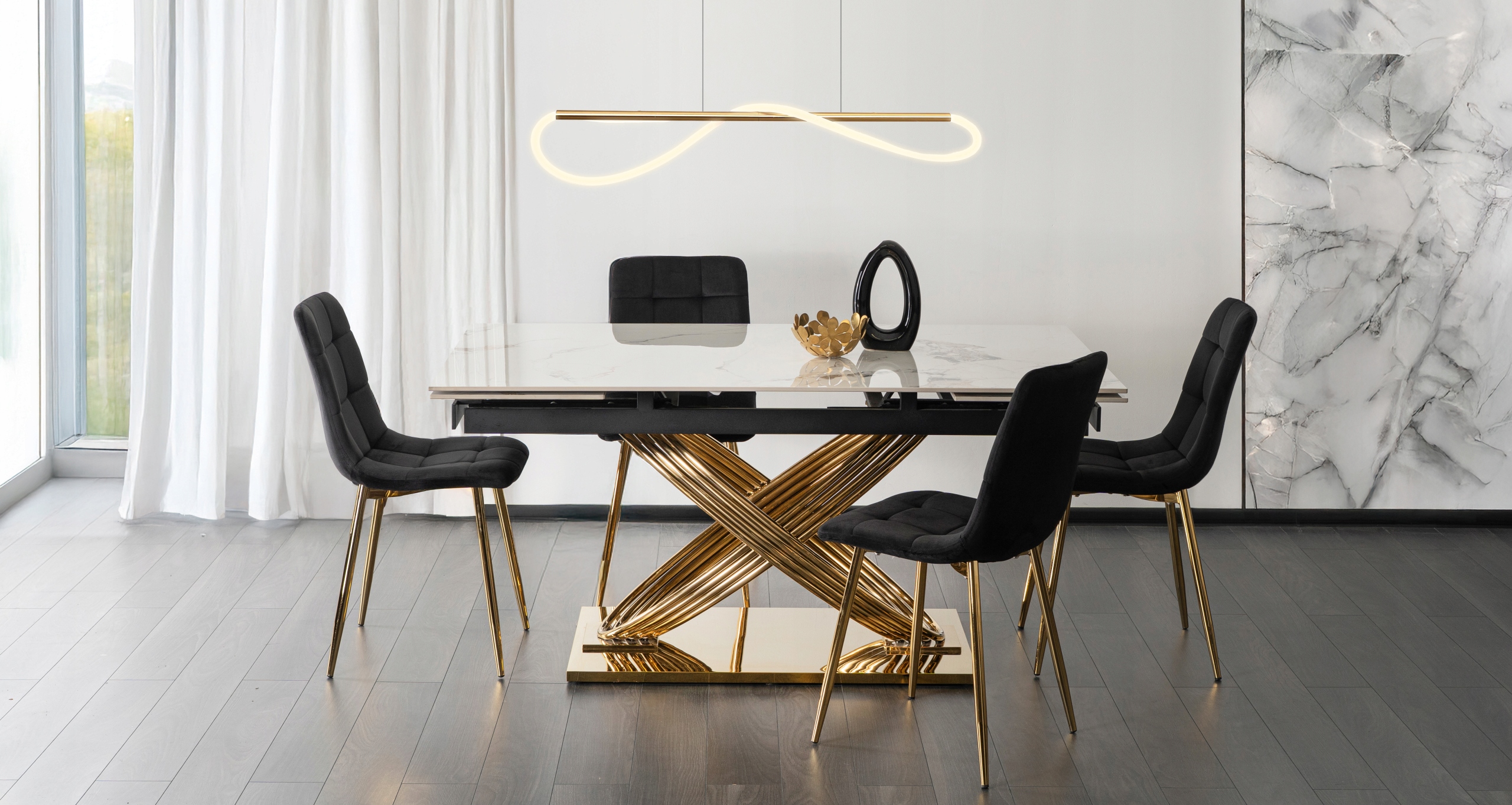 Połączenie złotej podstawy z ceramicznym blatem sprawia, że mebel nabiera wyrafinowanego charakteru, idealnie wpisując się w nowoczesne i glamour aranżacje.