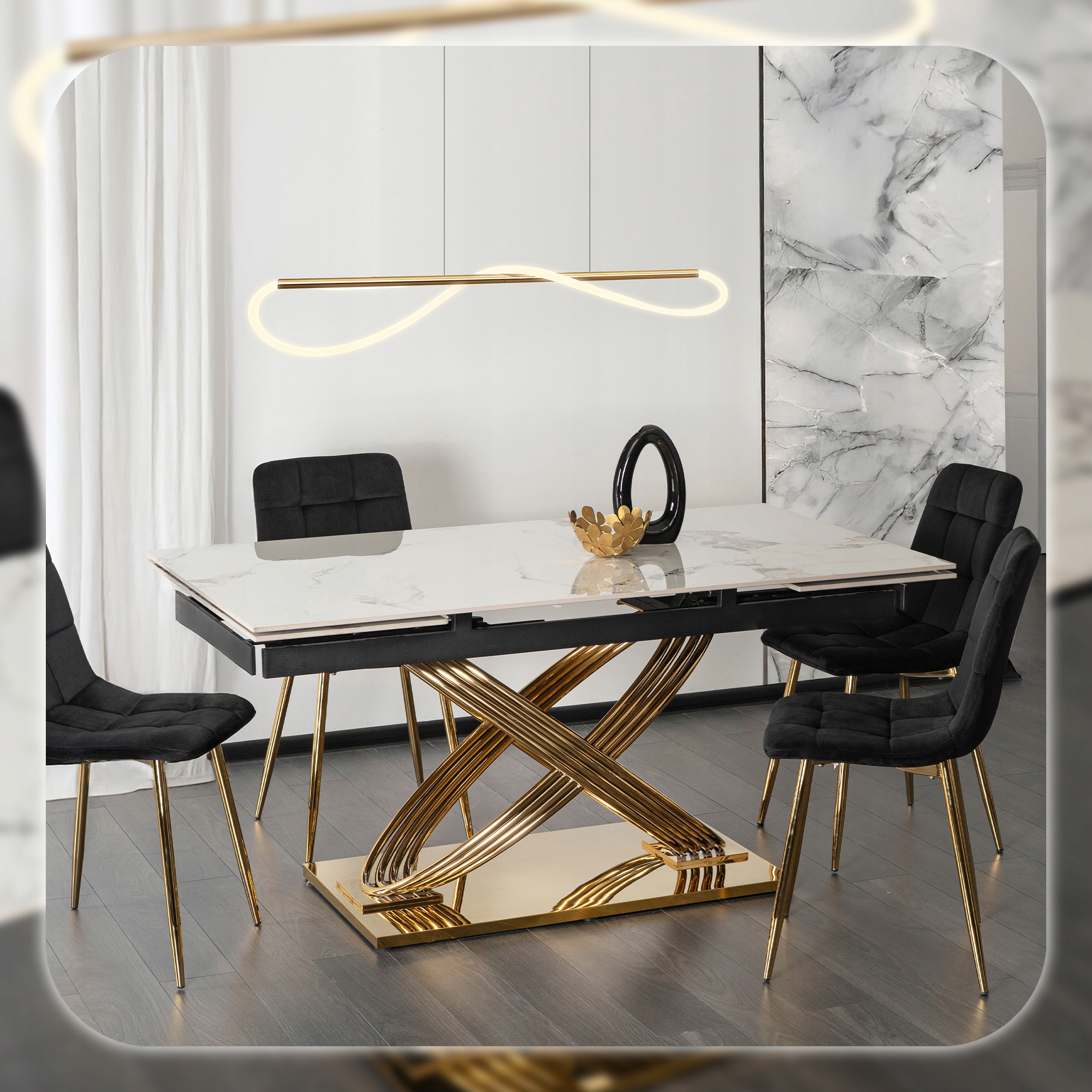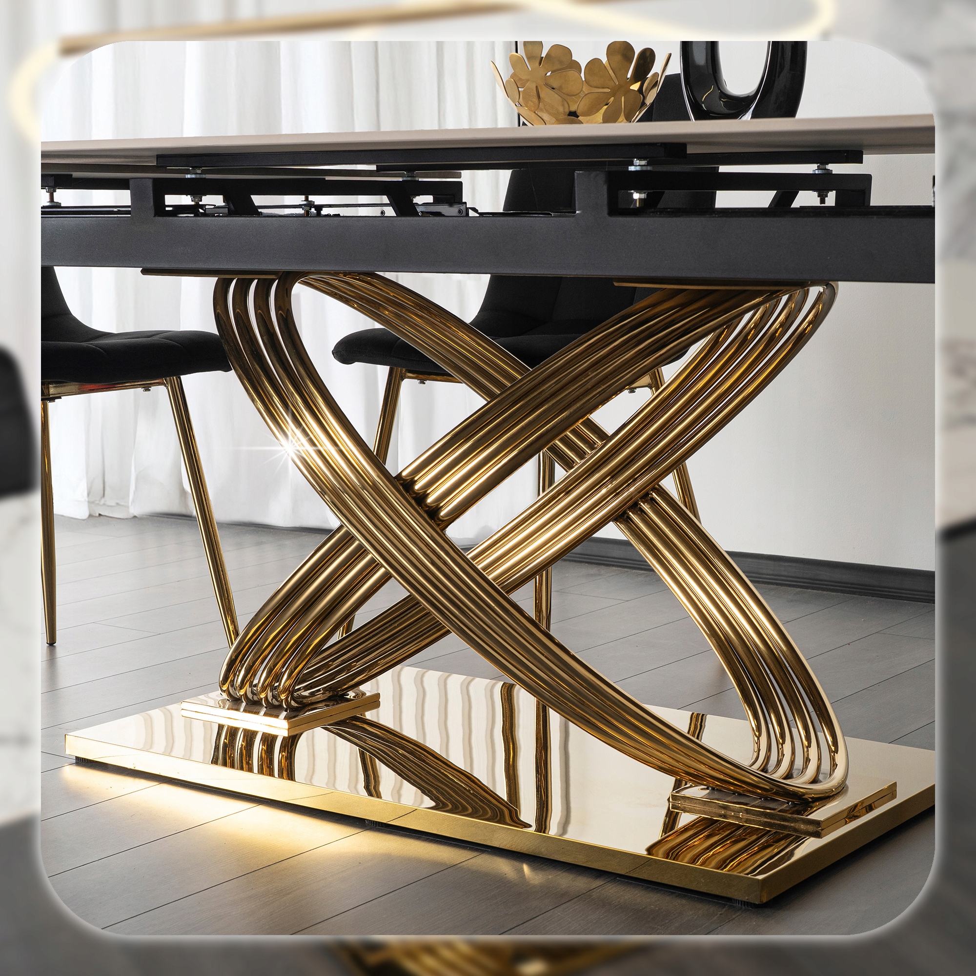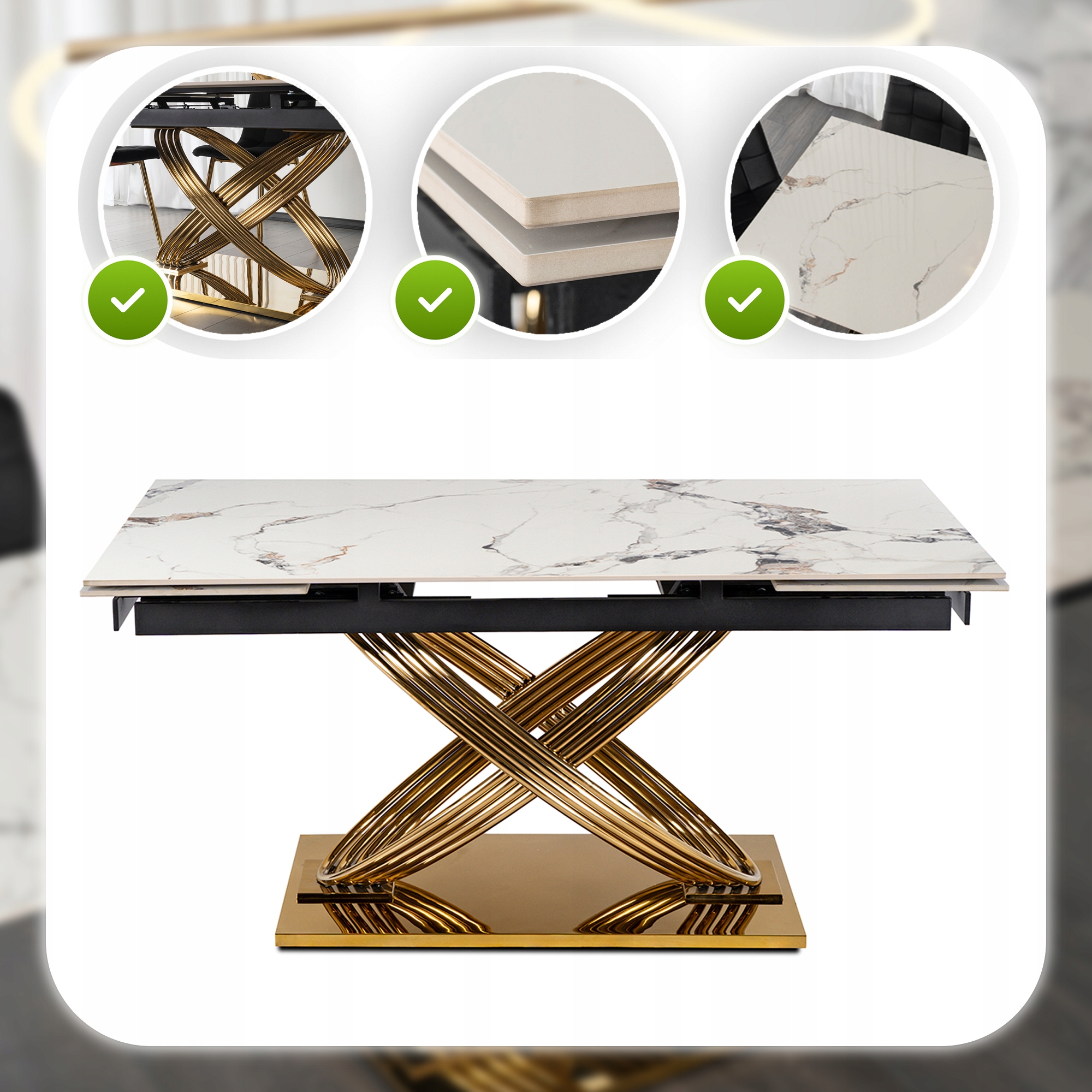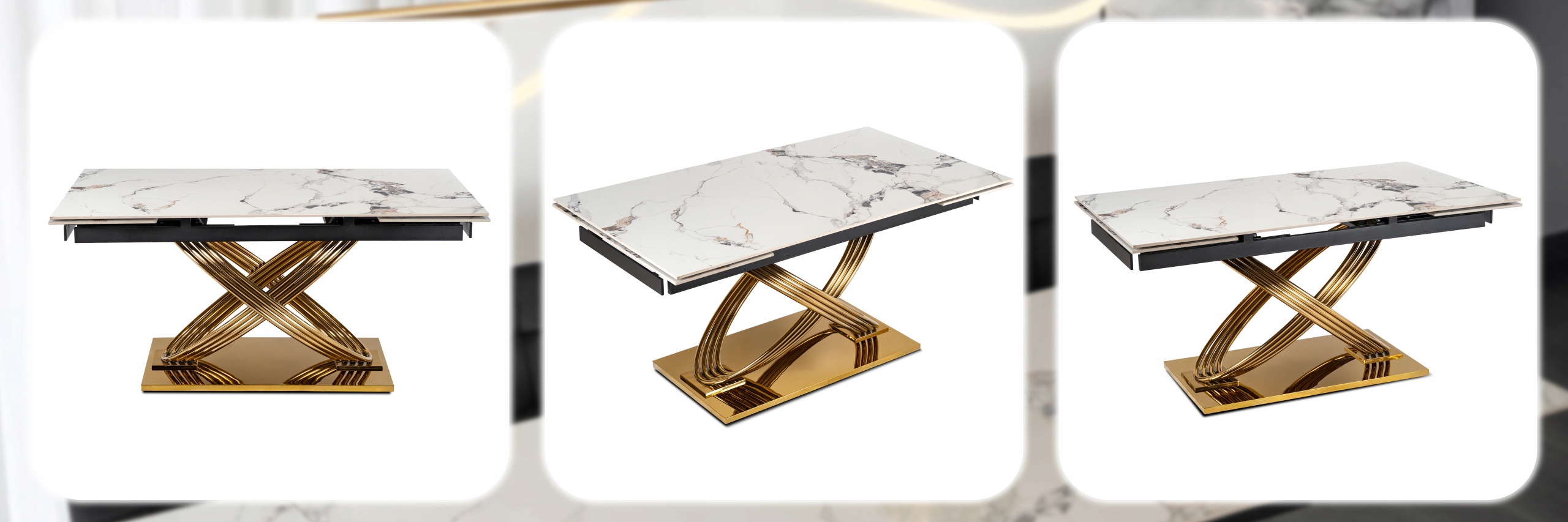 Stylowa podstawa stołu wykonana z wysokiej jakości metalu w eleganckim odcieniu złota to prawdziwa ozdoba wnętrza. Jej nowoczesny, krzyżowy design nie tylko zachwyca wyglądem, ale również zapewnia stabilność i trwałość całej konstrukcji.