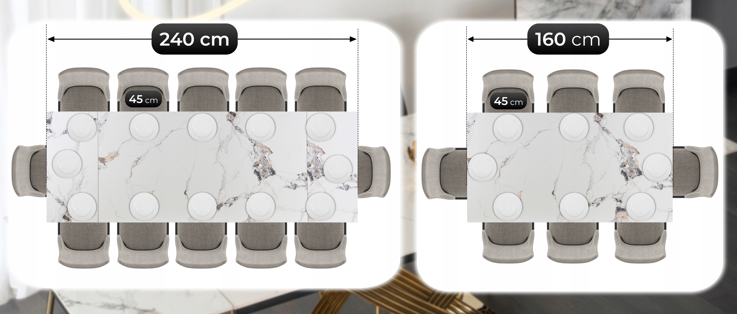 Po rozłożeniu do 240 cm stół pomieści nawet 12 osób, zapewniając każdemu wygodną przestrzeń. To idealne rozwiązanie na święta, przyjęcia i większe spotkania rodzinne.