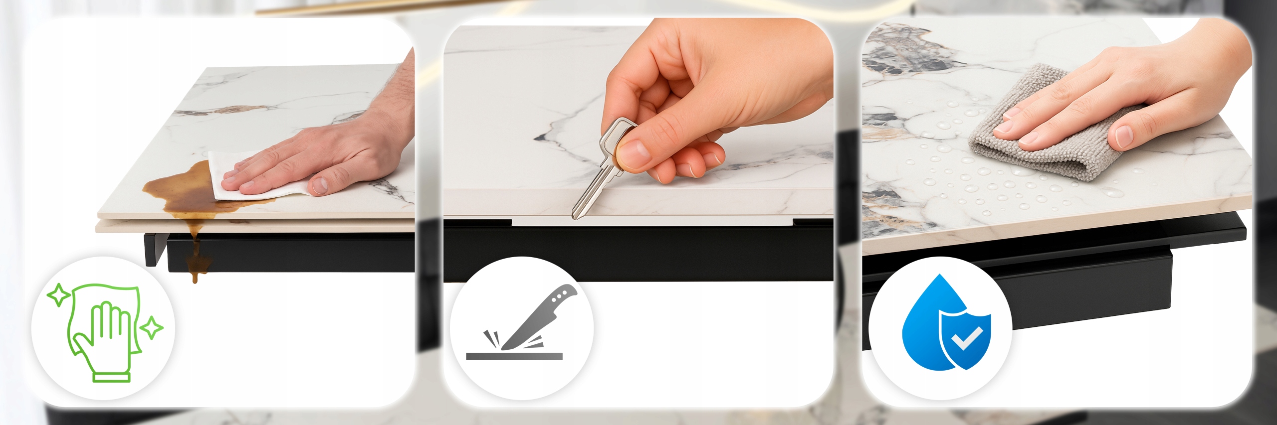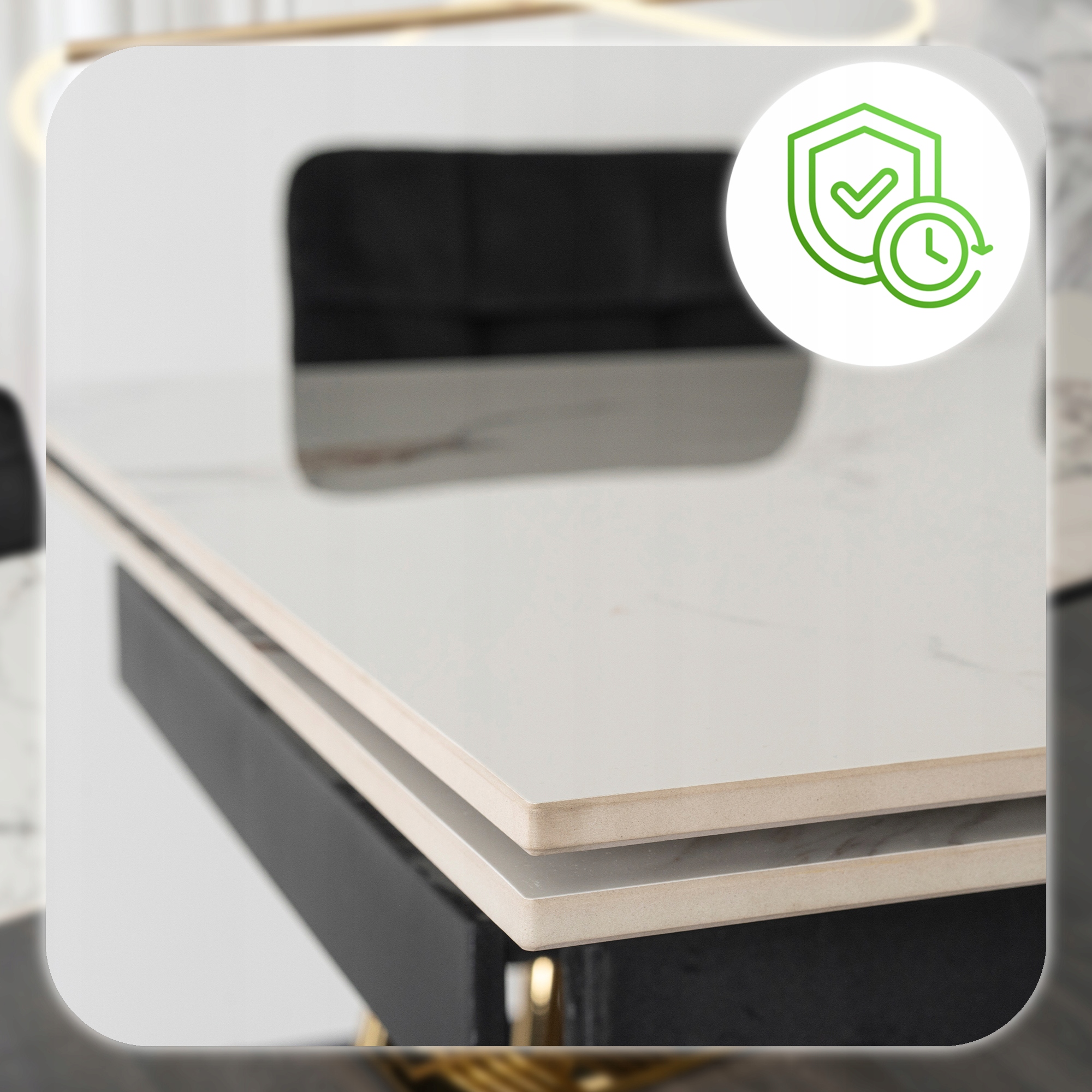 - Ceramika klasy premium – blat stołu jest niezwykle trwały, odporny na zarysowania i wysokie temperatury.