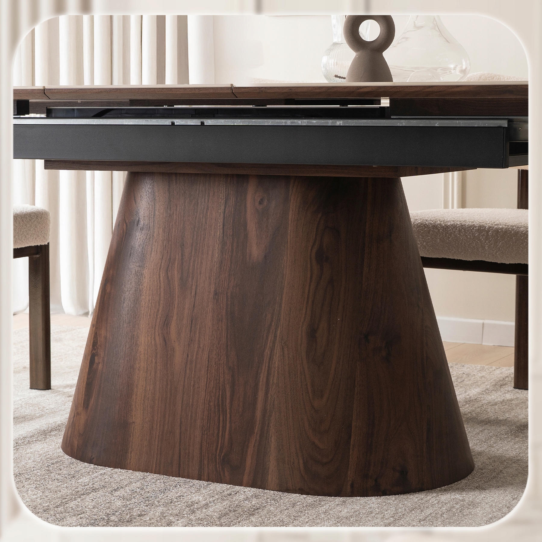 Stabilna podstawa stołu wykonana z tworzywa premium o strukturze drewna w odcieniu orzecha zachwyca naturalnym wyglądem i elegancją. Jej masywna forma gwarantuje solidność konstrukcji, a jednocześnie nadaje meblowi nowoczesny i designerski charakter.