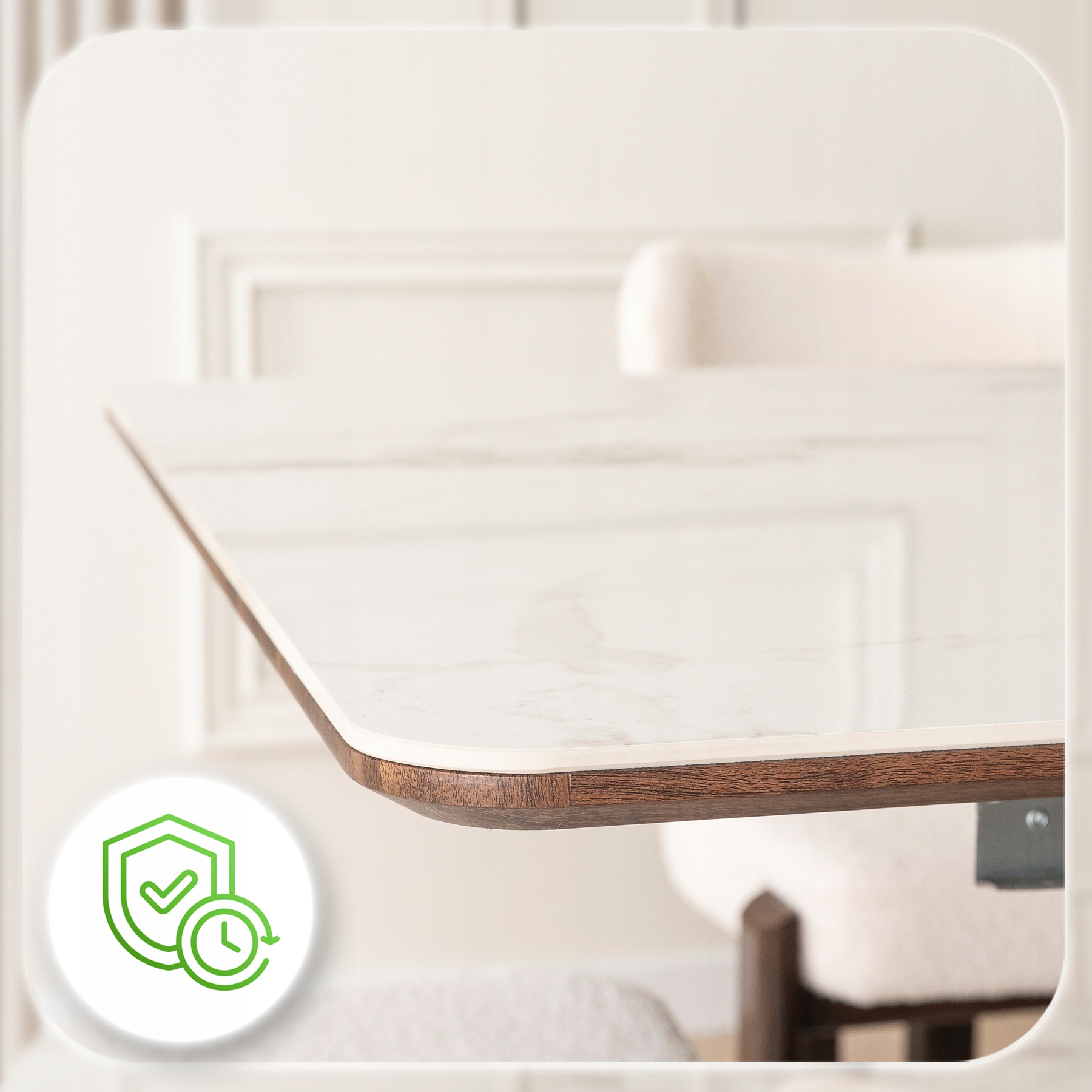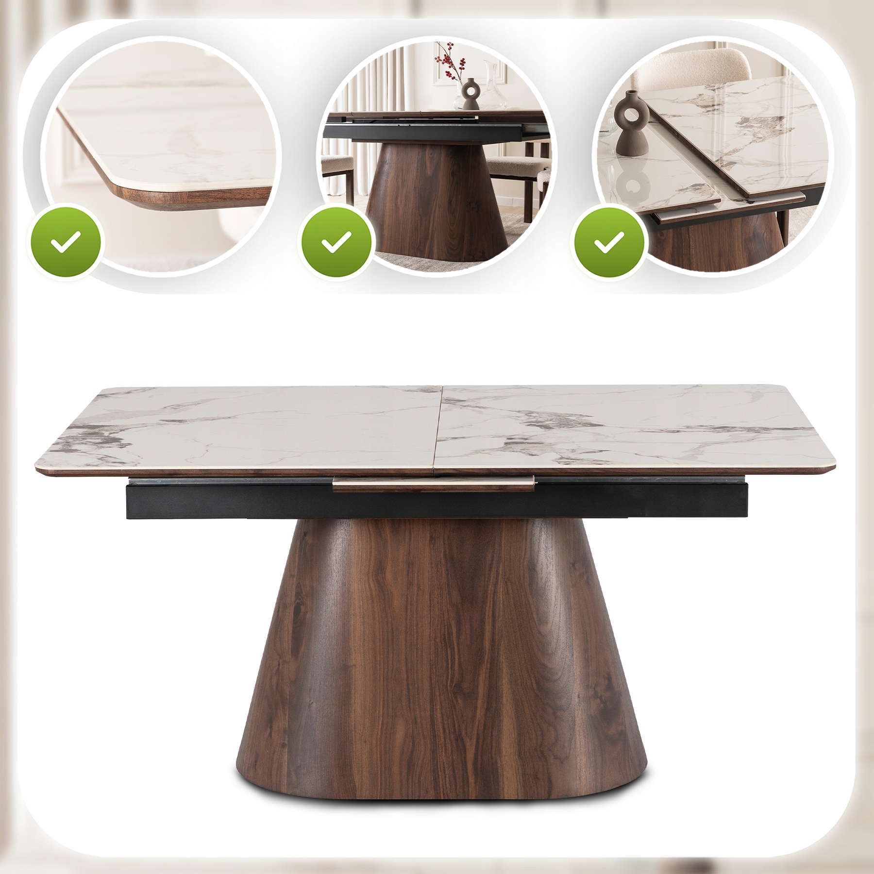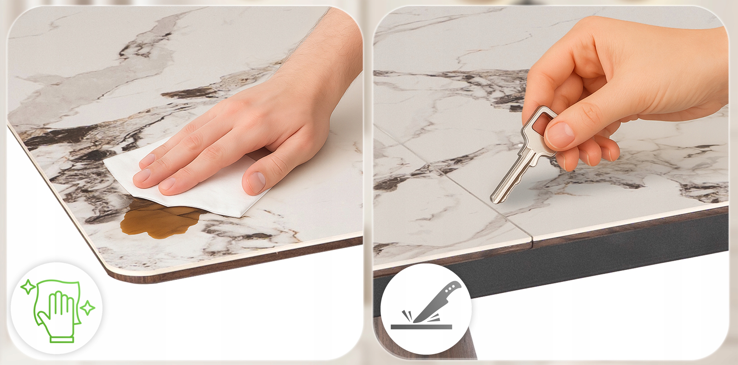 - Ceramika klasy premium – blat stołu jest niezwykle trwały, odporny na zarysowania i wysokie temperatury.