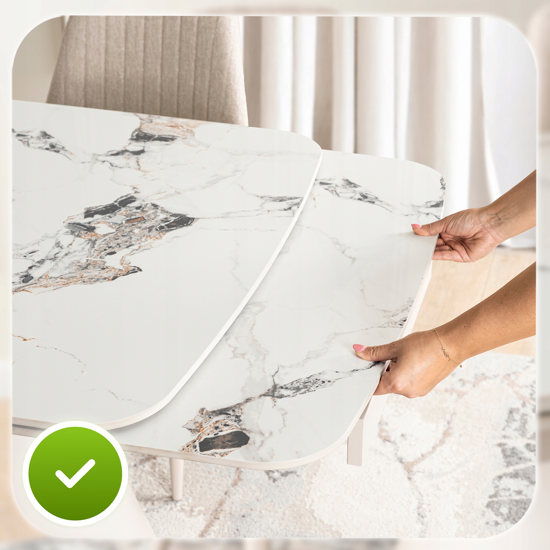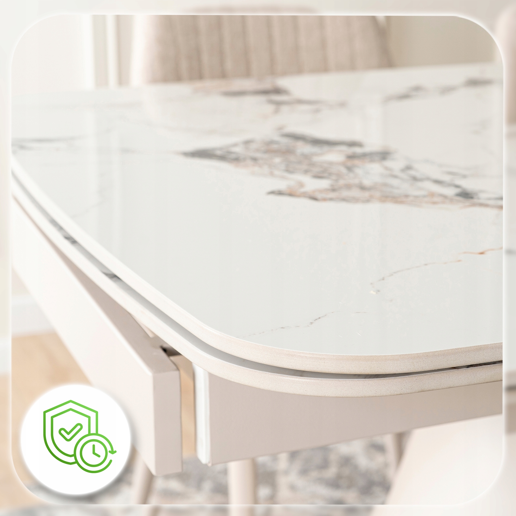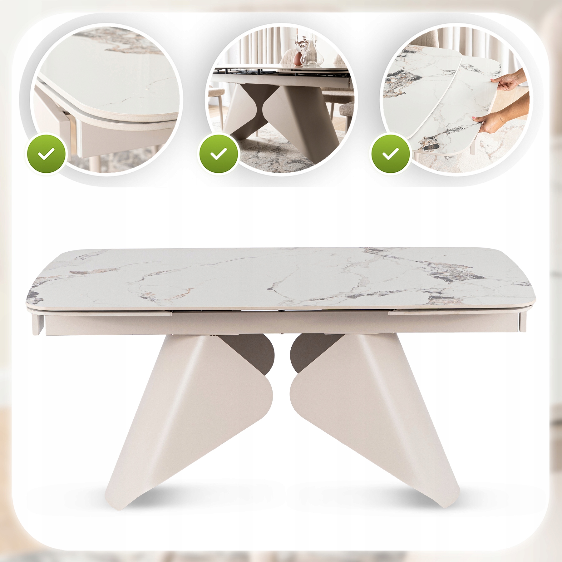 - Ceramika klasy premium – blat stołu jest niezwykle trwały, odporny na zarysowania i wysokie temperatury.