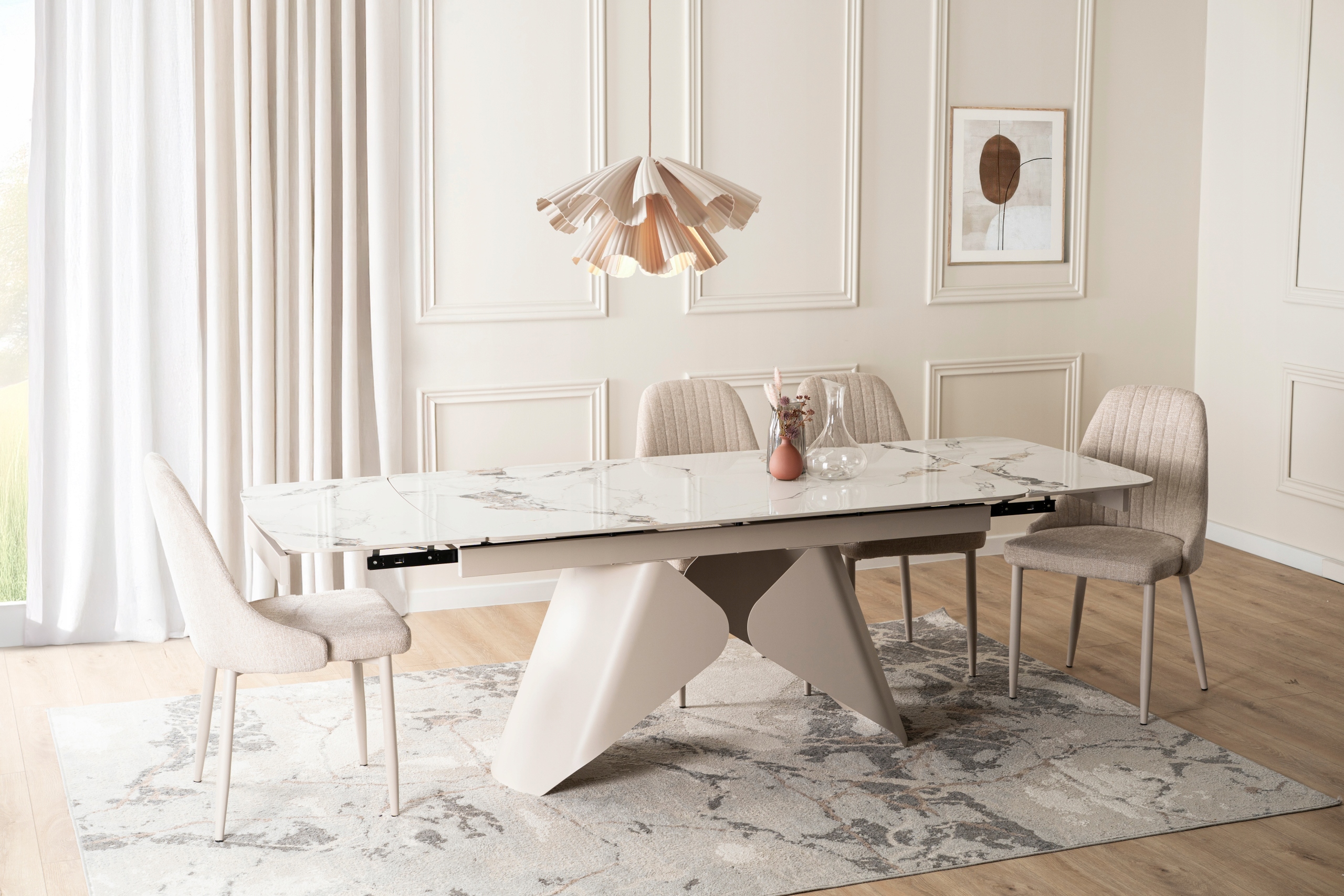 Połączenie kaszmirowej podstawy z białym ceramicznym blatem sprawia, że mebel nabiera wyrafinowanego charakteru, idealnie wpisując się w nowoczesne aranżacje o eleganckim i designerskim stylu.