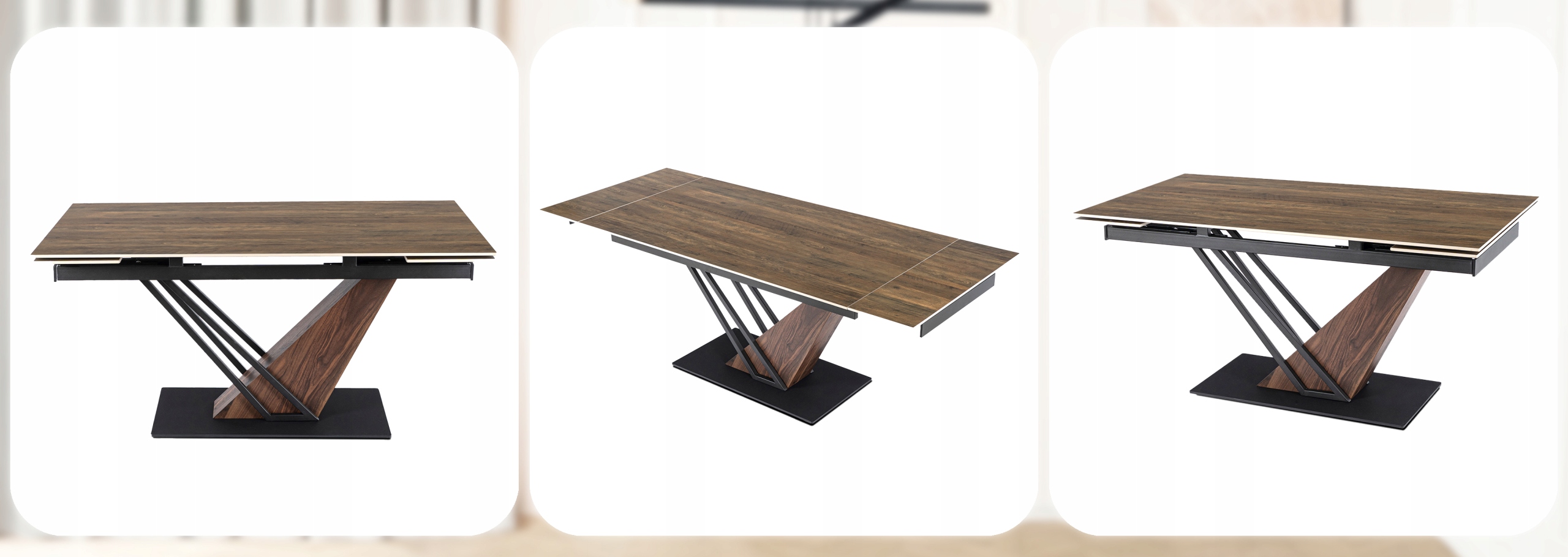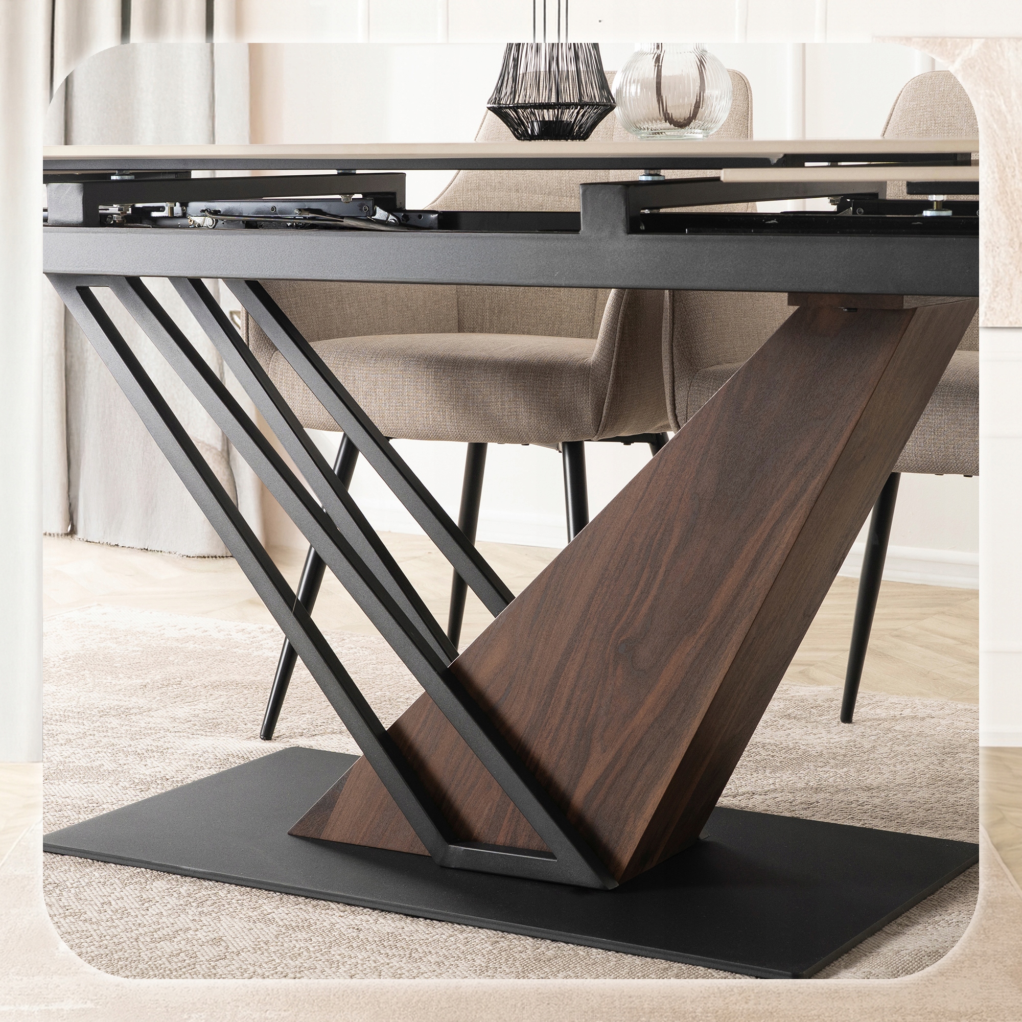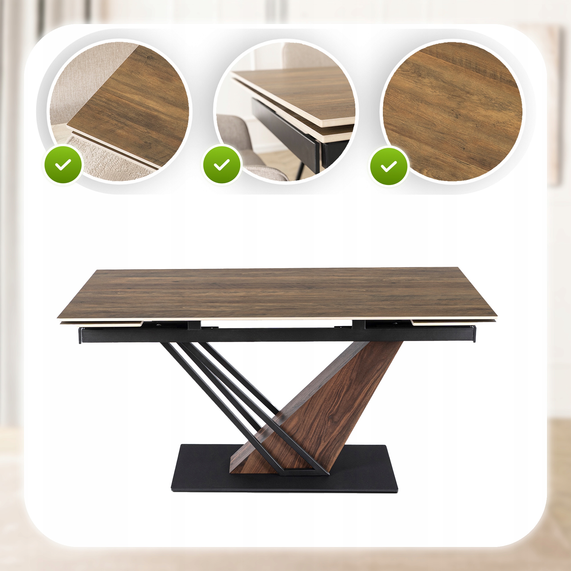 Stylowa podstawa stołu wykonana z wysokiej jakości metalu połączonego z orzechowym wykończeniem w eleganckim odcieniu matowej czerni to prawdziwa ozdoba wnętrza. Jej nowoczesny, geometryczny design nie tylko zachwyca wyglądem, ale również zapewnia stabilność i trwałość całej konstrukcji.