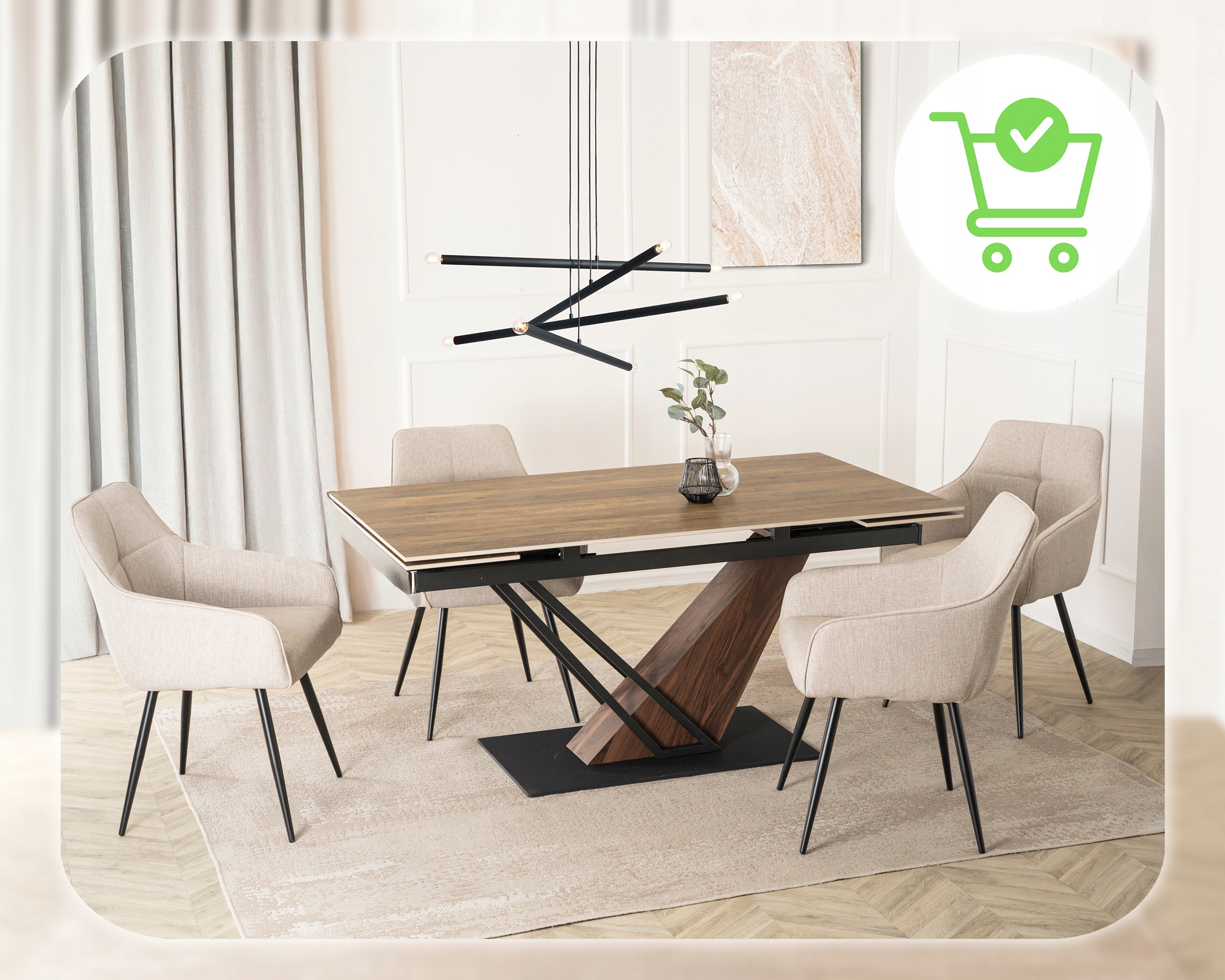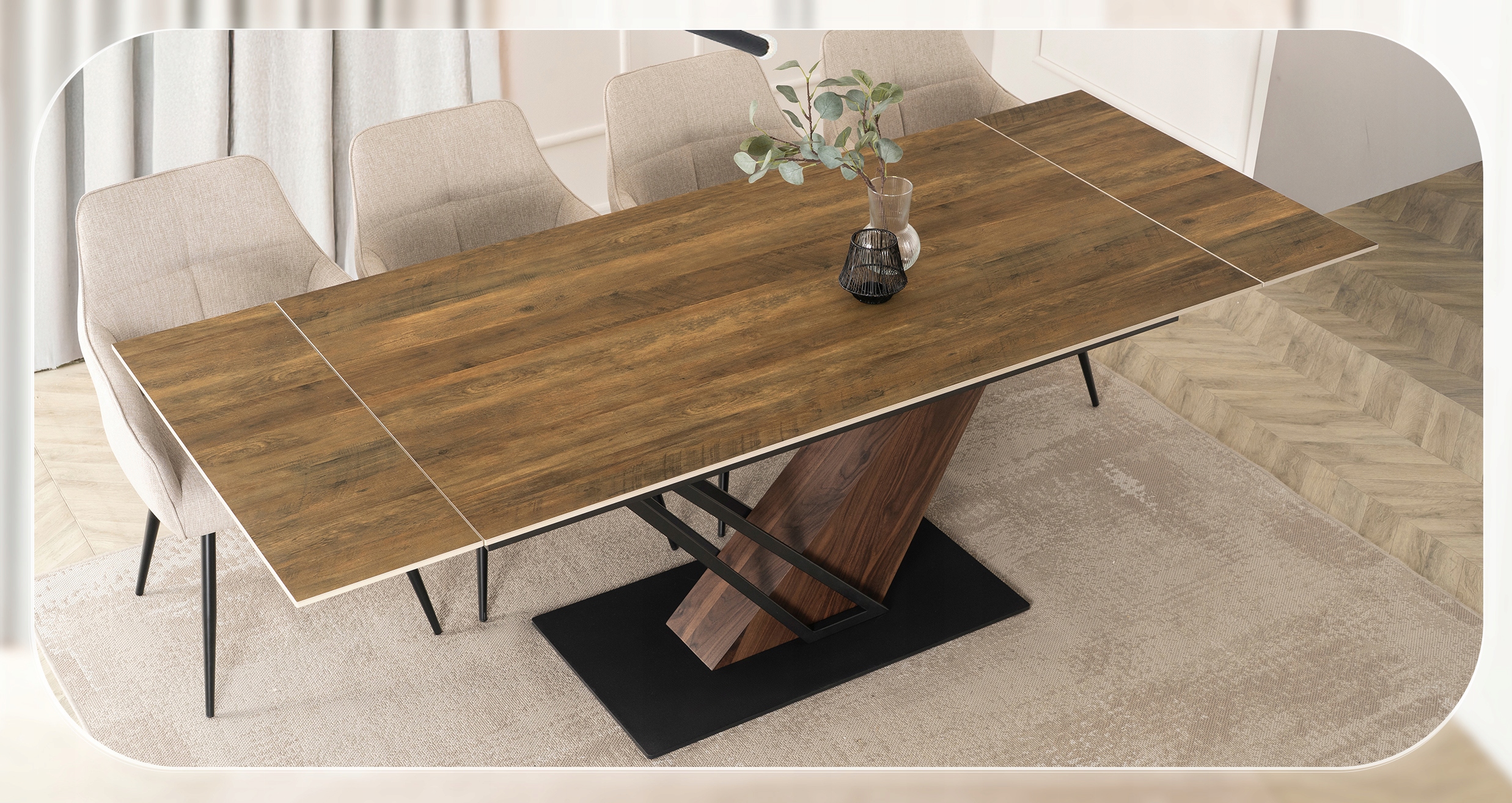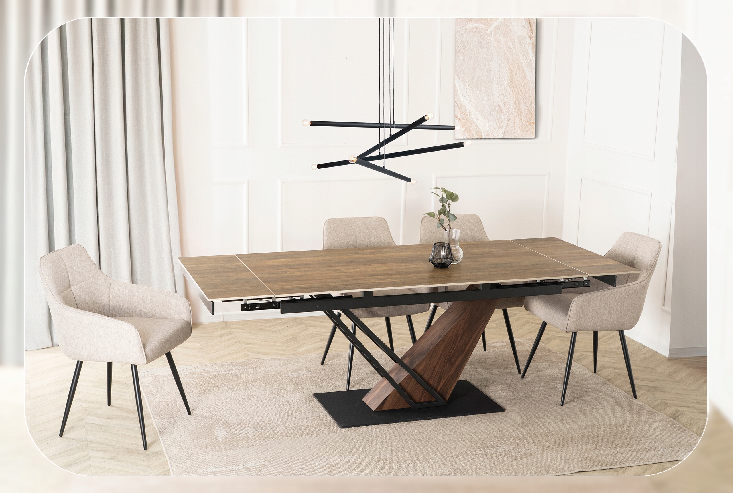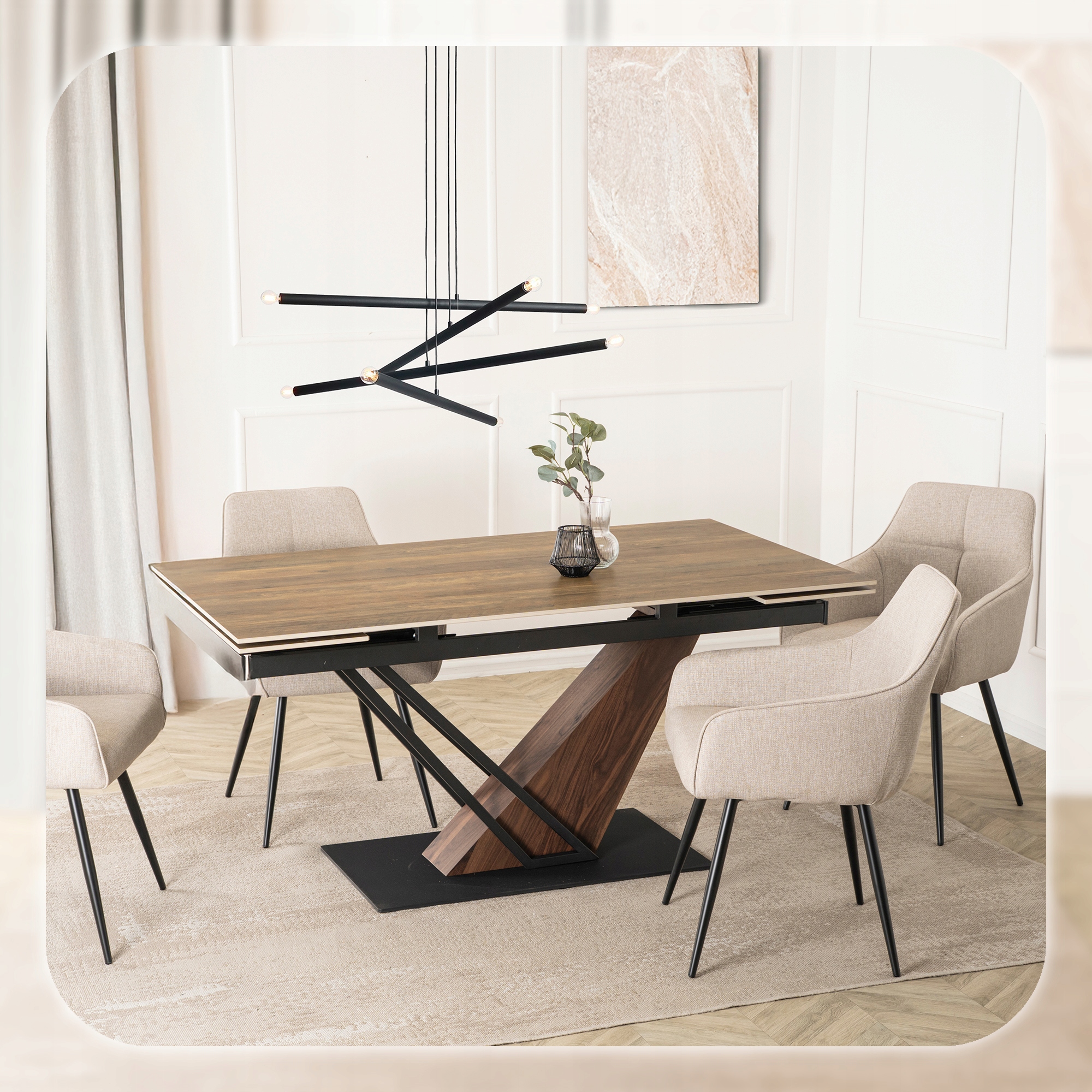 Stylowa podstawa stołu wykonana z wysokiej jakości metalu połączonego z orzechowym wykończeniem w eleganckim odcieniu matowej czerni to prawdziwa ozdoba wnętrza. Jej nowoczesny, geometryczny design nie tylko zachwyca wyglądem, ale również zapewnia stabilność i trwałość całej konstrukcji.