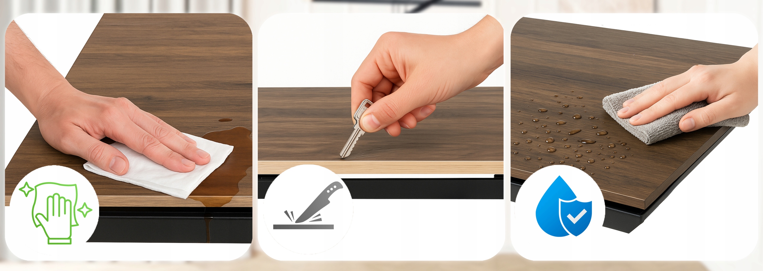 - Odporność na zarysowania - Nasz blat nie boi się codziennych wyzwań – klucze, naczynia, akcesoria kuchenne.