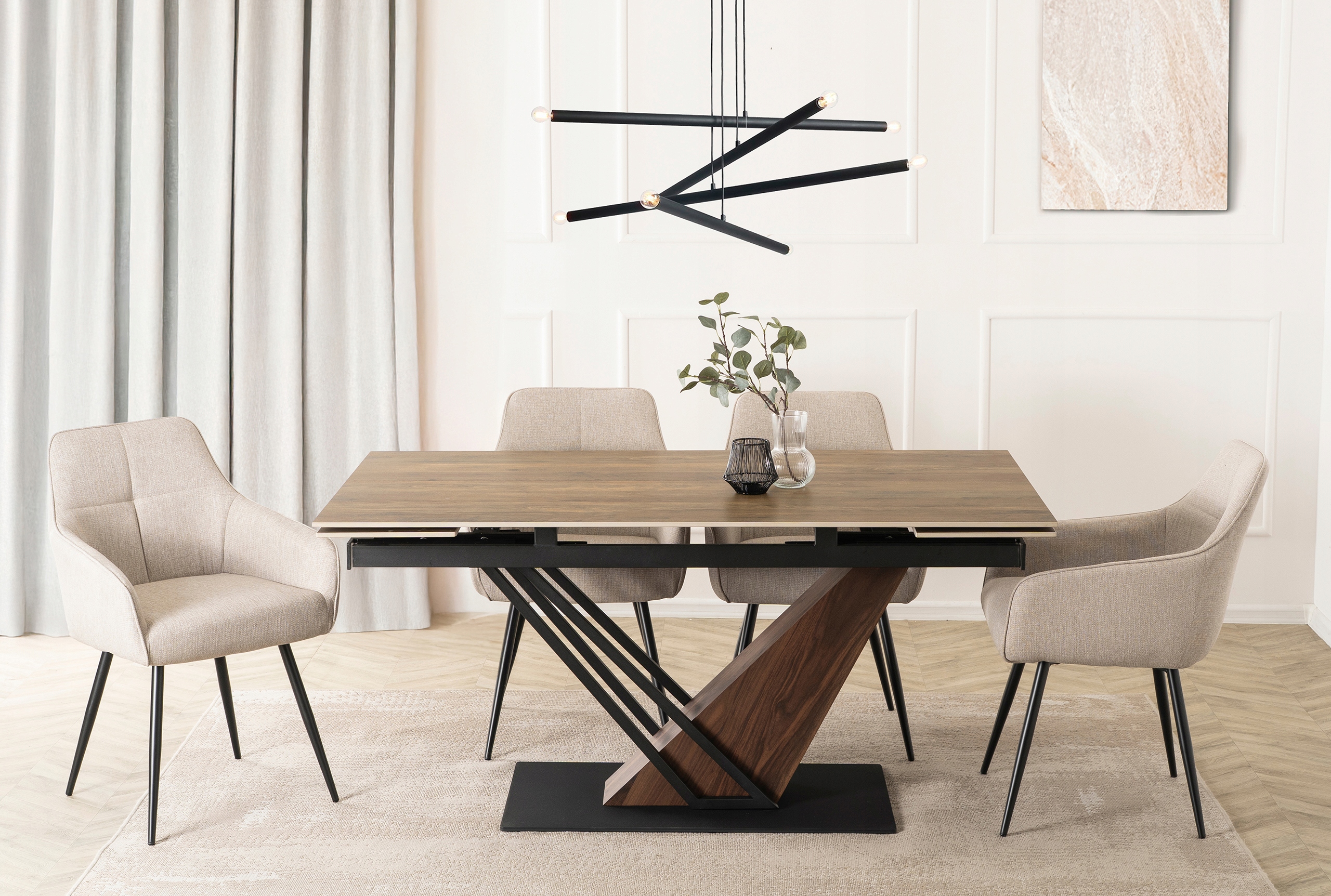 - Mechanizm rozkładania do 220 cm – stół wyposażono w dwie dyskretnie ukryte wkładki, które płynnie wysuwają się na prowadnicach po obu stronach blatu.