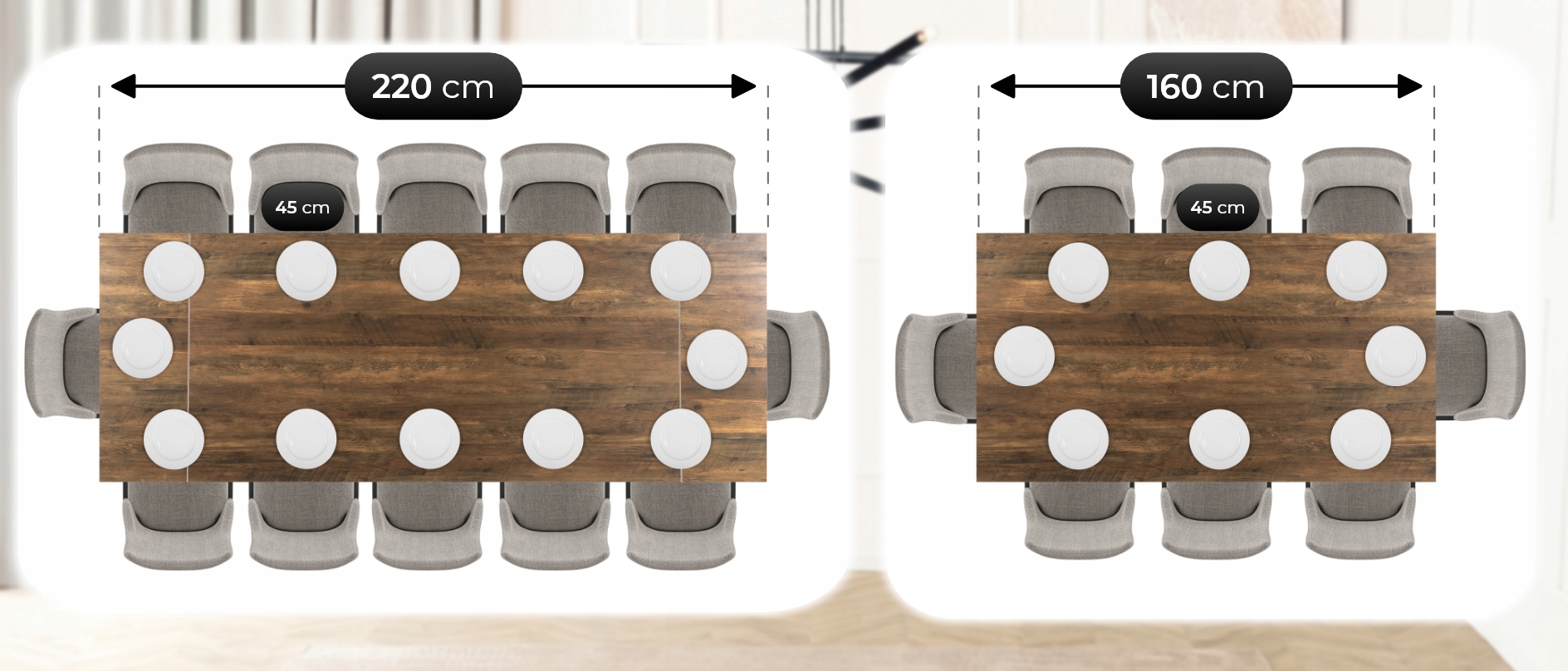 Po rozłożeniu do 220 cm stół pomieści nawet 12 osób, zapewniając każdemu wygodną przestrzeń. To idealne rozwiązanie na święta, przyjęcia i większe spotkania rodzinne.