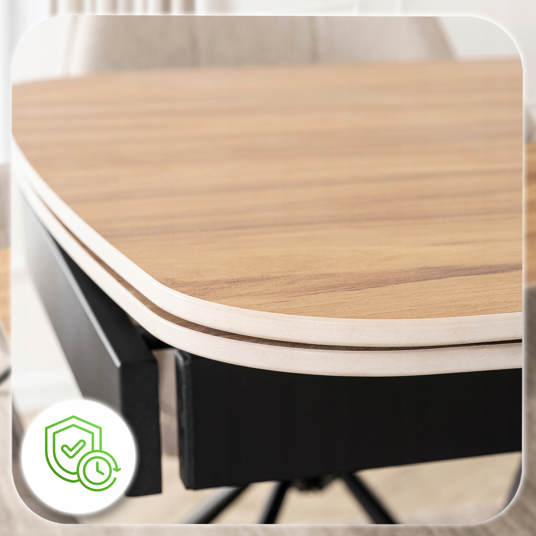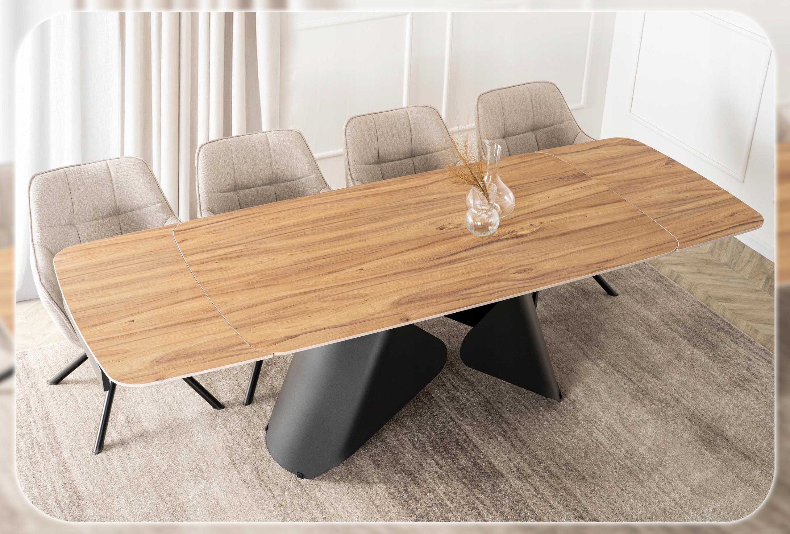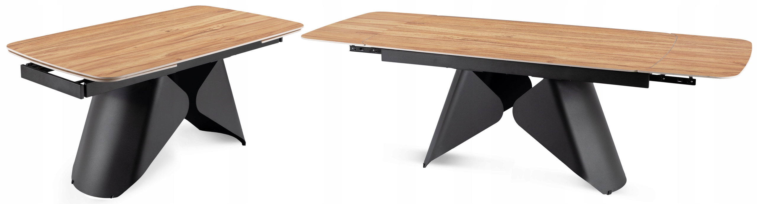- Mechanizm rozkładania do 240 cm – stół wyposażono w dwie dyskretnie ukryte wkładki, które płynnie wysuwają się na prowadnicach po obu stronach blatu.