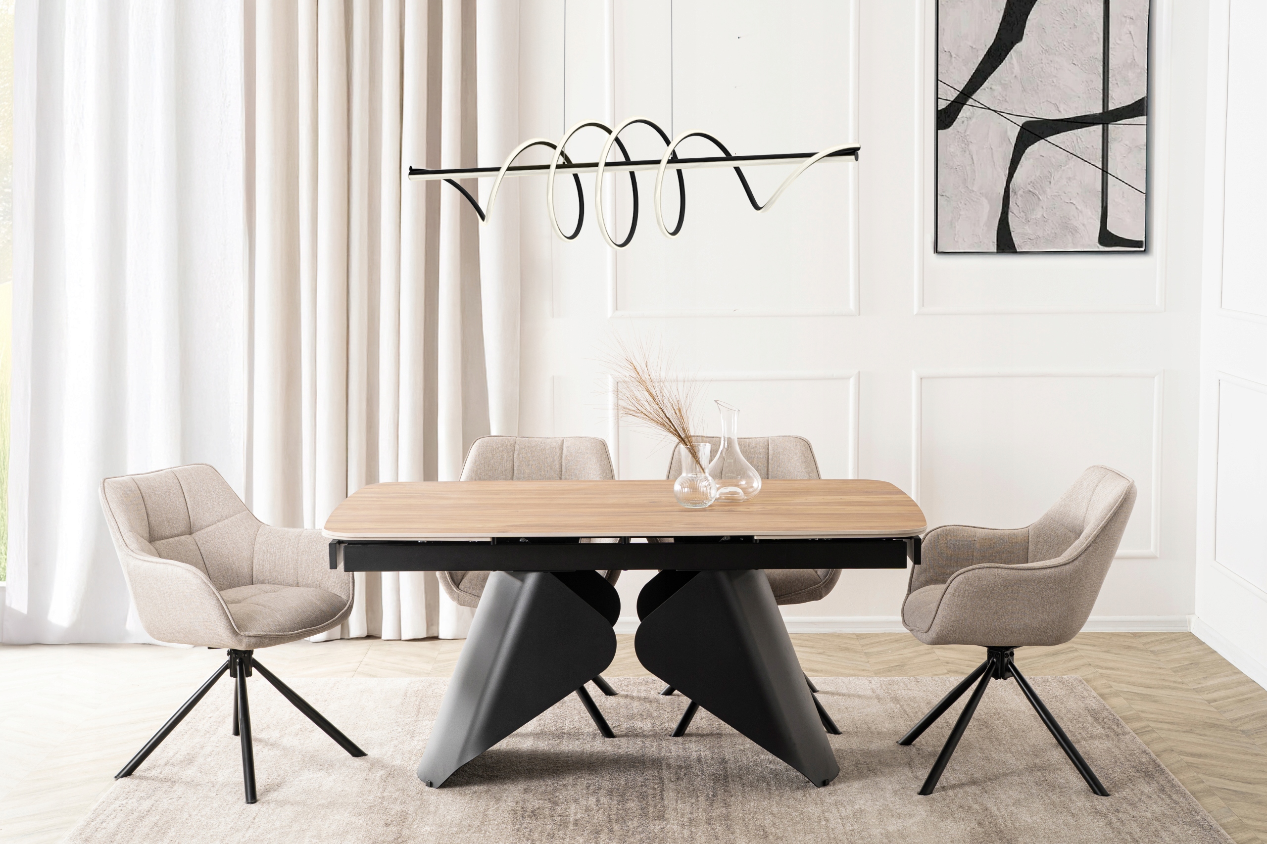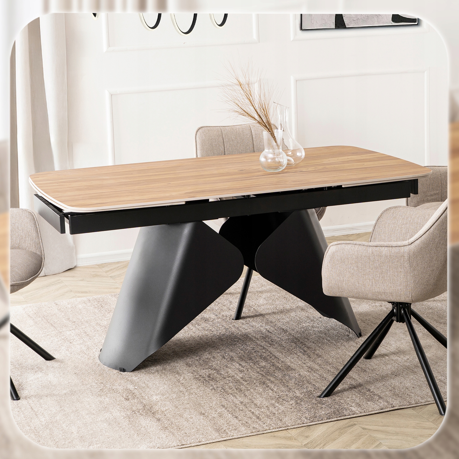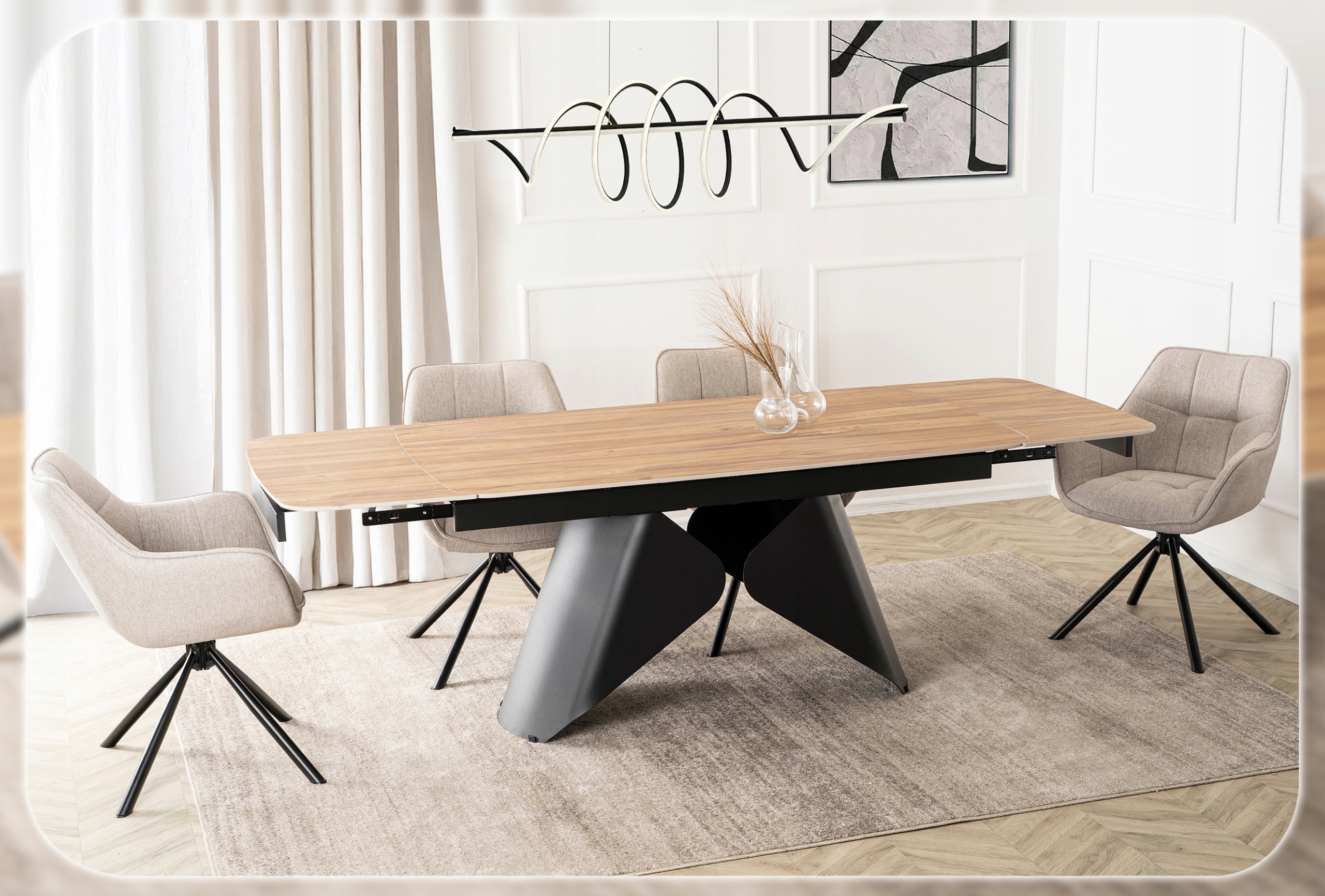 - Mechanizm rozkładania do 240 cm – stół wyposażono w dwie dyskretnie ukryte wkładki, które płynnie wysuwają się na prowadnicach po obu stronach blatu.