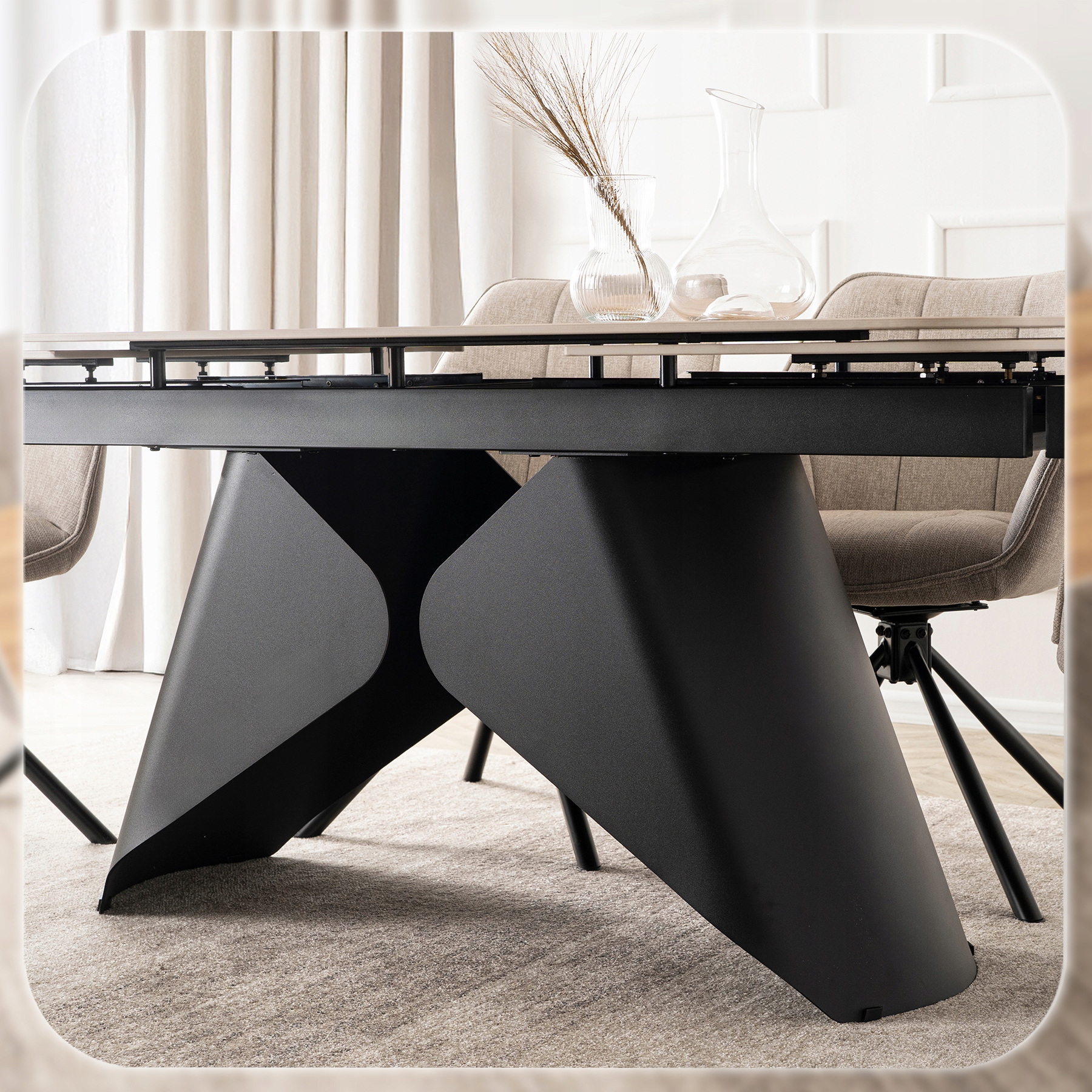 Stylowa podstawa stołu wykonana z wysokiej jakości metalu w kolorze czarnym. Jej nowoczesny, geometryczny design nie tylko zachwyca wyglądem, ale również zapewnia stabilność i trwałość całej konstrukcji.